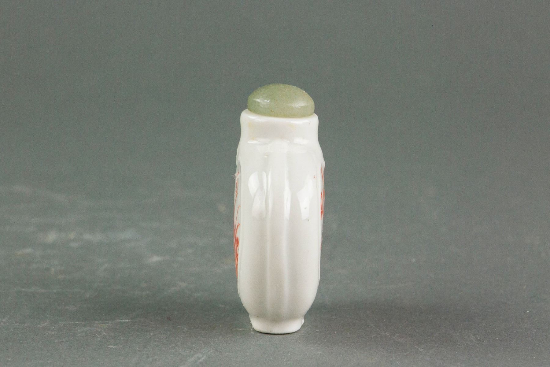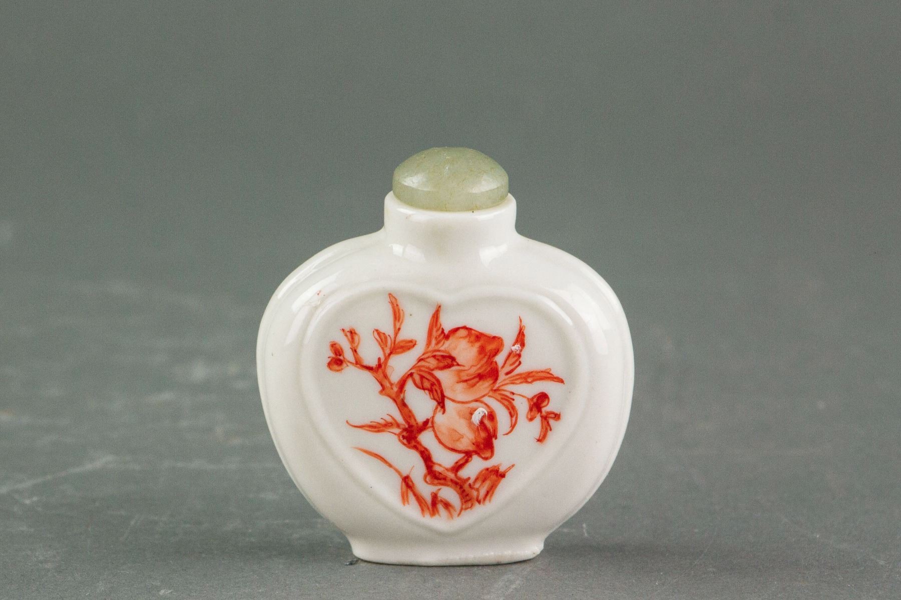 Chinese fine copper red porcelain snuff bottle; of heart shape body; with a hardstone cap; painted with longevity peach, lingzhi and bats; with 5.5 cm x 5 cm, 46 grams