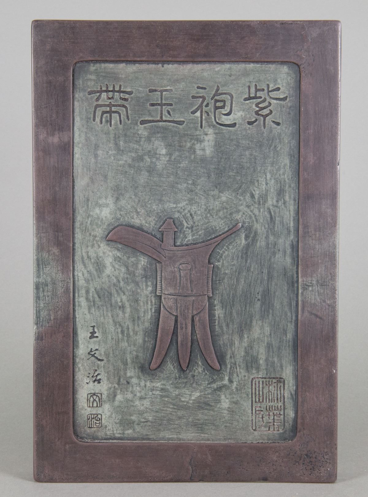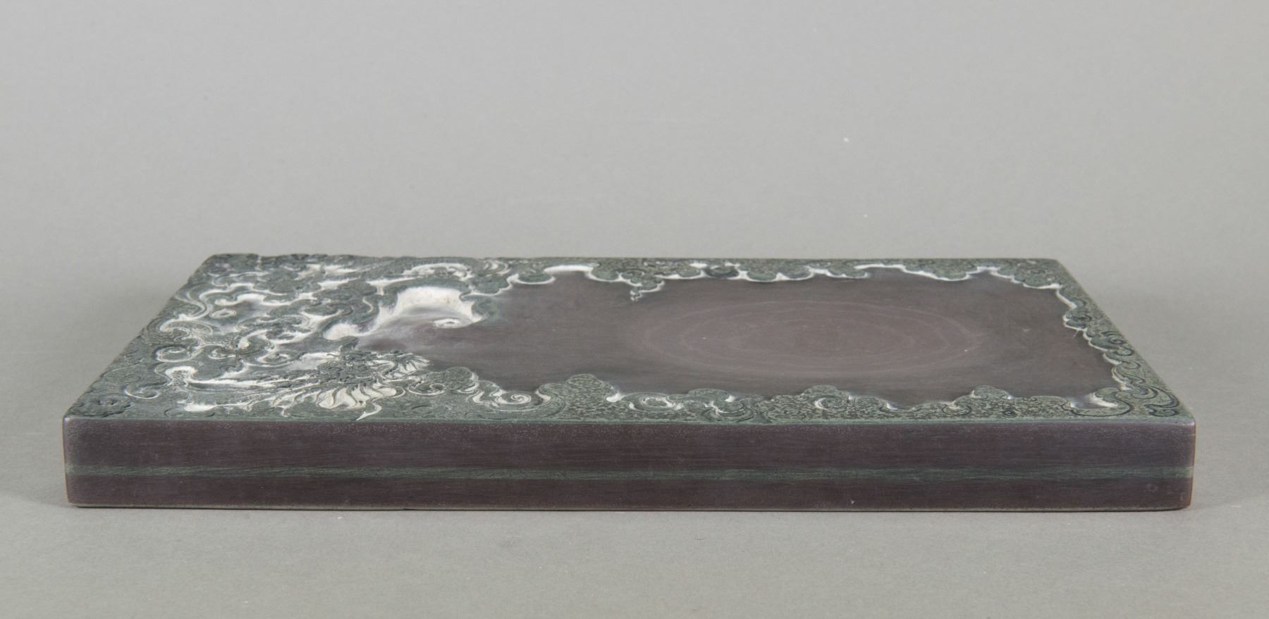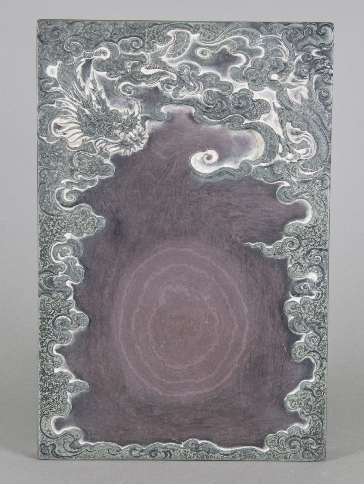 Chinese fine dragon inkstone; featuring dragon and clouds on front, archaistic wine cup on back with artist signature; signed Wang Wen Zhi (1730-1802); H: 3 cm, W: 22 cm, L:33 cm, 6 kg