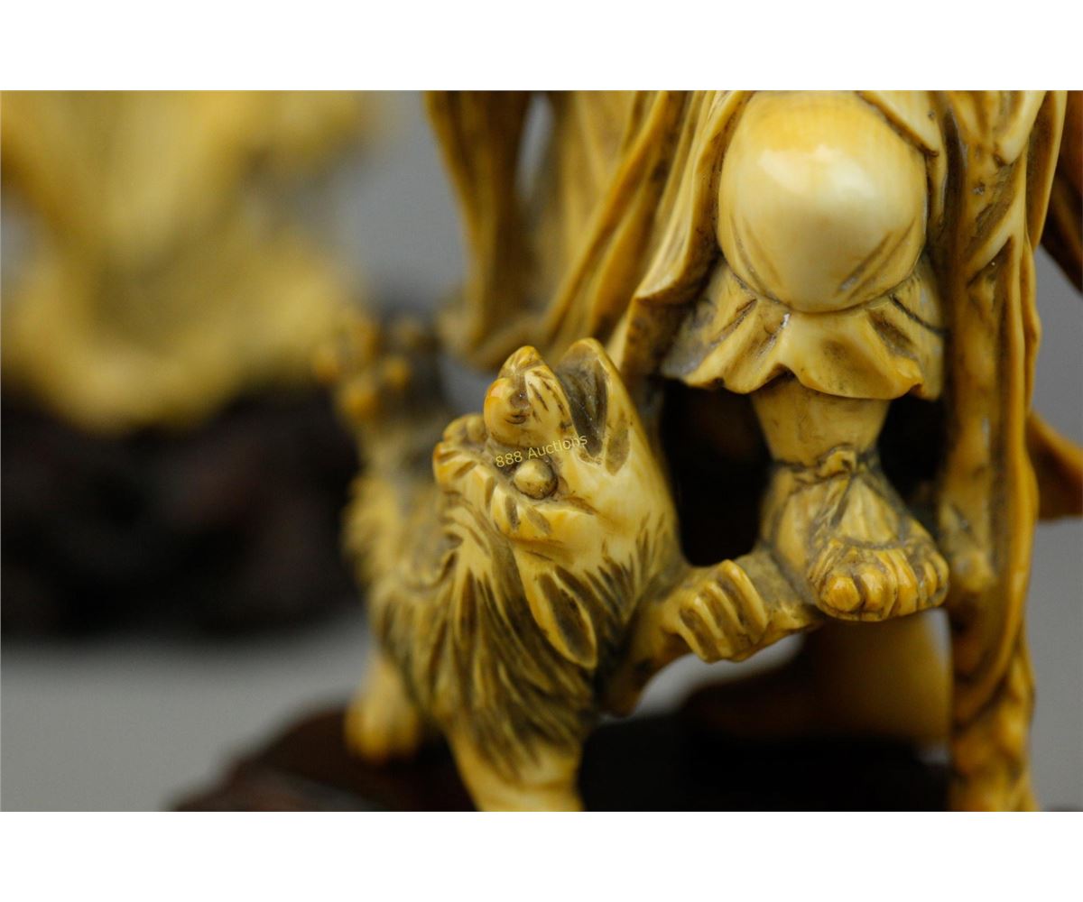 Eight pieces of Chinese fine carved ivory figures; featuring eight immortals with their power tools, each figure accompanied with a beast; custom carved wood stand included; H: 13 cm, W: 8 cm, 1482 grams