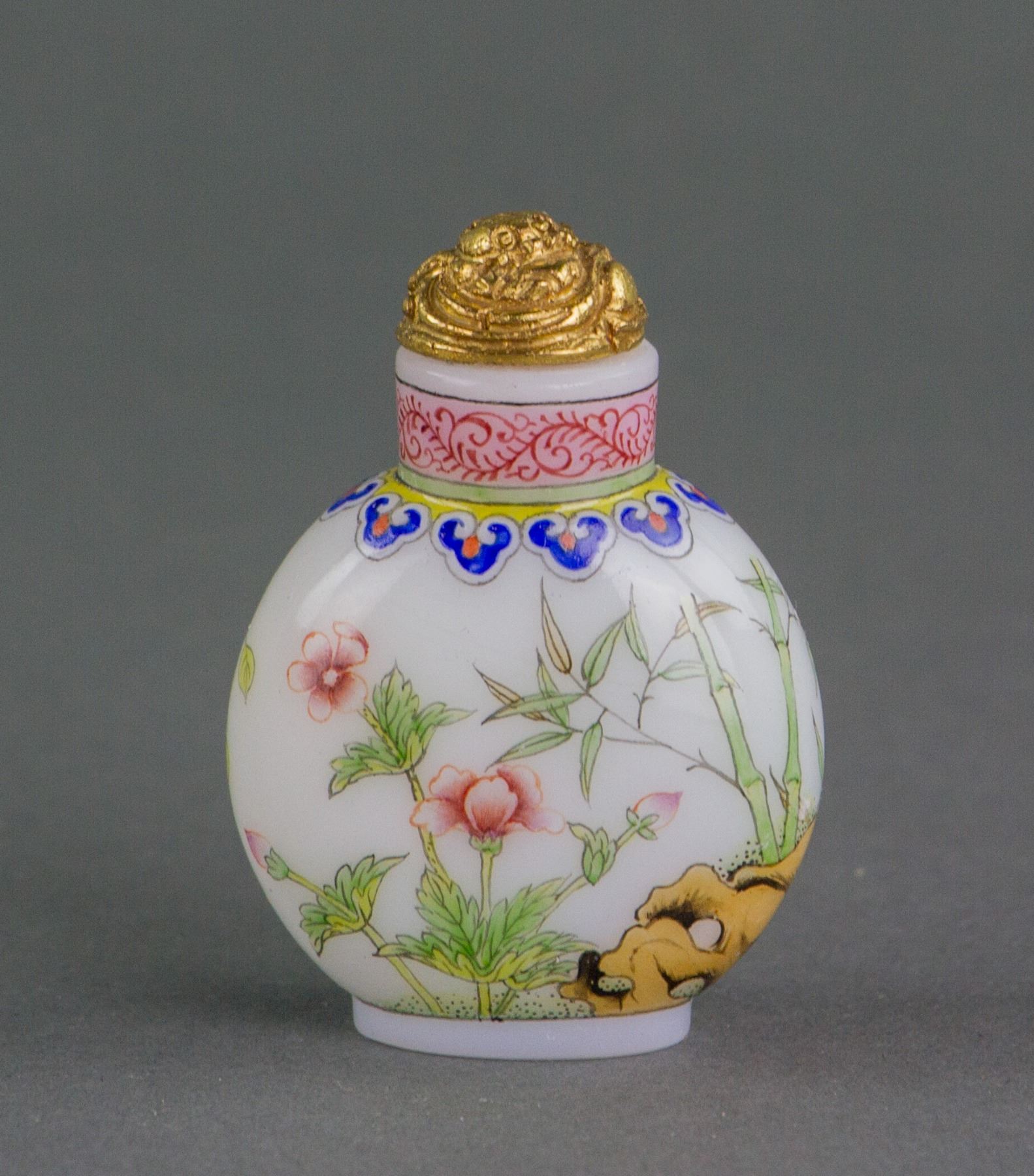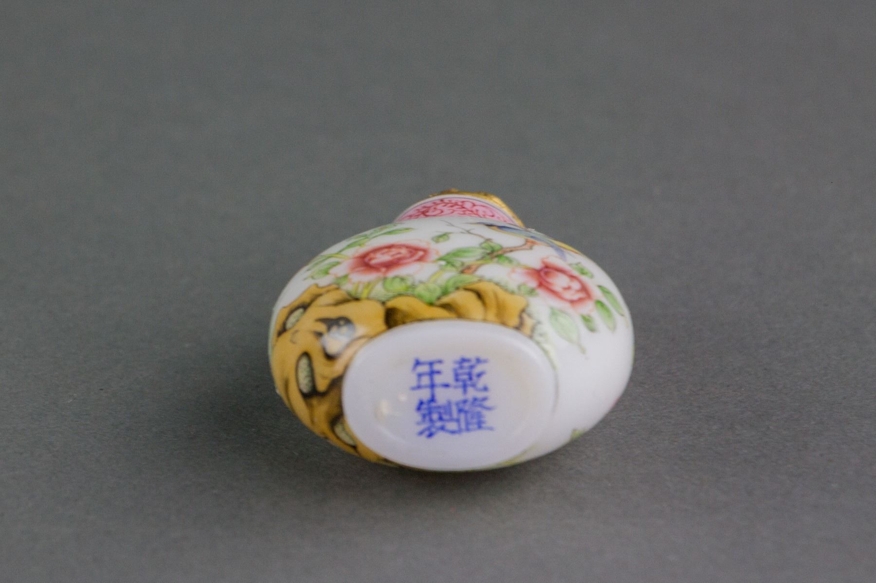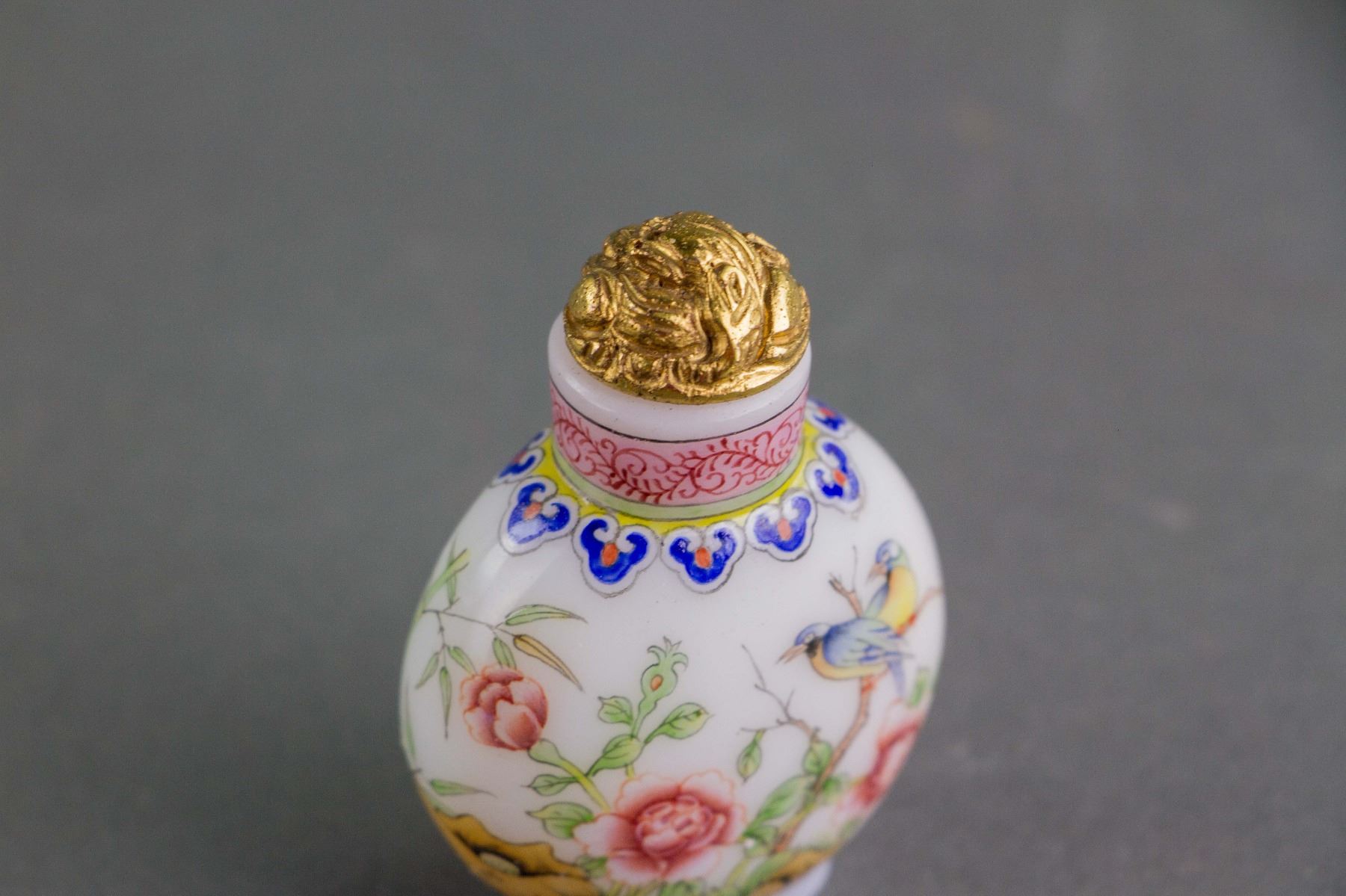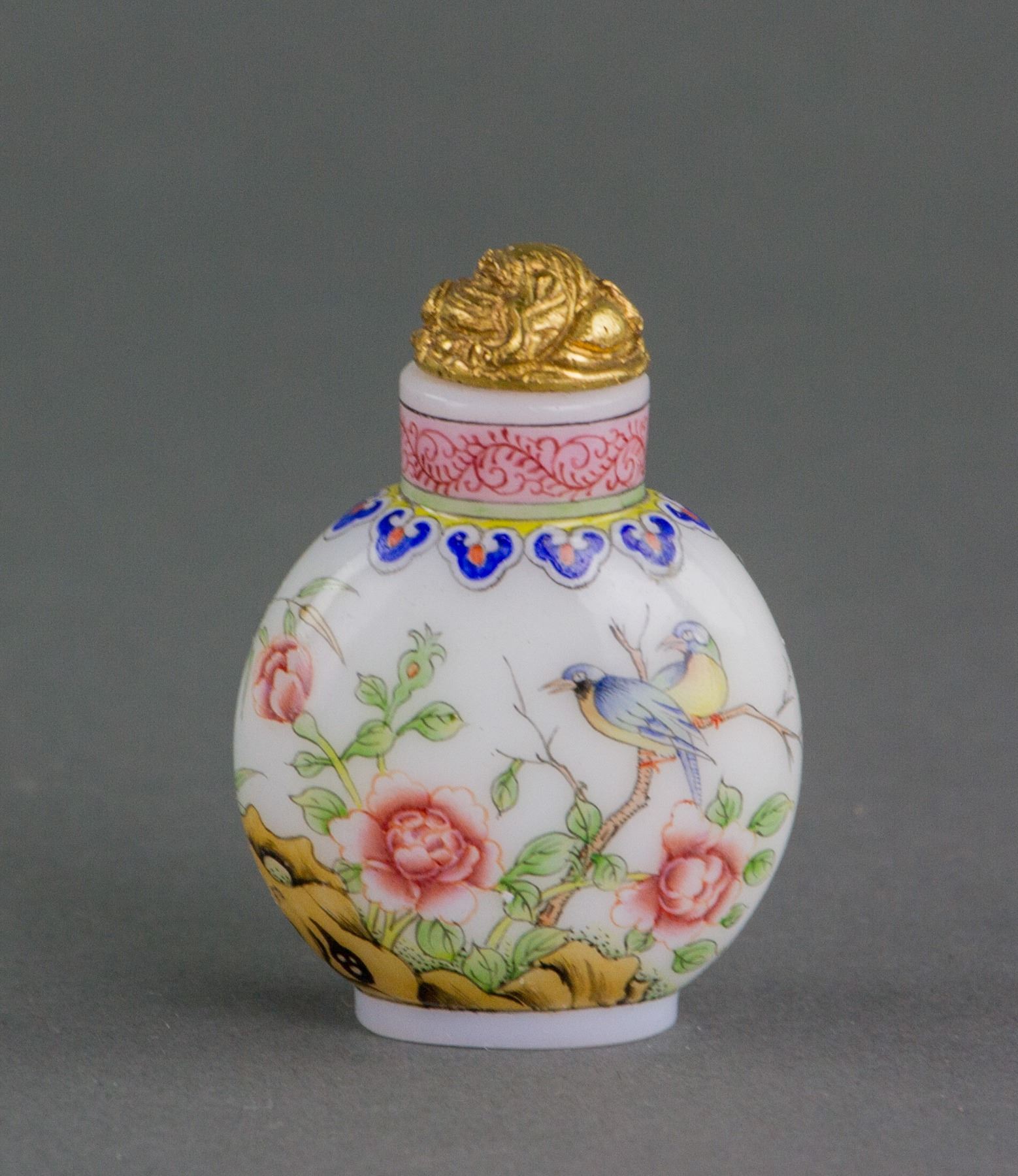 Chinese fine glass snuff bottle; of flatten globular body with gilt cap; painted with birds and flower; cap carved in a crouching dragon form; four-character Qianlong mark on base; 5.5 cm x 4 cm, 49 grams. PROVENANCE: Private collection (Nagoya, Japan)