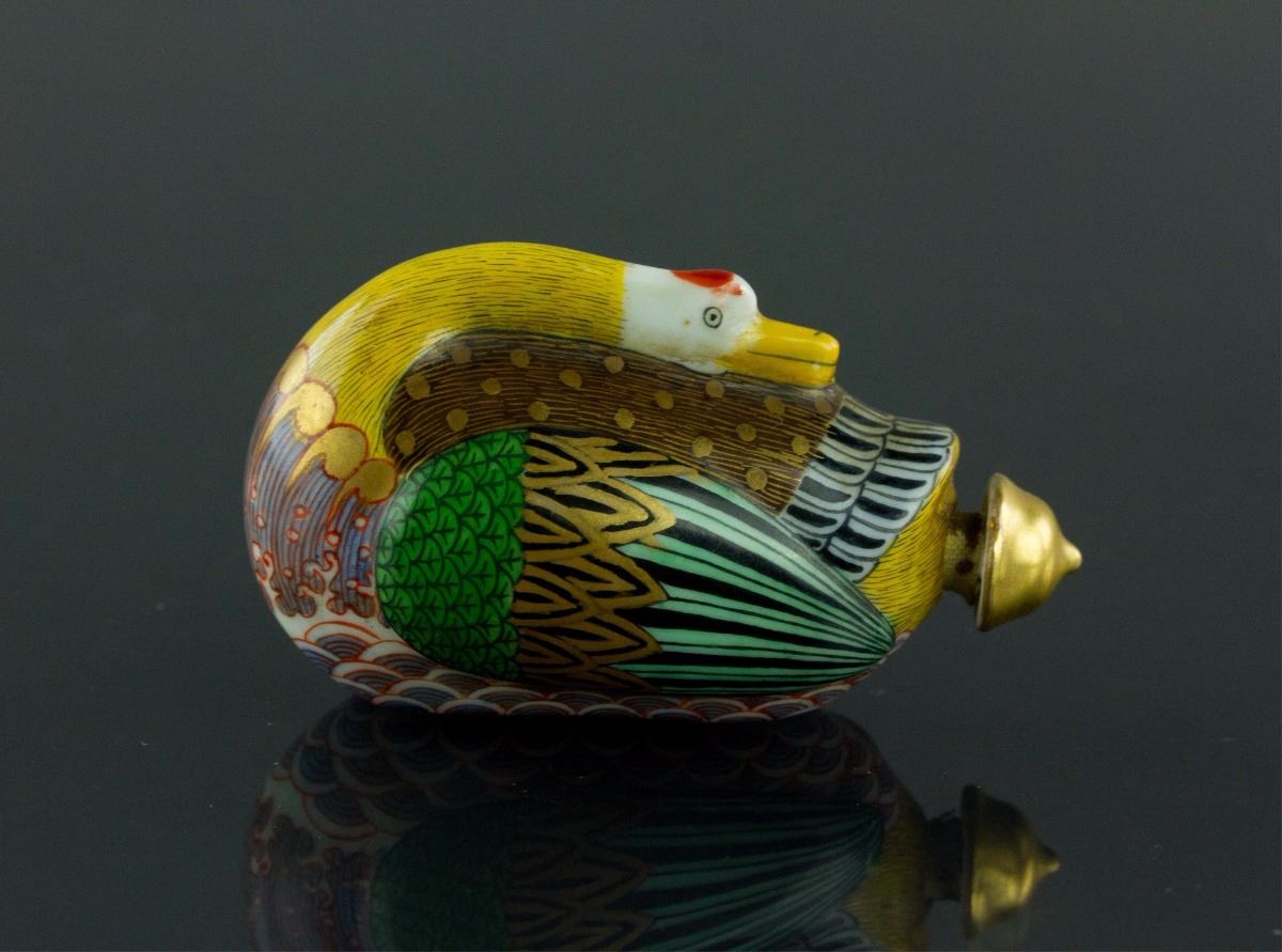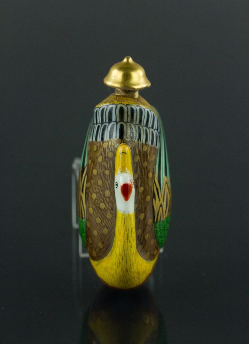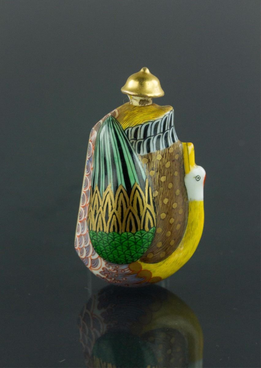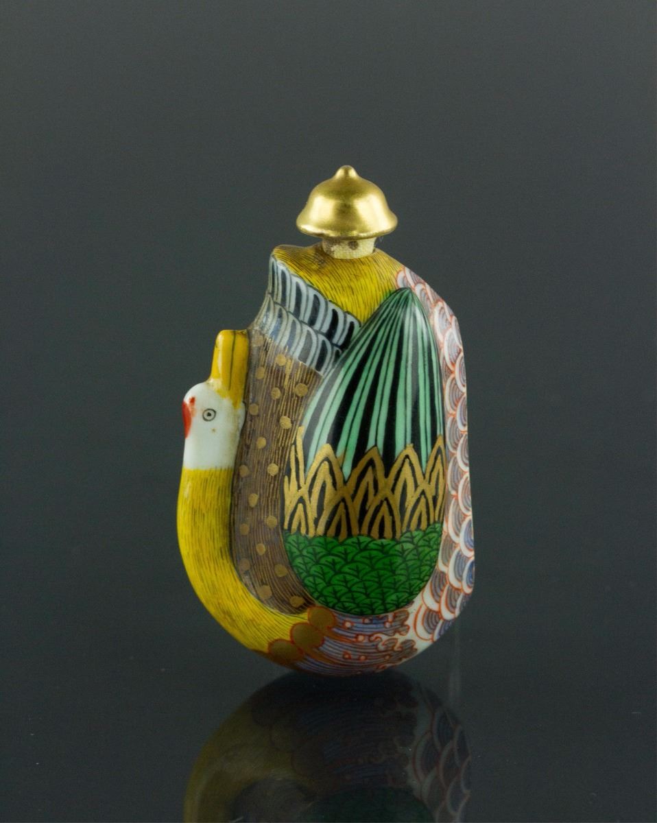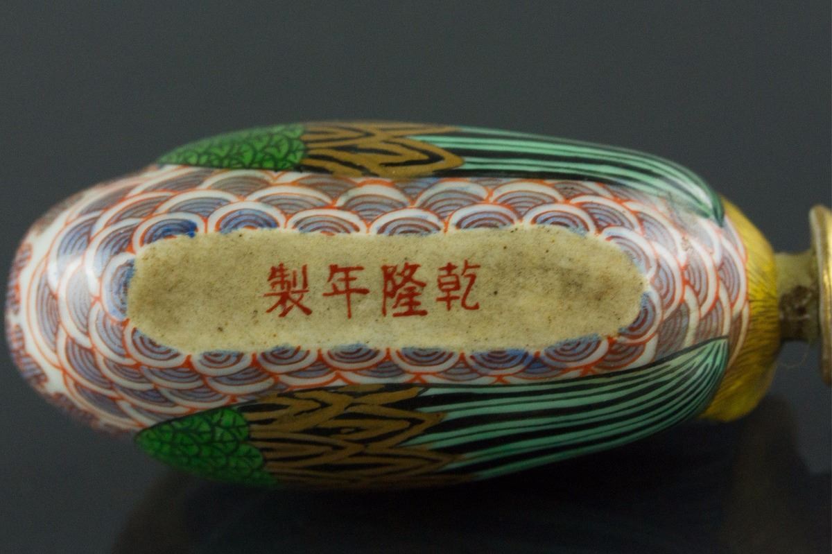 Chinese Famille Rose porcelain snuff bottle with cap; moulded and painted with peacock feathers; four-character Qianlong mark on base; H: 6 cm, D: 3.5 cm, 38 grams