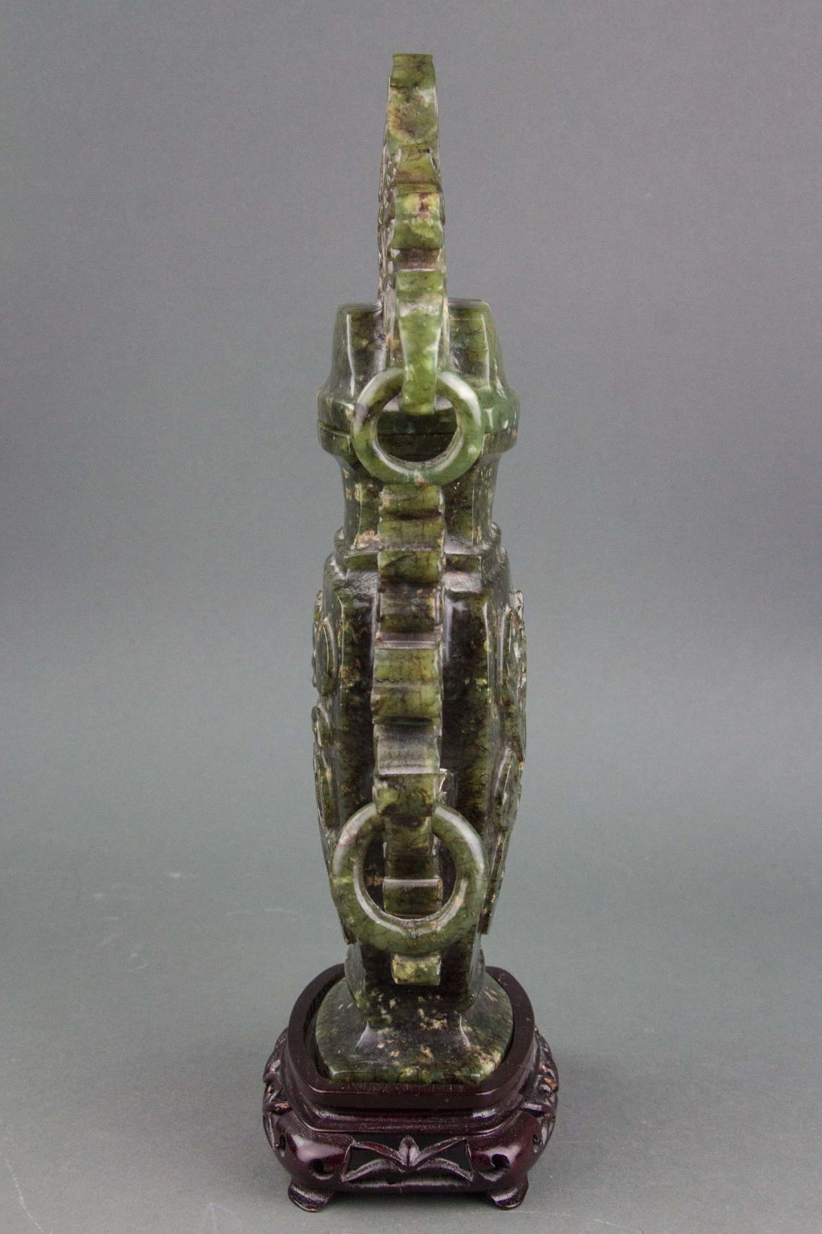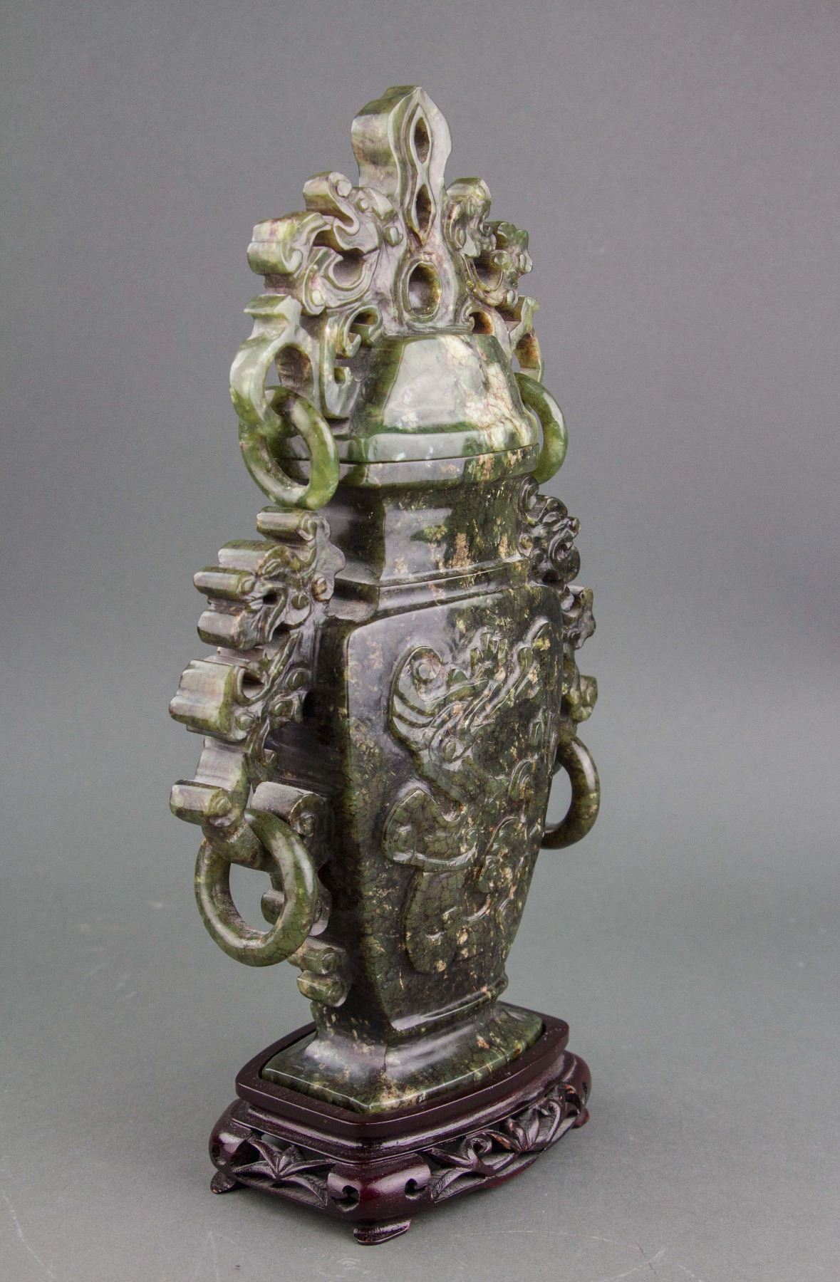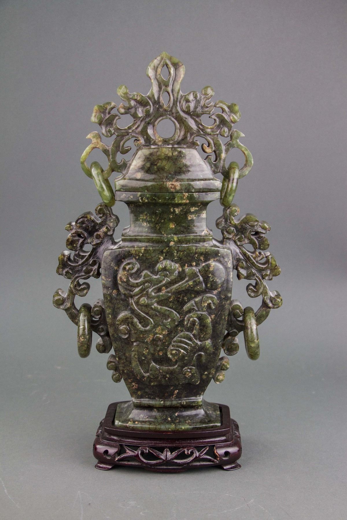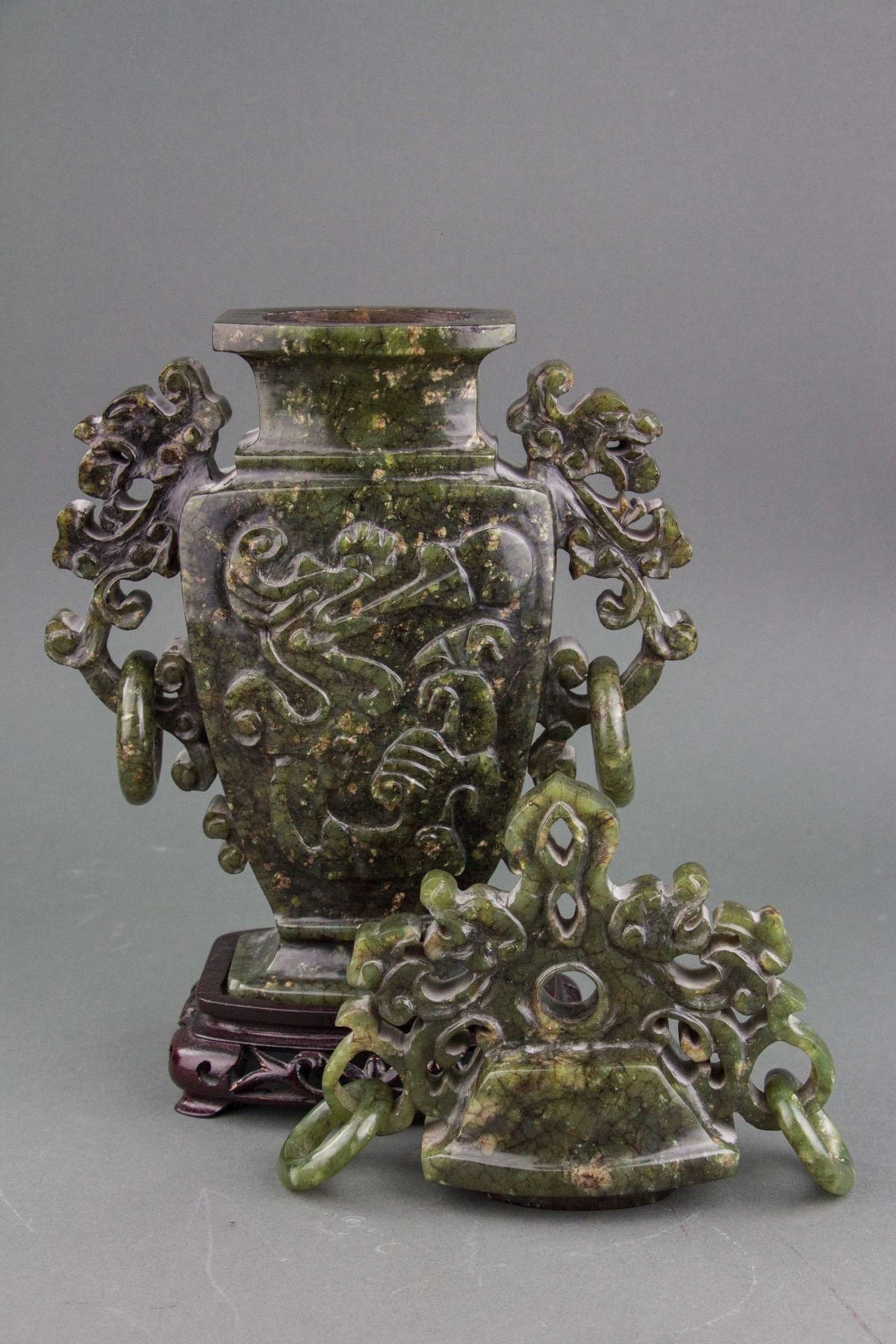 Chinese fine green hardstone carved vase; of flatten baluster form body; flanked with leaf form handles with rings; cover with leaf form knob with rings; carved with mythical beast; 38.5 cm x 22 cm, 3325 grams