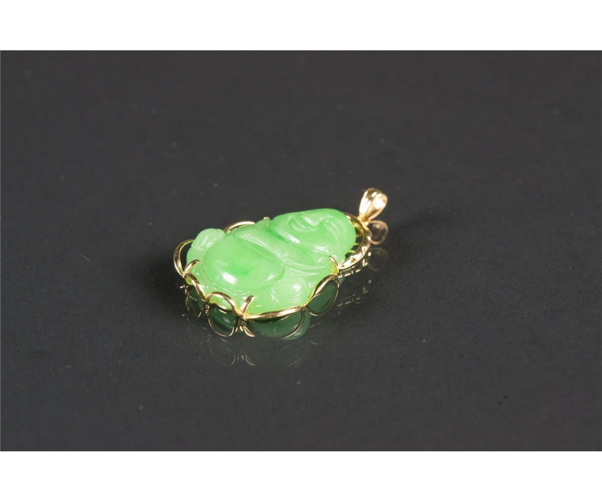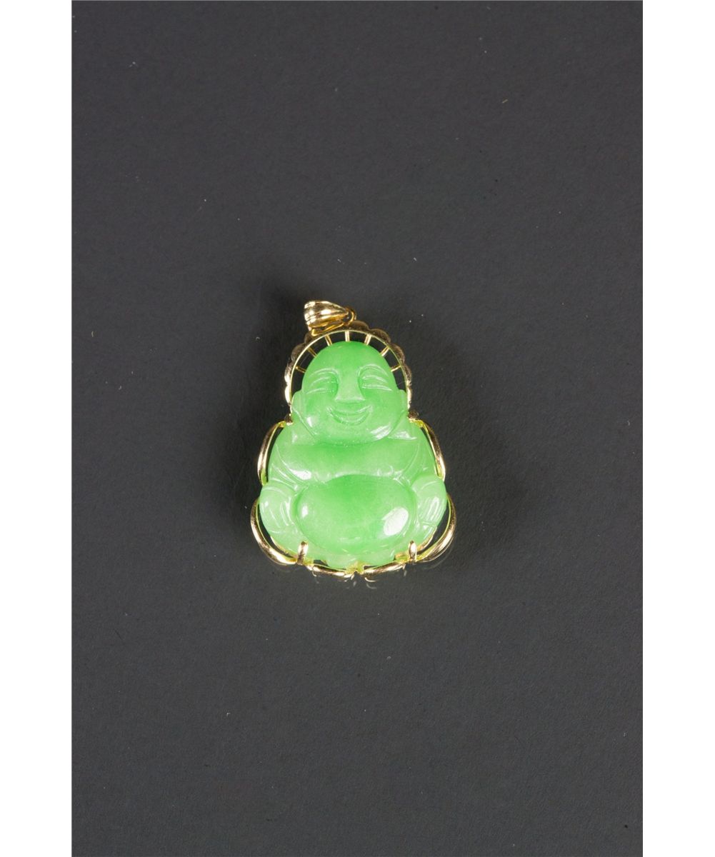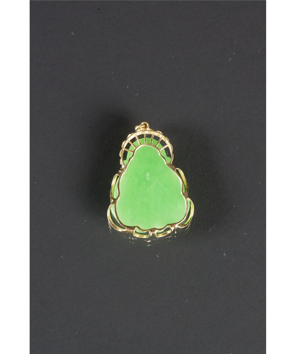 Chinese fine green jadeite Buddha pendant; depicting a siting laughing Buddha; of emerald green tone; with 18K gold frame and clasp; H: 3.5 cm, W: 2.75 cm, 7 grams