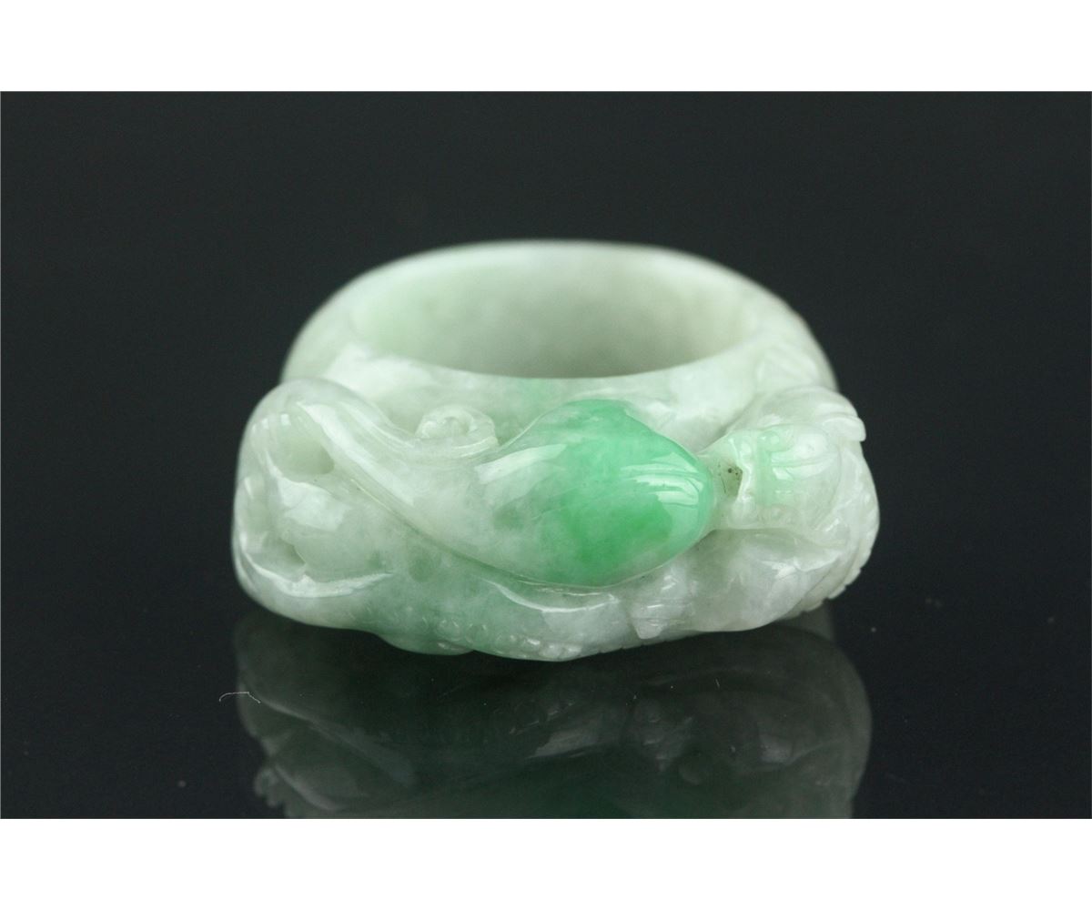 Chinese fine green jadeite ring; featuring carvings of Chilong; in apple green tone; with Grade A certificate; D: 2.5 cm, 20 grams