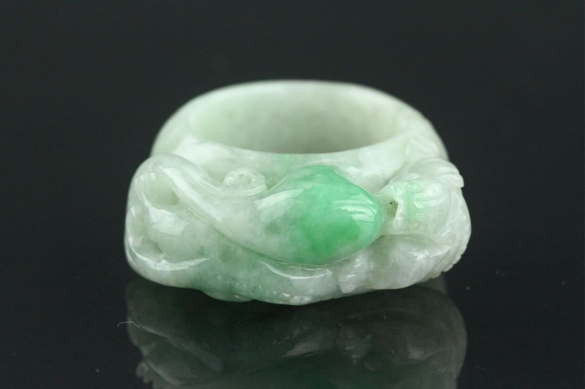 Chinese fine green jadeite ring; featuring carvings of Chilong; in apple green tone; with Grade A certificate; D: 2.5 cm, 20 grams