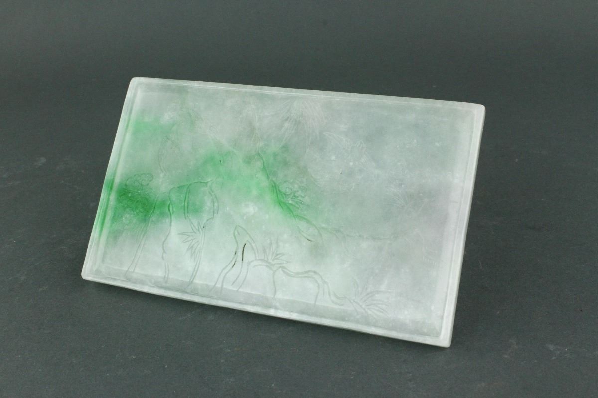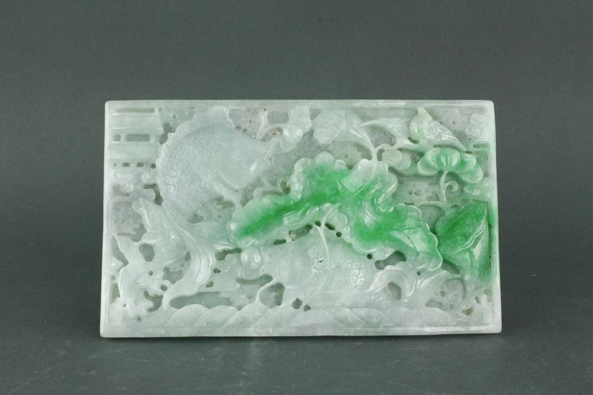 Chinese fine green jadeite plaque; of rectangular form; featuring high-relief carvings of two carps in lotus pond; of pale celadon tone with a touch of emerald green; W: 8.5 cm, L: 14 cm, 322 grams