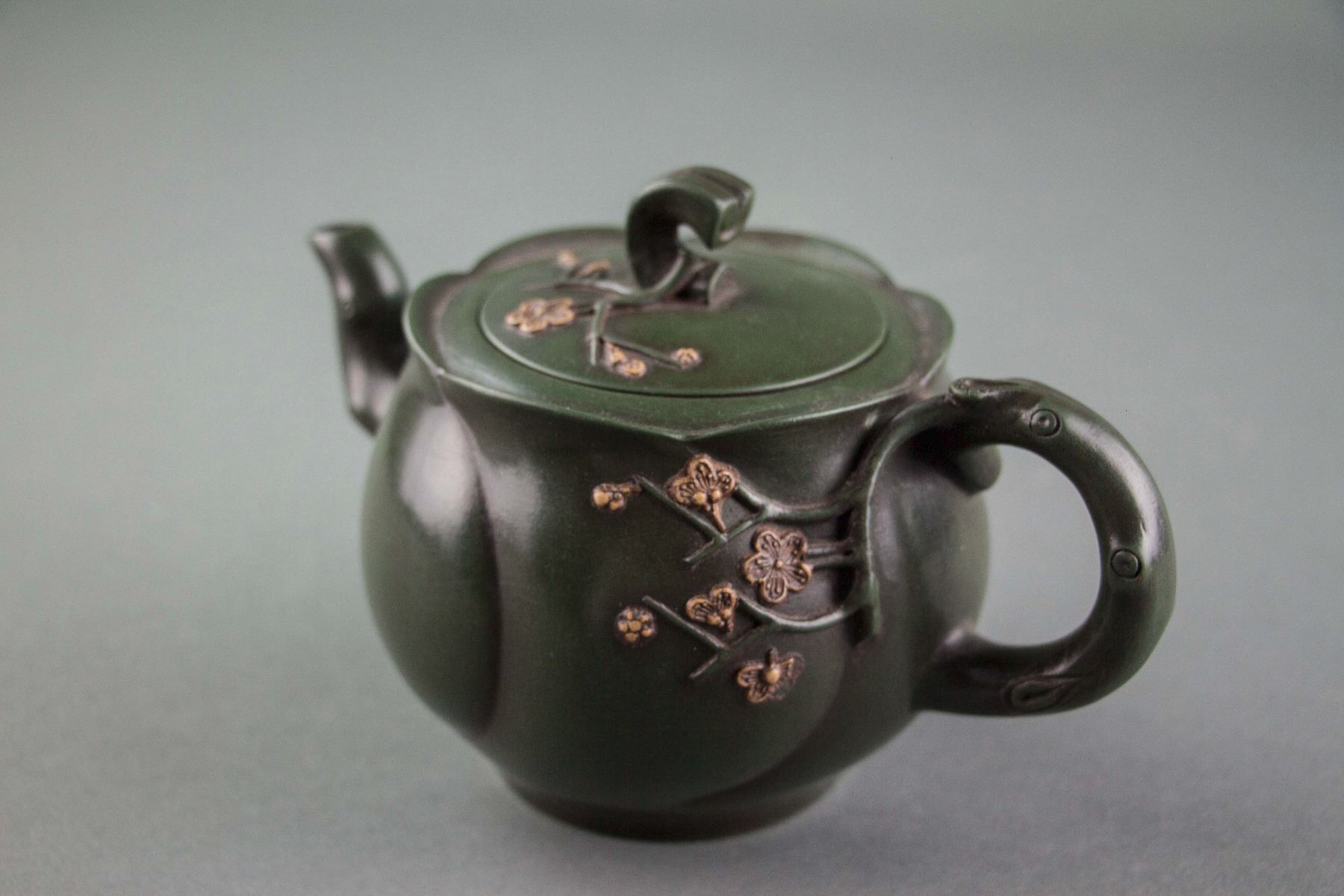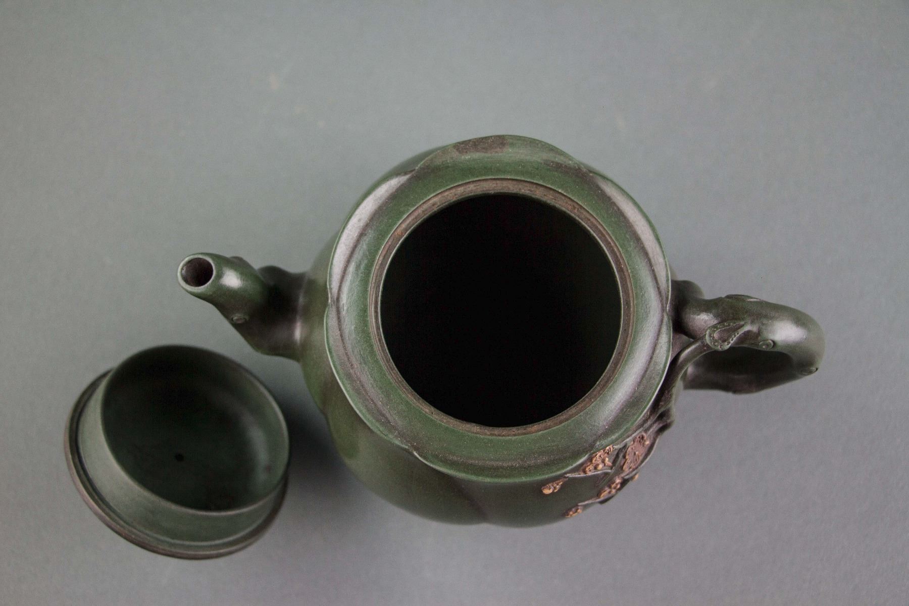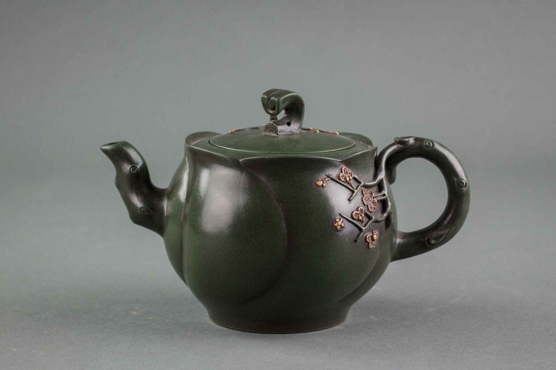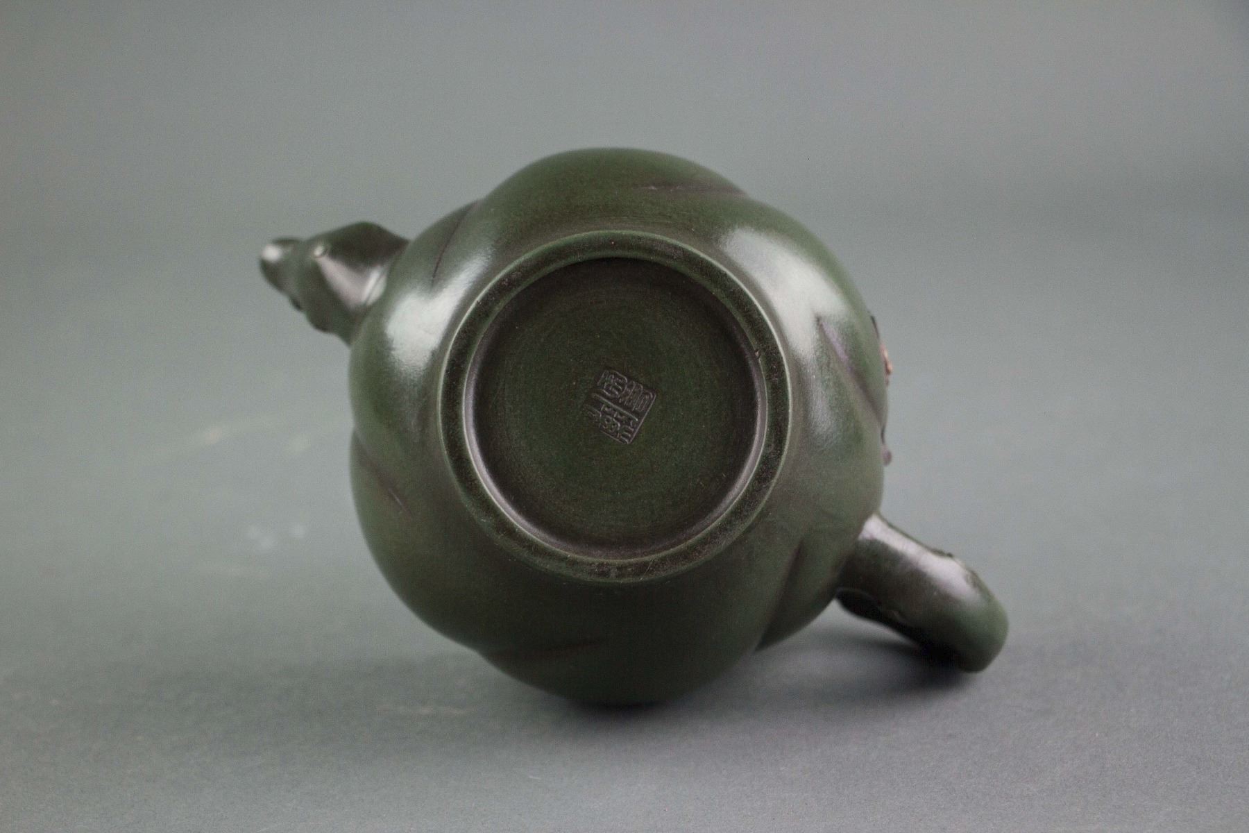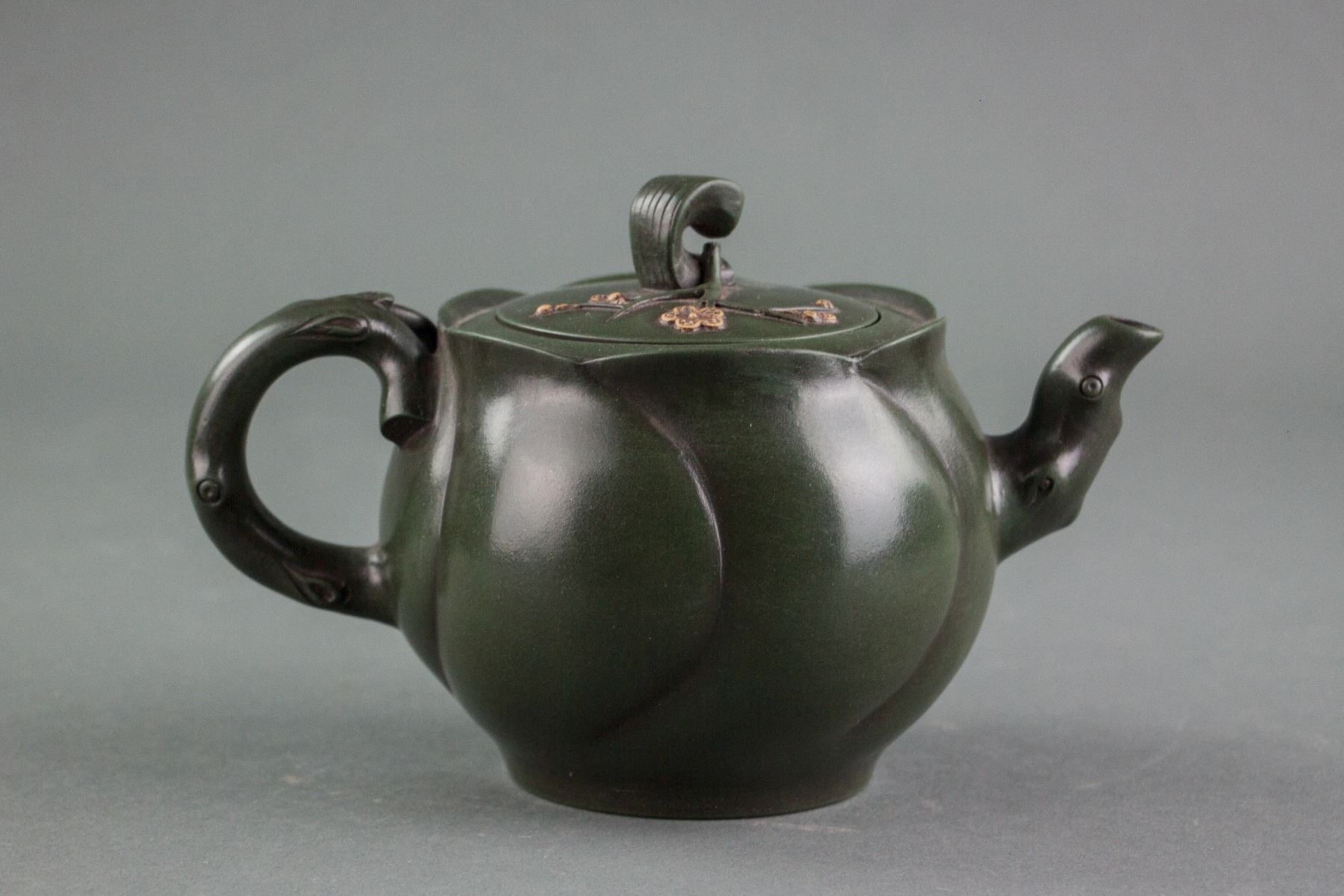 Chinese fine Zisha teapot; of flower pedal form body; flanked with twig form spout and handle; carved with flower decoration on cover and body; artist mark on base; 11 cm x 18.5 cm, 432 grams