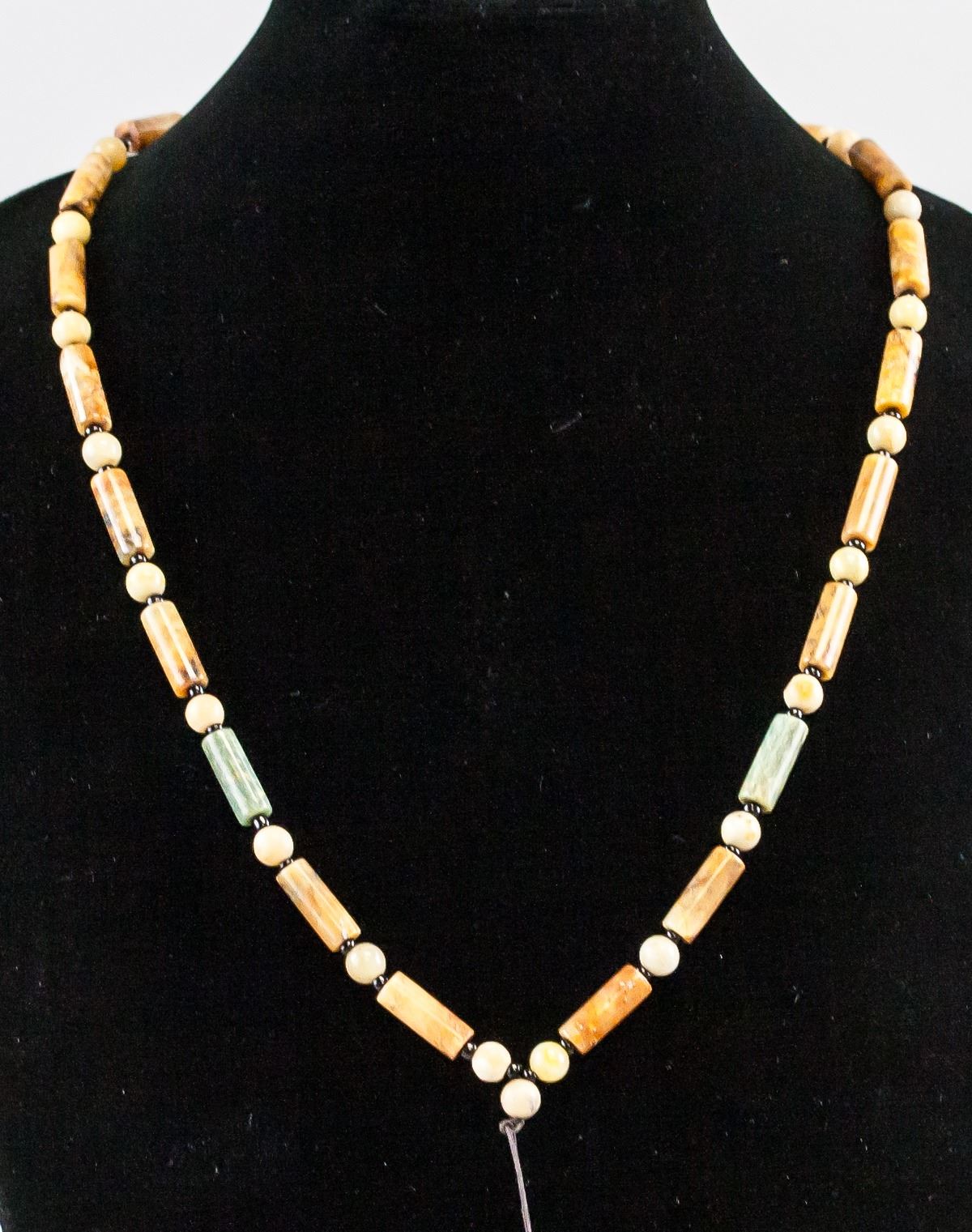 Chinese hardstone and agate necklace. Featuring tube and round beads. Length: 37 cm, 69 grams, density: 2.51