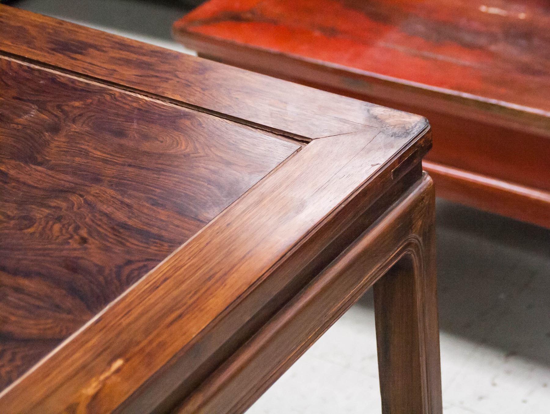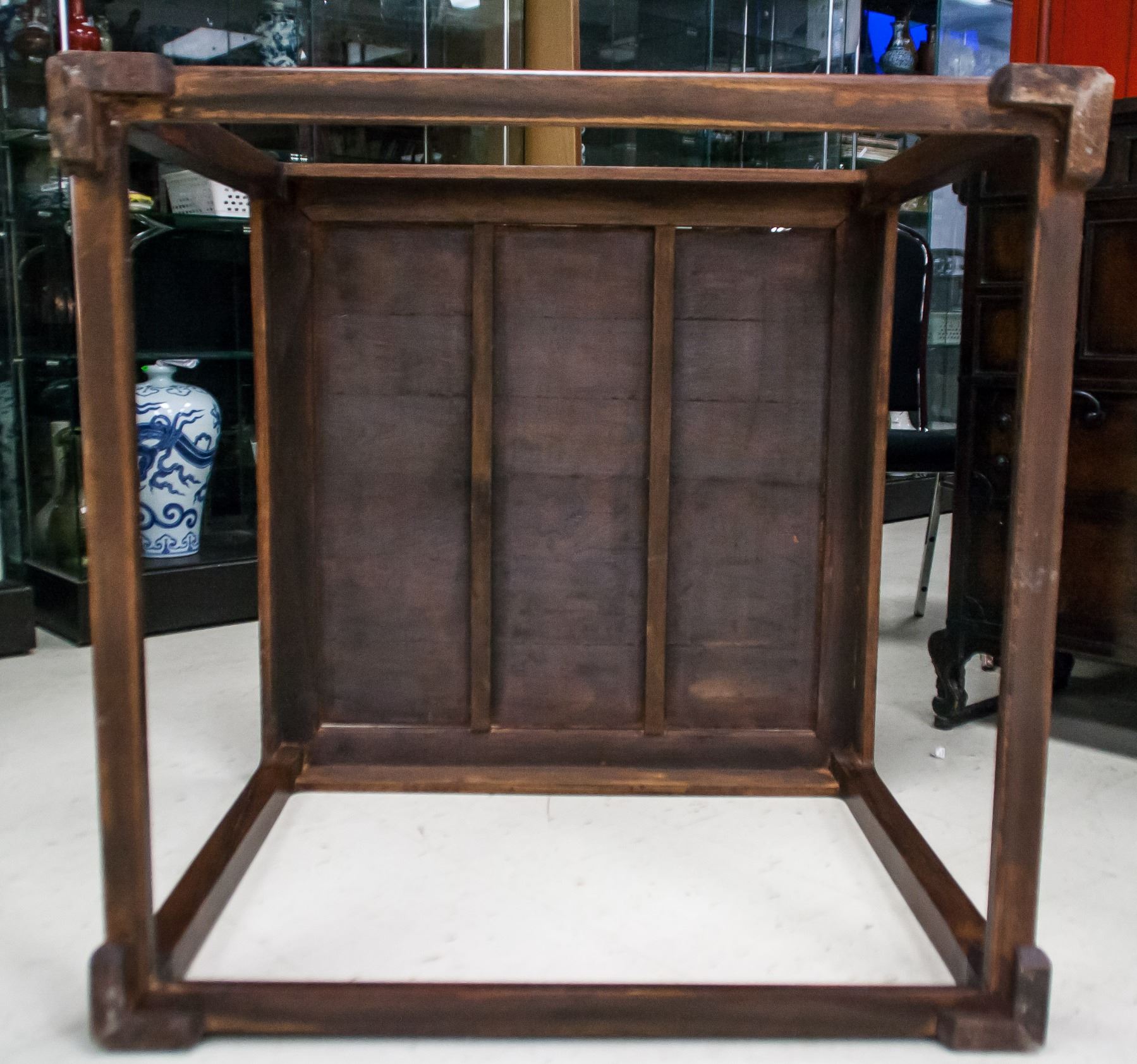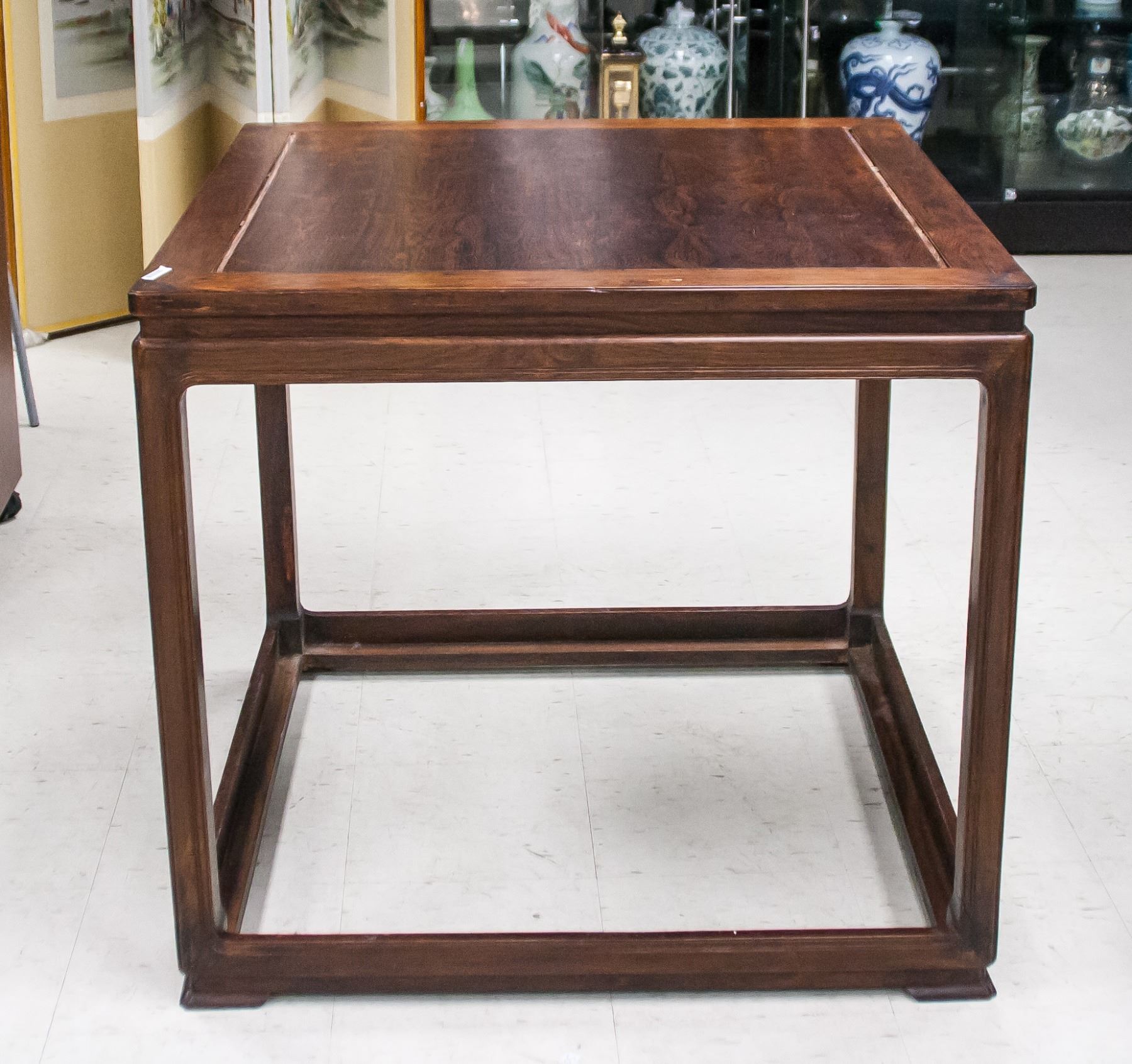 Fine Chinese Huanghuali wood carved fang zhuo square table; the huanghuali carved wood panel is set within square huanghuali carved frame, atop a plain narrow waist; the straight legs set into the plain, stretcher supported on four tabs; crack on two edges of table top; 82 cm x 89 cm x 89 cm