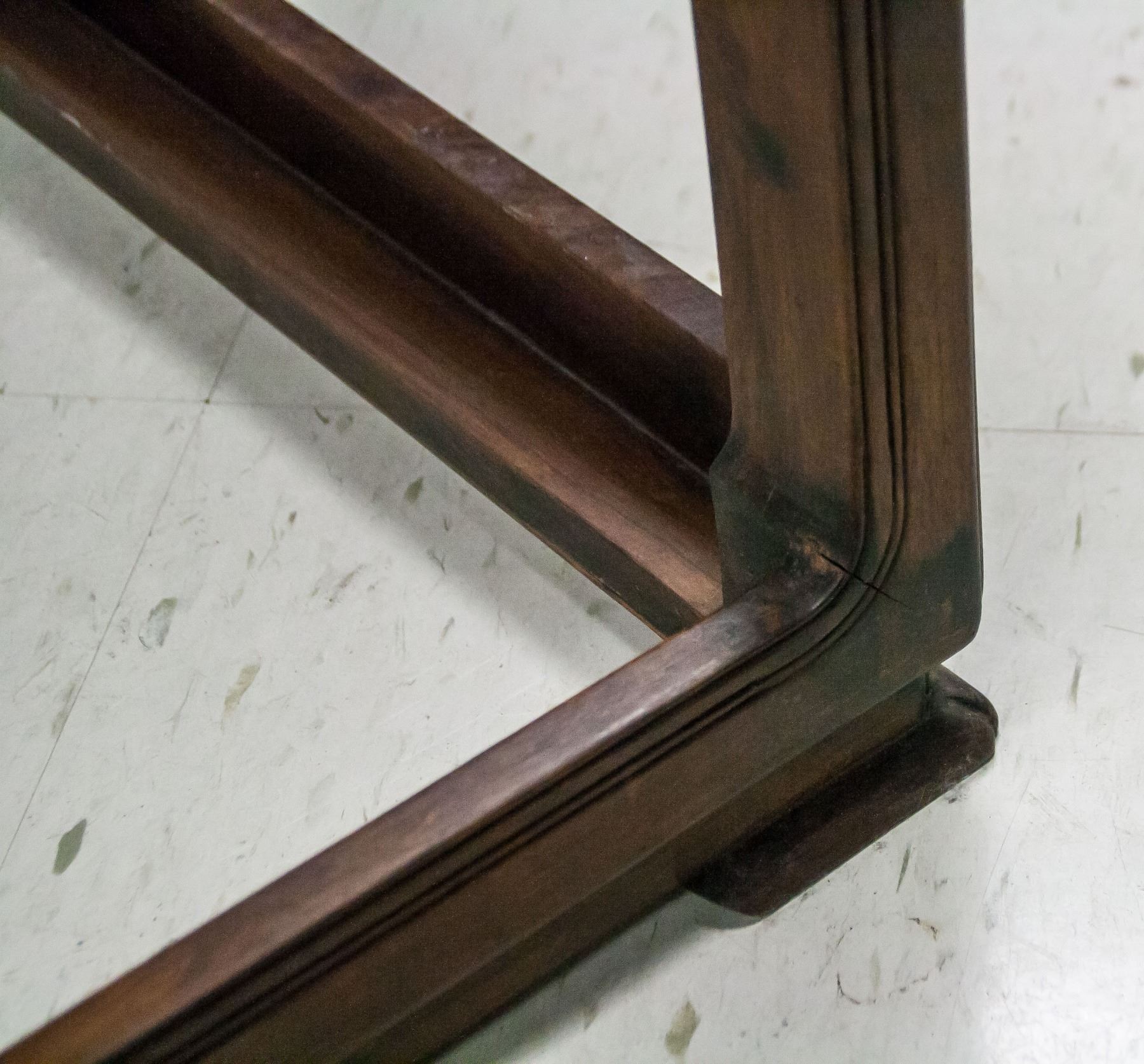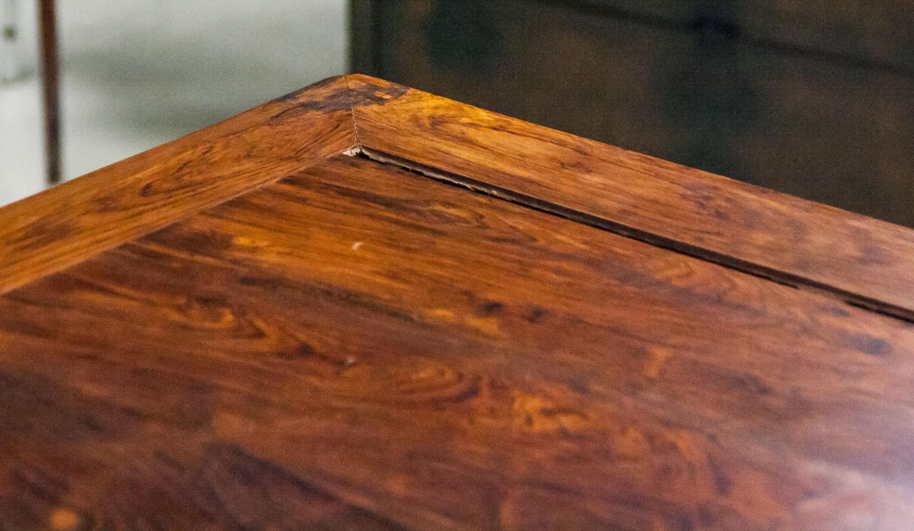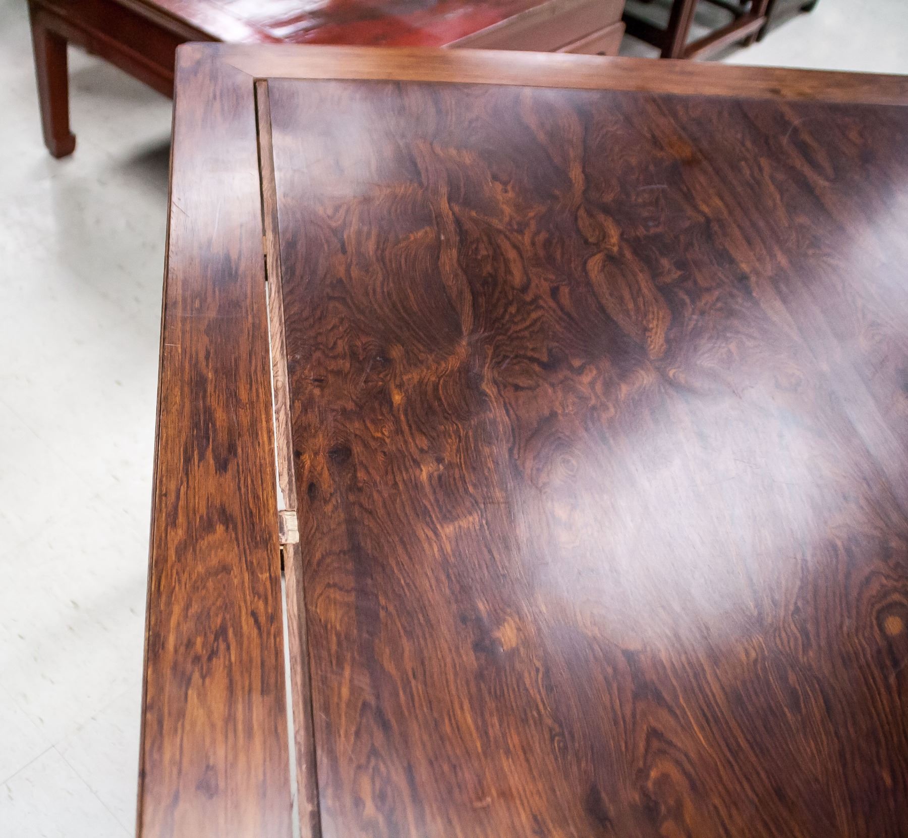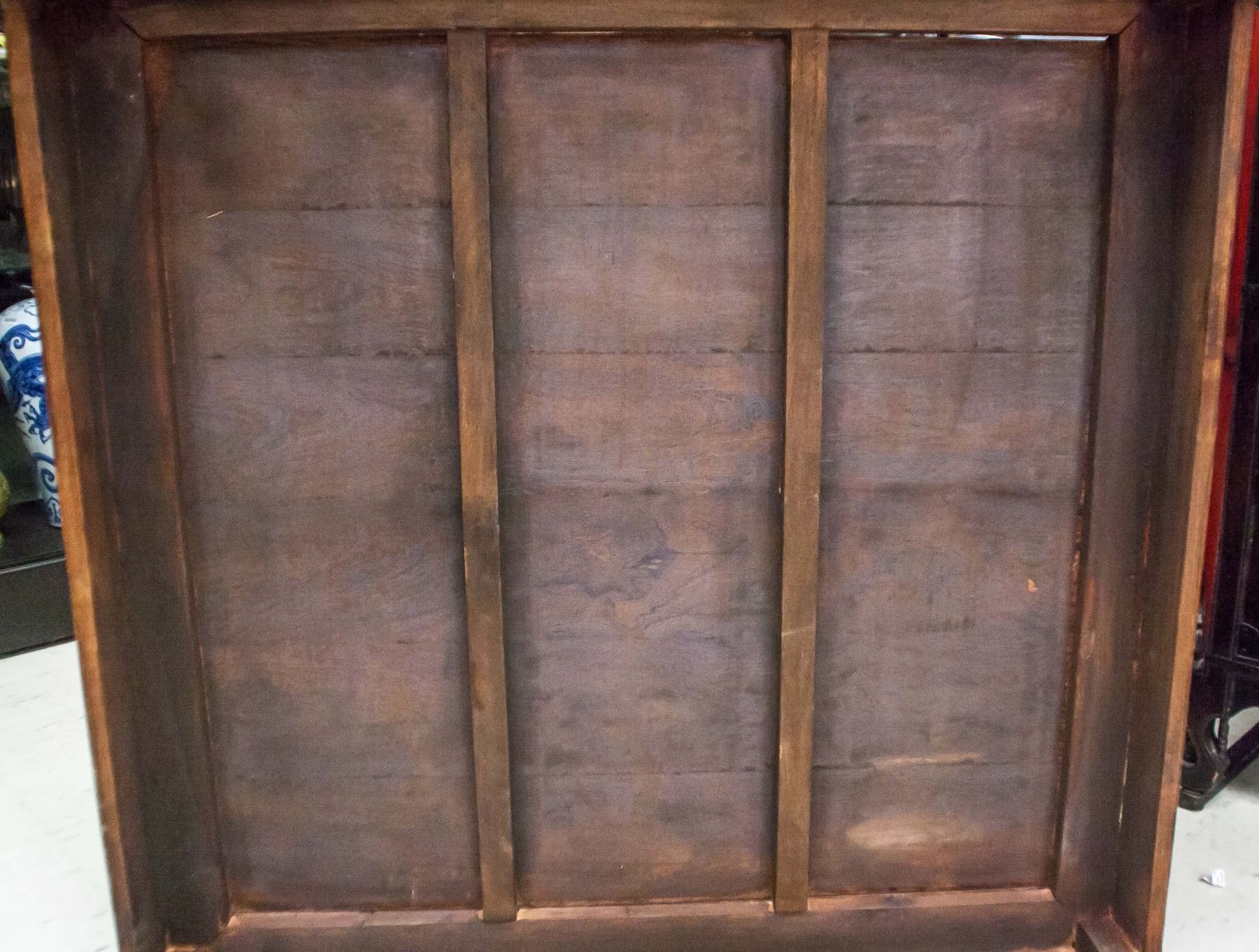 Fine Chinese Huanghuali wood carved fang zhuo square table; the huanghuali carved wood panel is set within square huanghuali carved frame, atop a plain narrow waist; the straight legs set into the plain, stretcher supported on four tabs; crack on two edges of table top; 82 cm x 89 cm x 89 cm