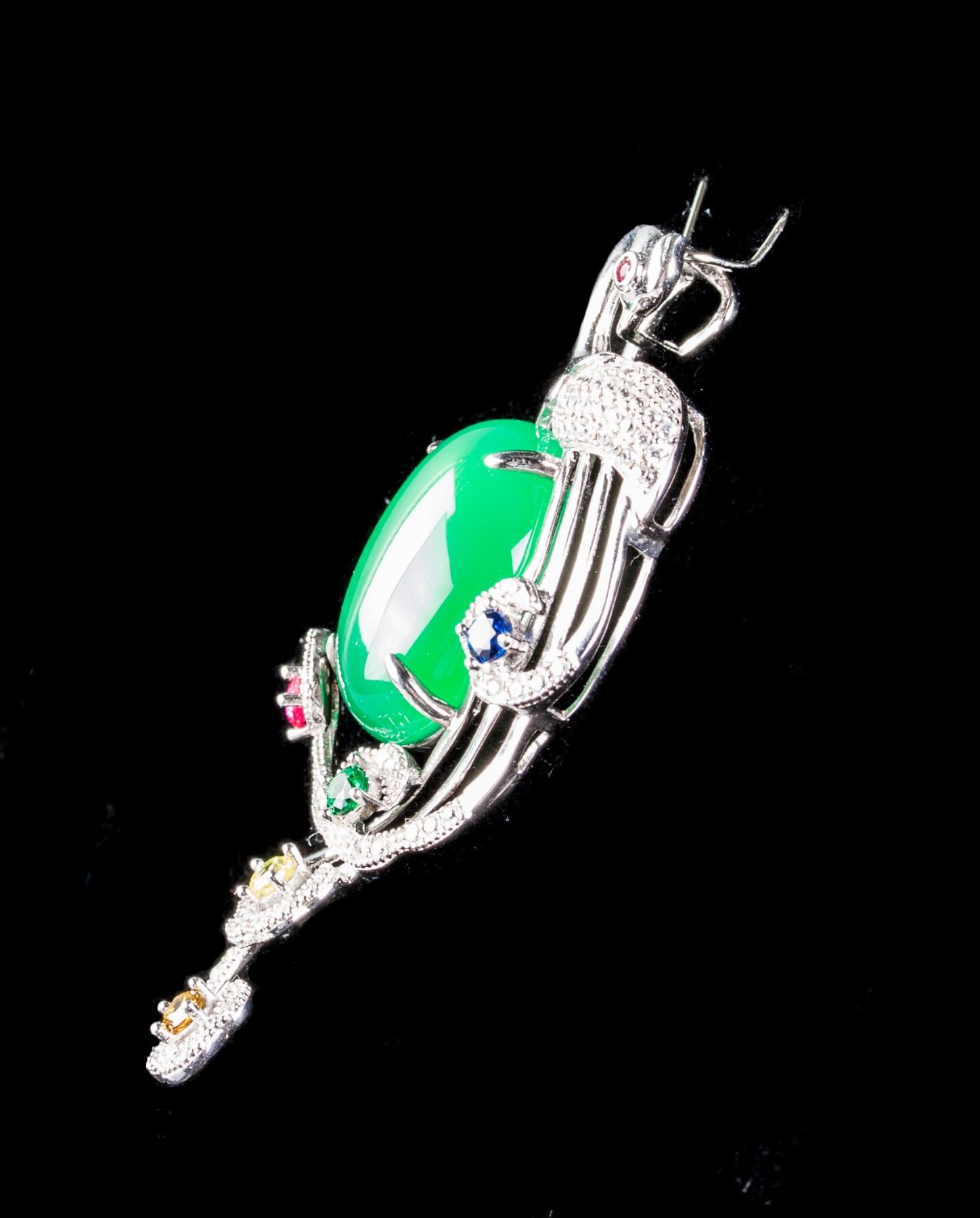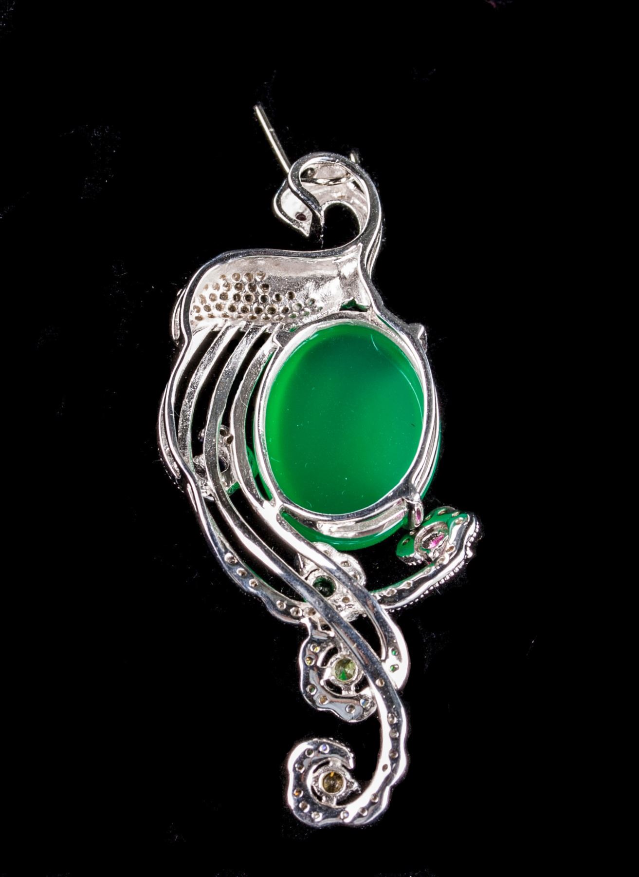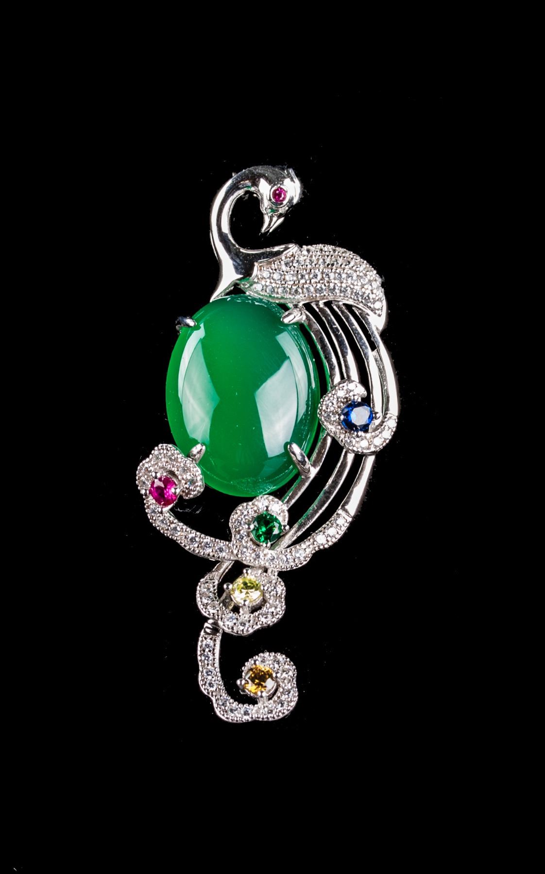 Chinese fine jade pedant; with a peacock form body; set with a ovoid green jade in middle and 6 gemstones in multi colours; 5.7 cm x 2.5 cm, 13 grams