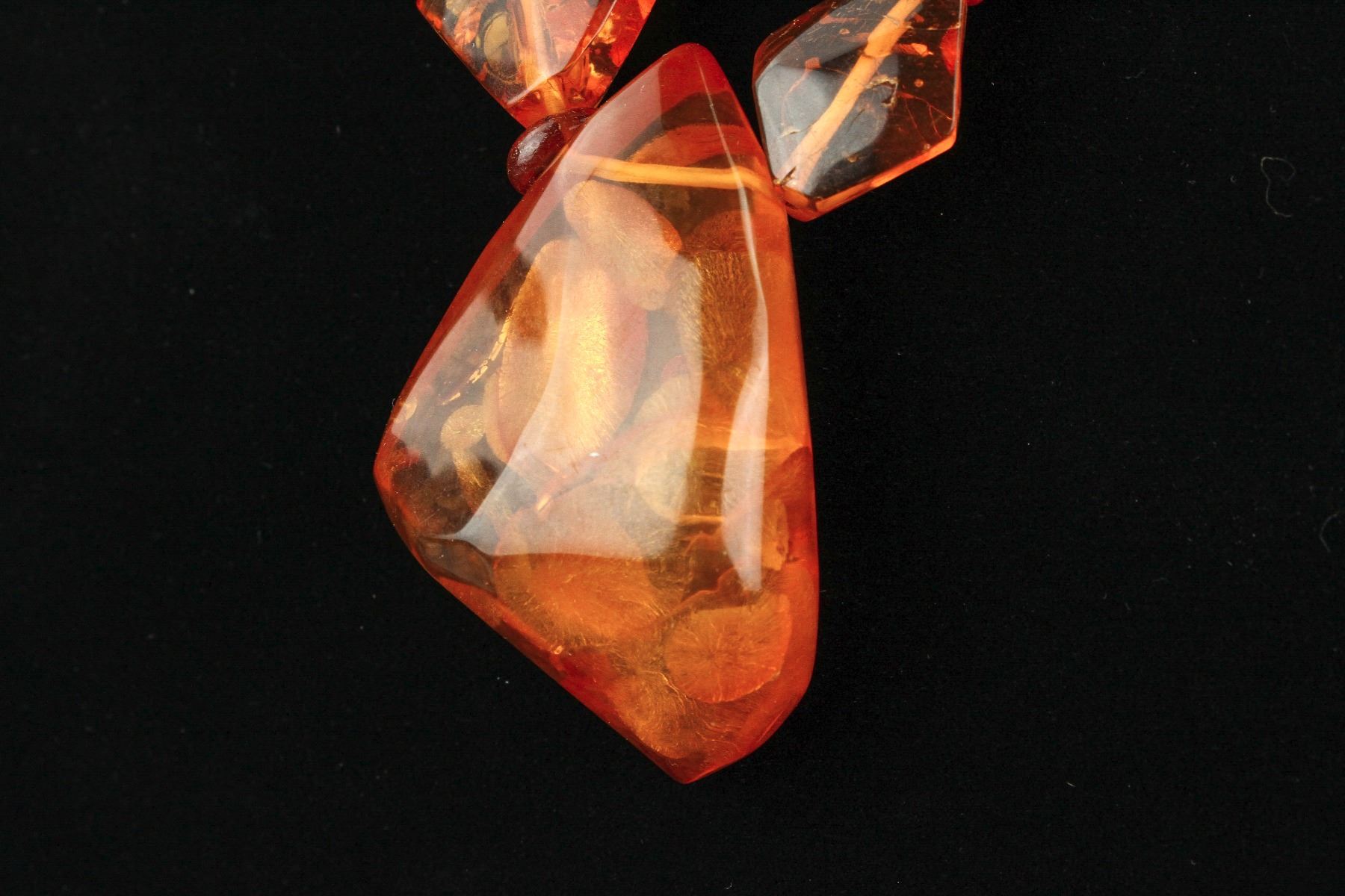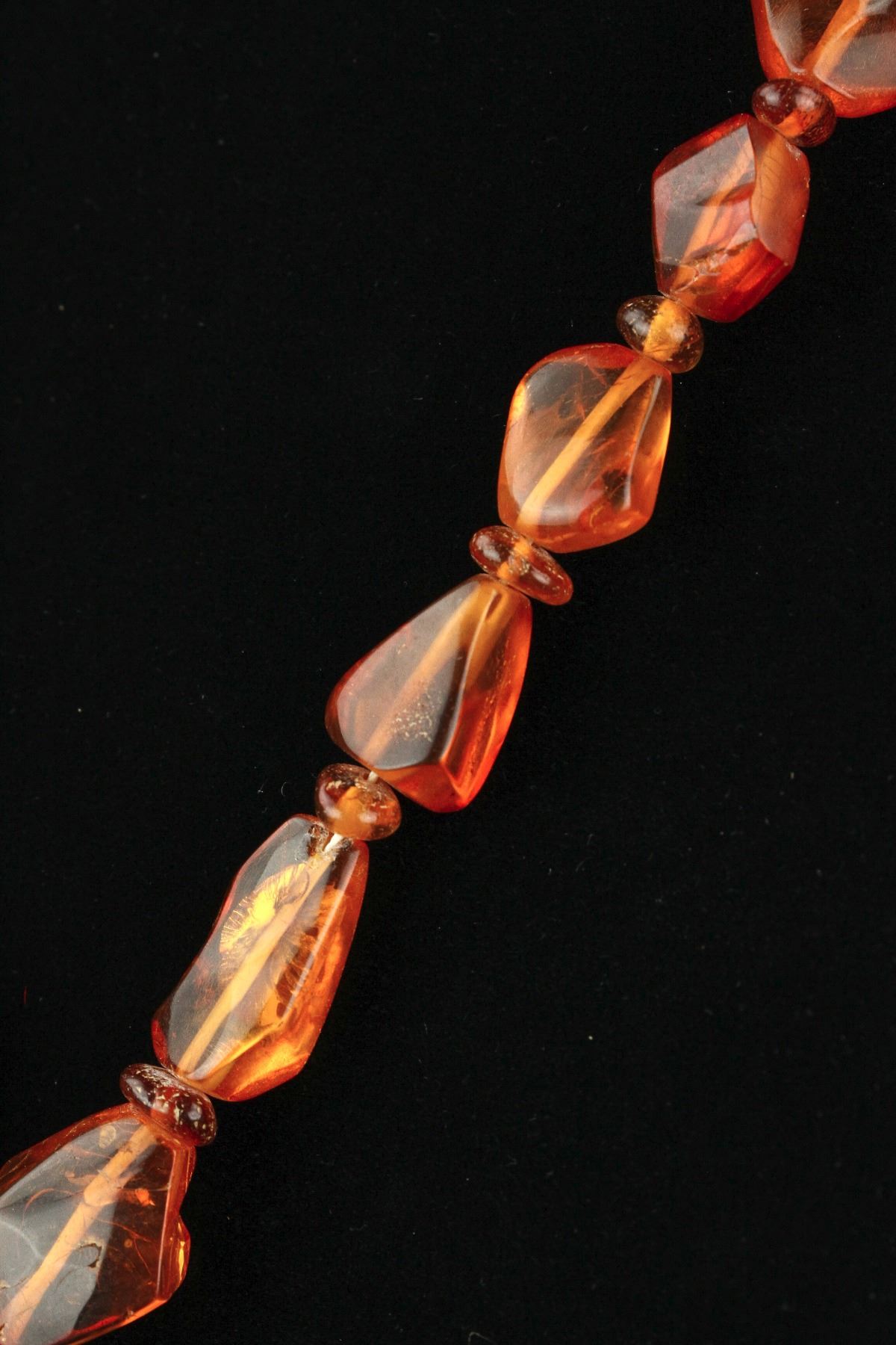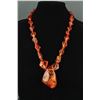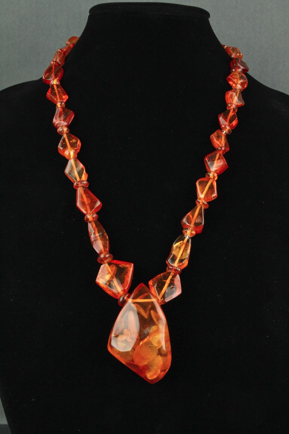 Chinese fine large amber necklace; comprised of natural form amber beads alternating with disk form amber beads; of translucent orange tone; L: 36 cm, pendant L: 6 cm, W: 4 cm, 75 grams
