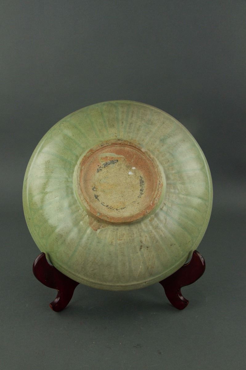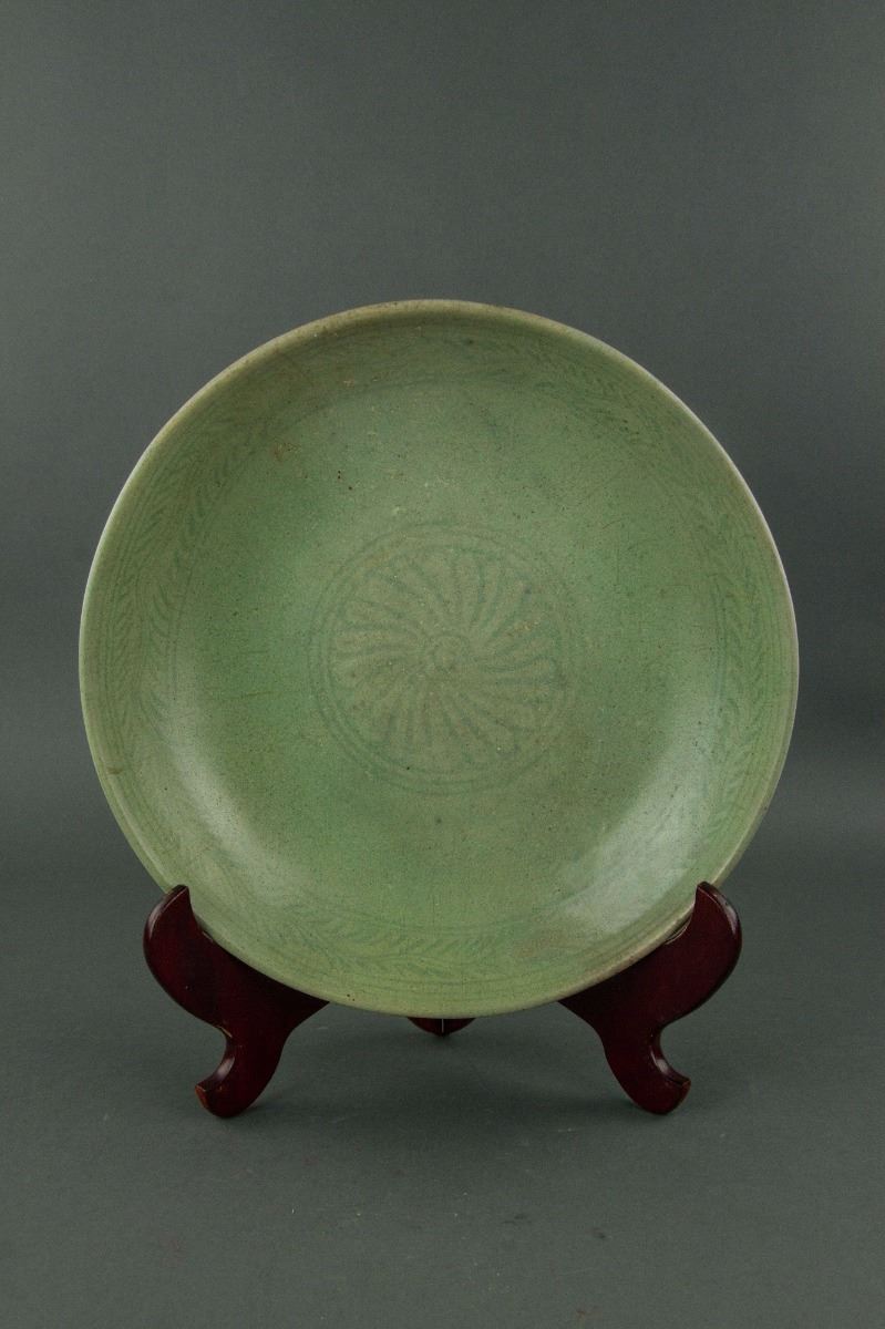 Chinese large celadon carved porcelain plate; of round lobed form; decorated leafy and floral pattern inside and outside; H: 6.5 cm, D: 27 cm, 1473 grams