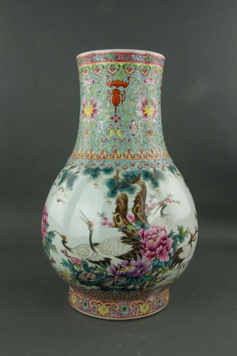 Chinese fine Republic Famille Rose porcelain Hu vase; of globular body with slightly waisted neck; painted with cranes underneath pine trees; titled and dated 1956; inscribed with two artist seals on shoulder; H: 43 cm, D: 26 cm, 5kilograms