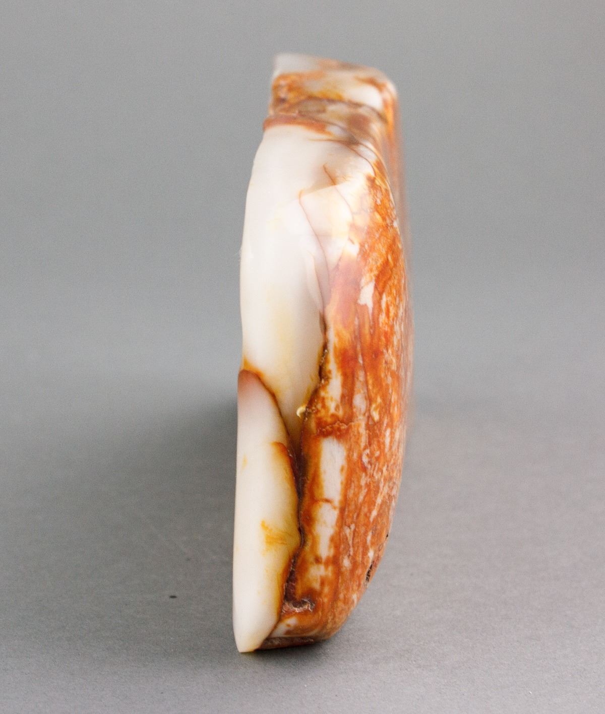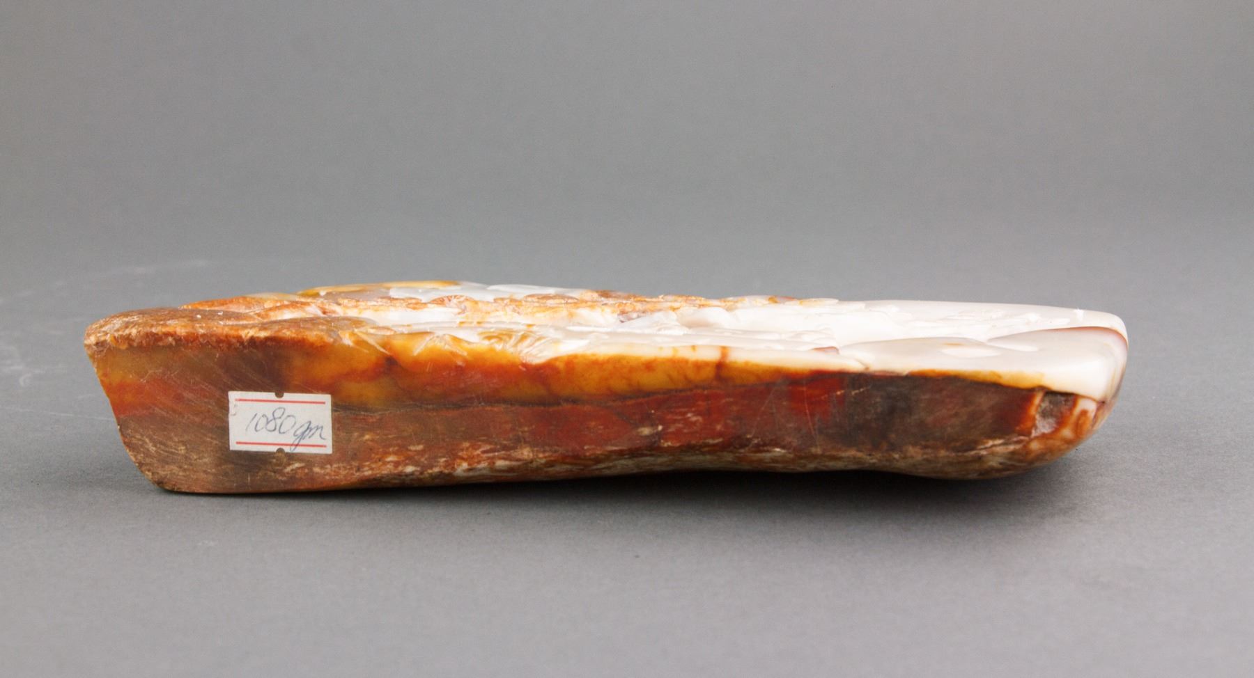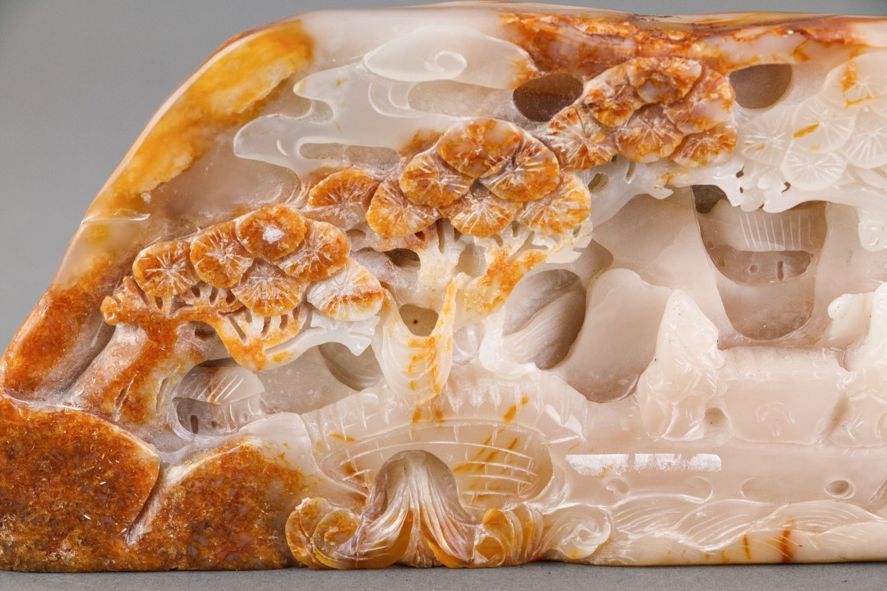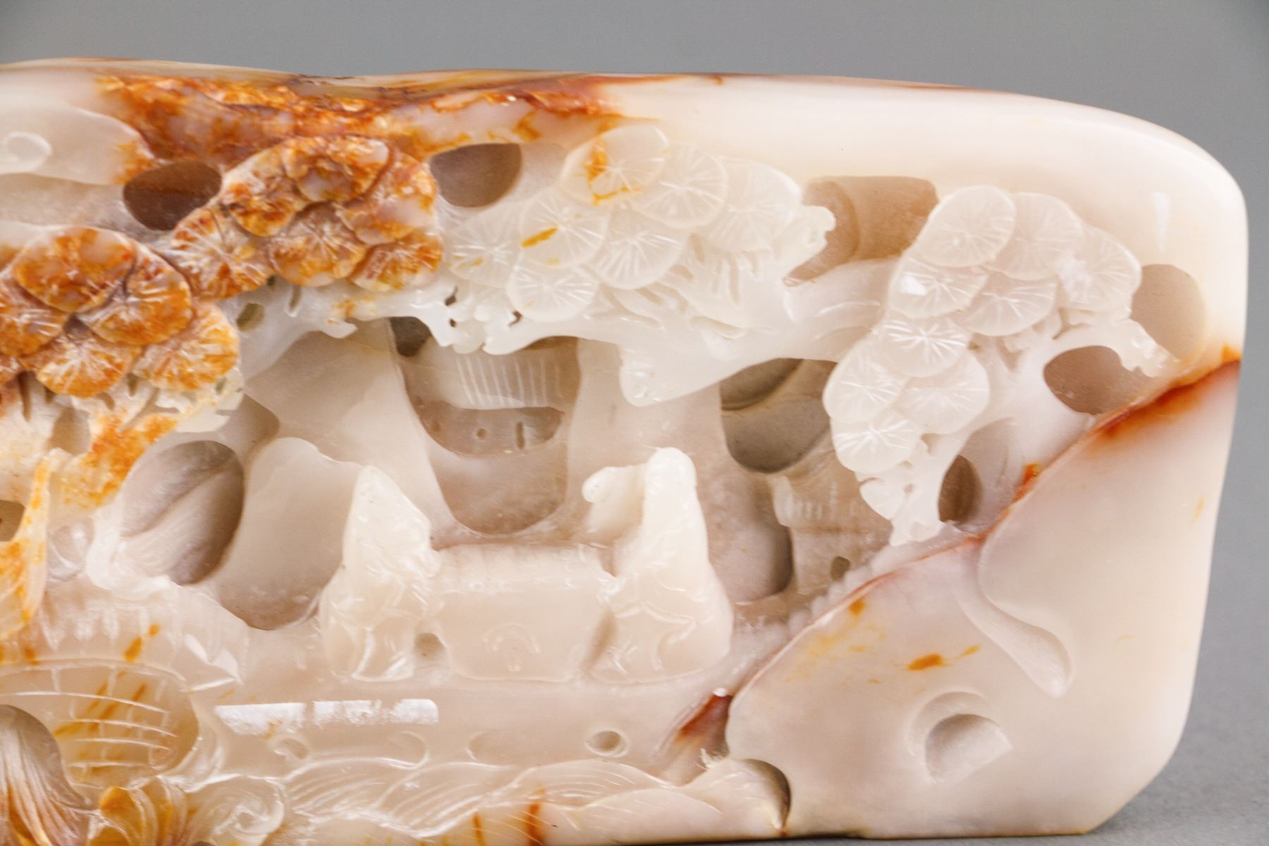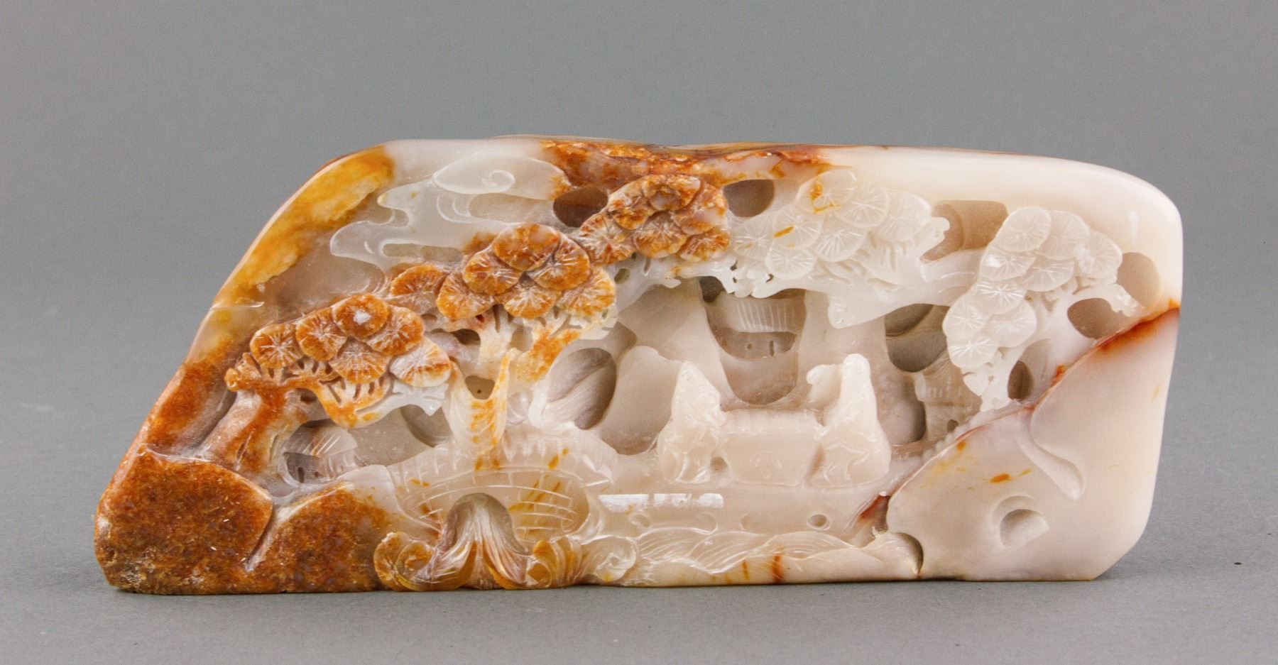 Chinese fine white jade boulder; carved with scholar figures underneath pine trees; of white tone with russet skin; H: 9 cm, L: 20 cm, 1153 grams