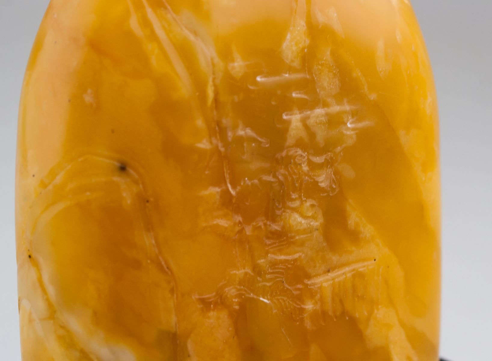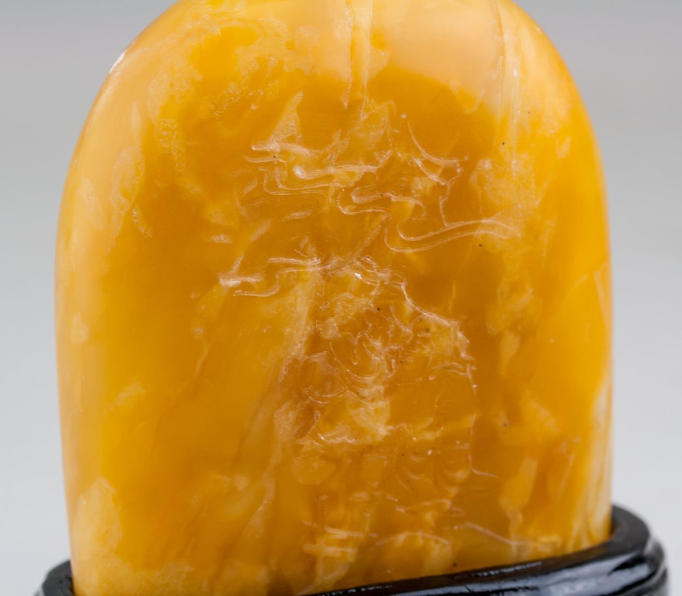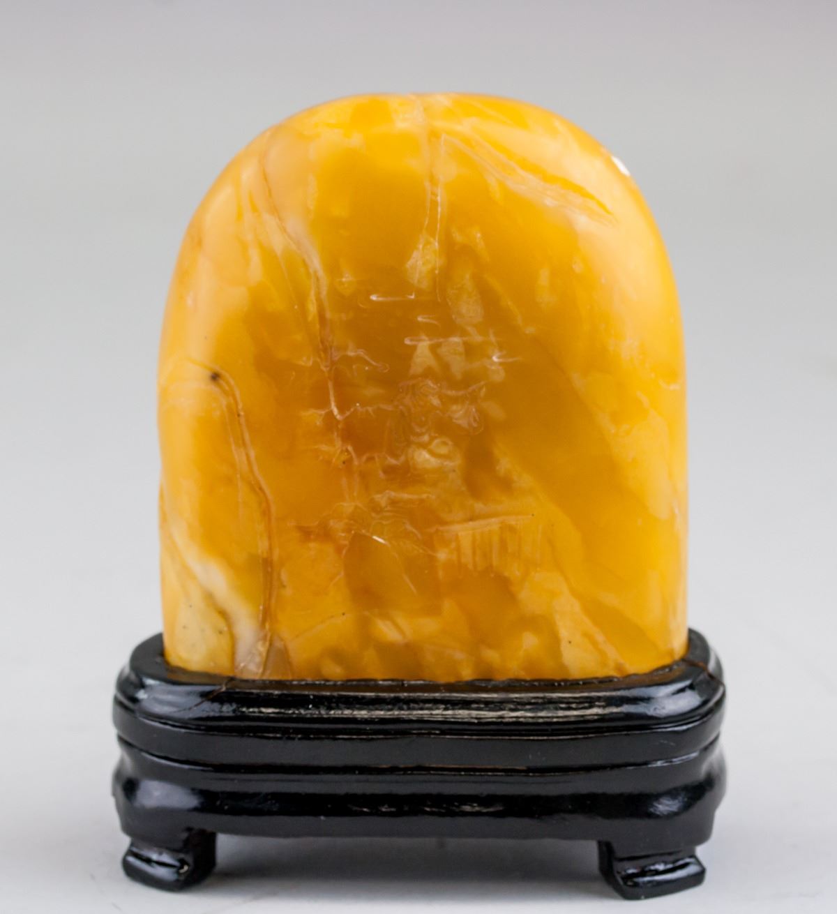 Chinese fine Shoushan stone carved boulder. Carved mountainous landscape on surface. With customized wood stand. 8 x 8 cm, 468 grams total