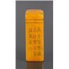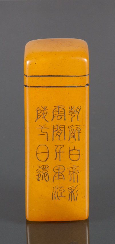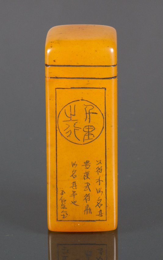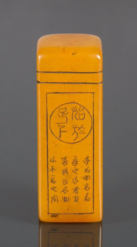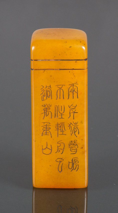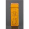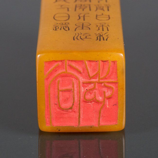 Fine Chinese shoushan stone carved seal; rectangular form featuring incised script on sides; of translucent honey tone; H: 9.5 cm, W: 3 cm, 309 grams