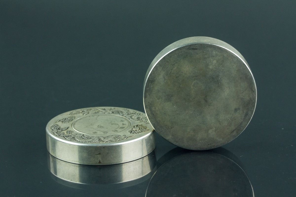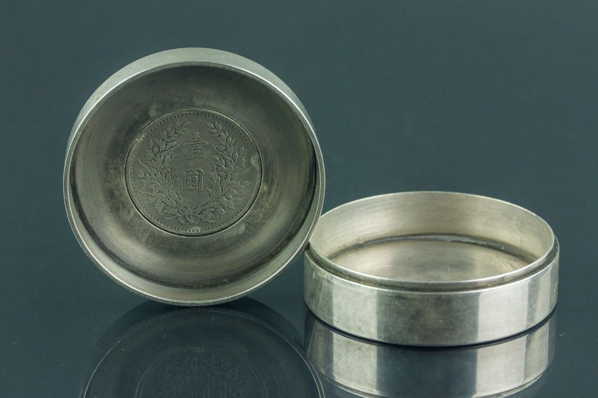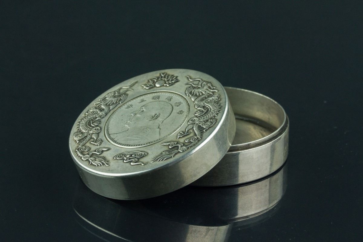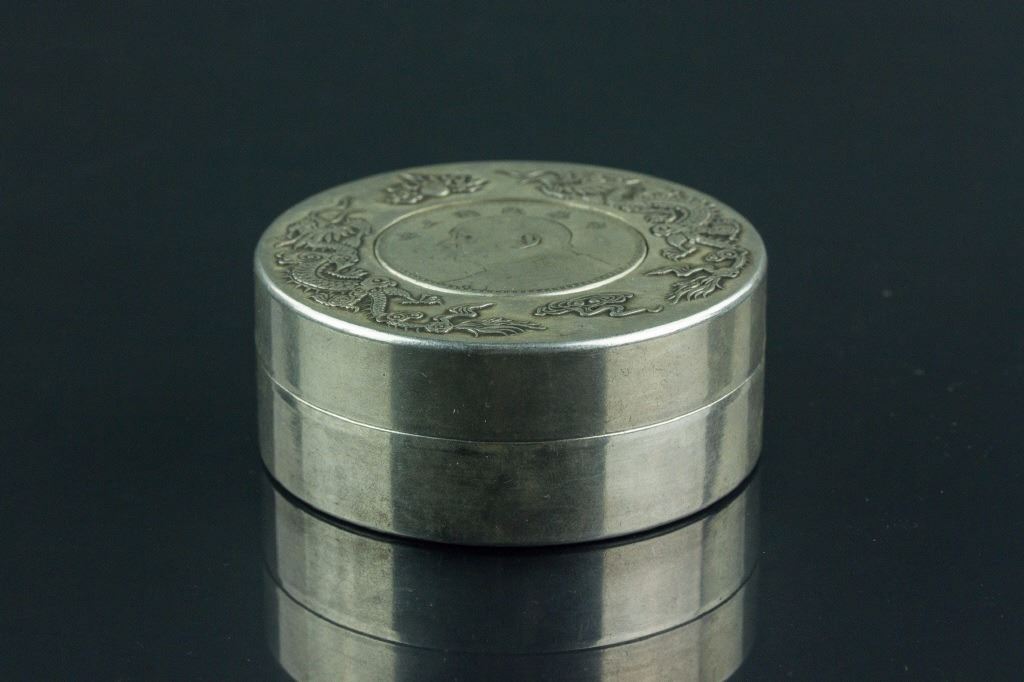 Chinese fine silver case with cover; of cylindrical form; the cover decorated with a pair of dragons in low relief; inlaid with one Yuan Shikai One Yuan coin made the 3rd Year of the Republic; H: 3 cm, D: 7 cm, 333 grams