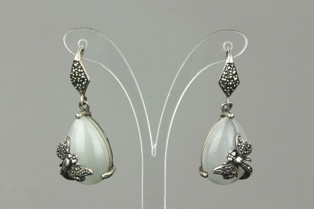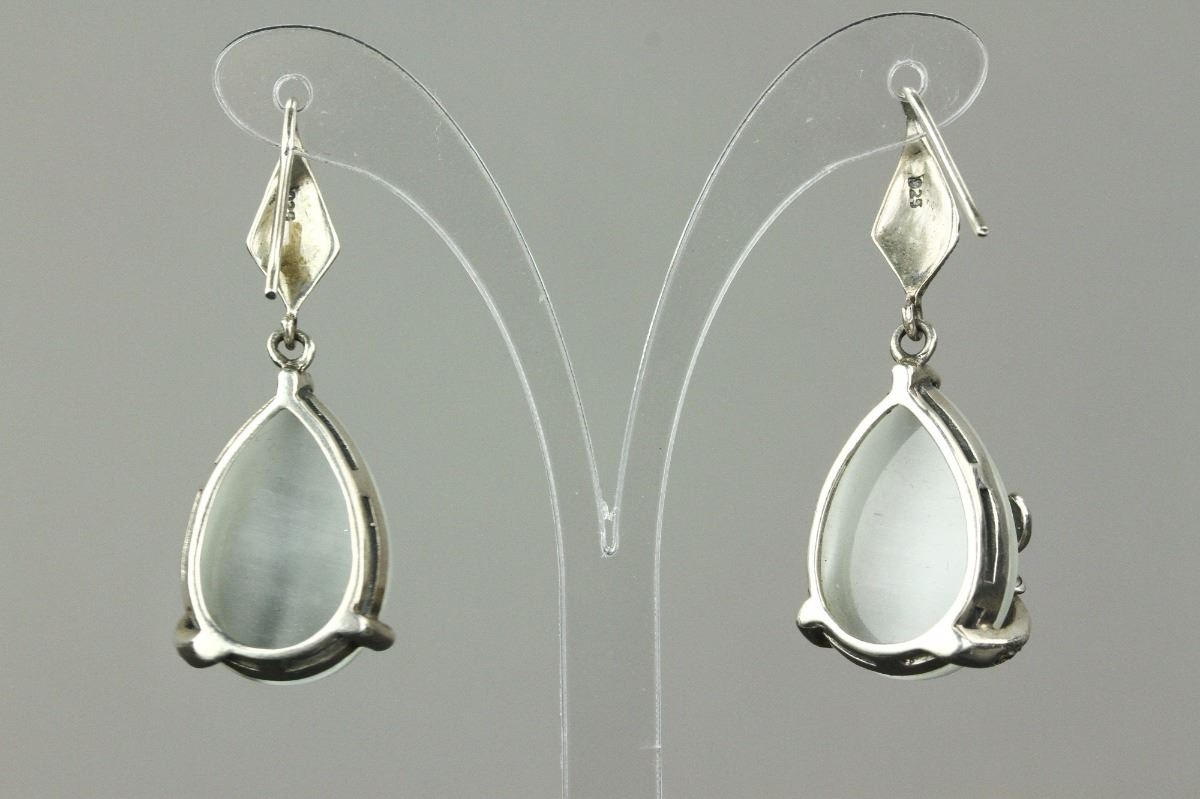 Chinese fine silver earrings; inlaid with teardrop-shaped gemstone; 925 mark on back; H: 2.5 cm, W: 1.5 cm, Both 14 grams