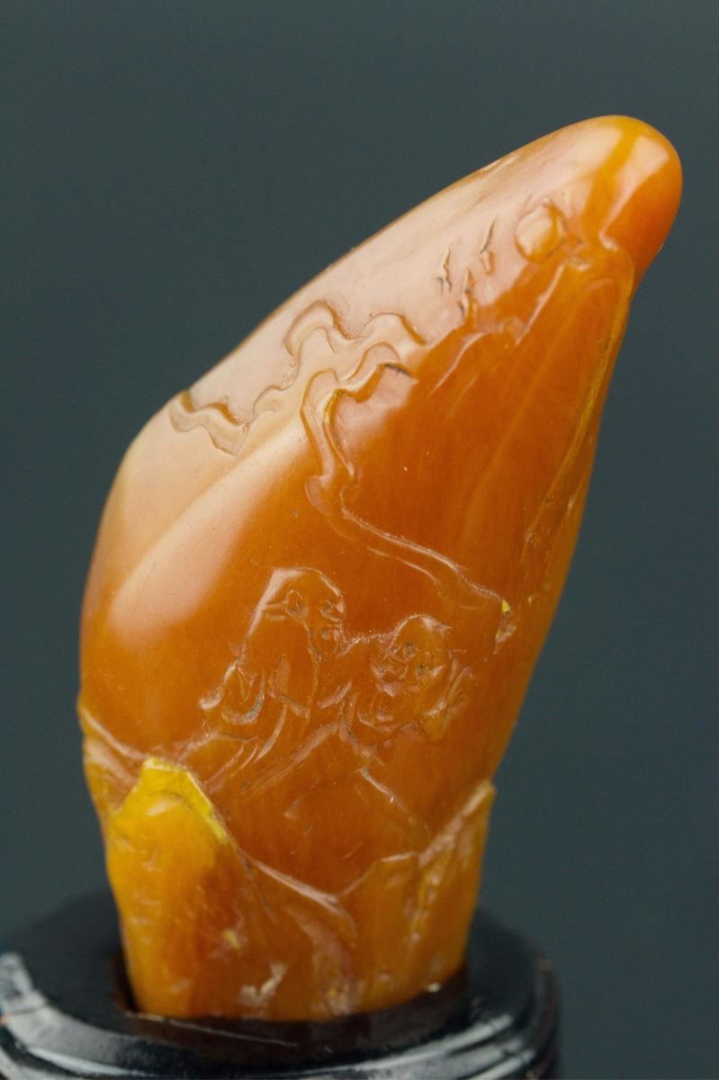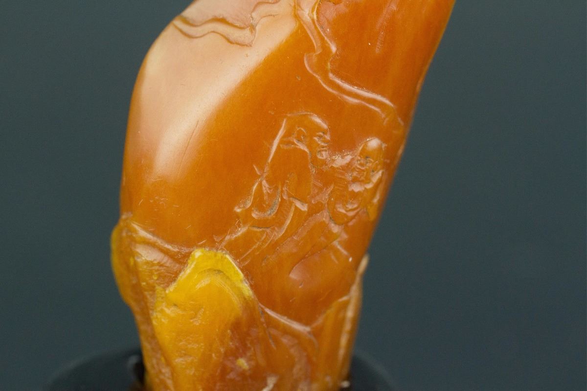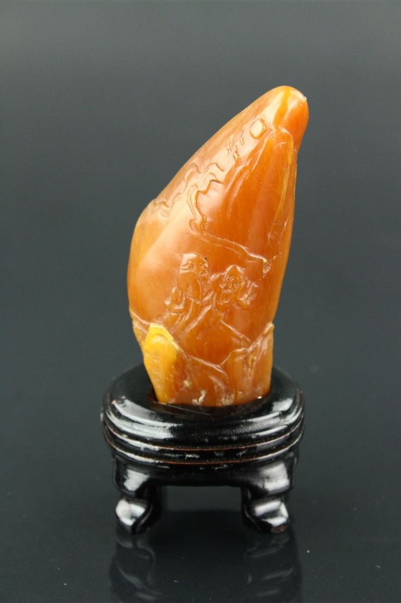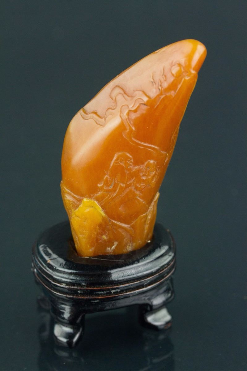 Chinese fine Tianhuang stone carved boulder; of natural form; featuring figures and landscape in low relief; of honey yellow tone; uncarved base; with custom-made wood stand and case; H: 8 cm, W: 3 cm, 61 grams