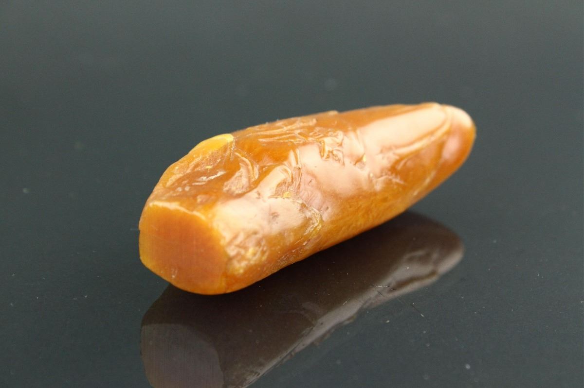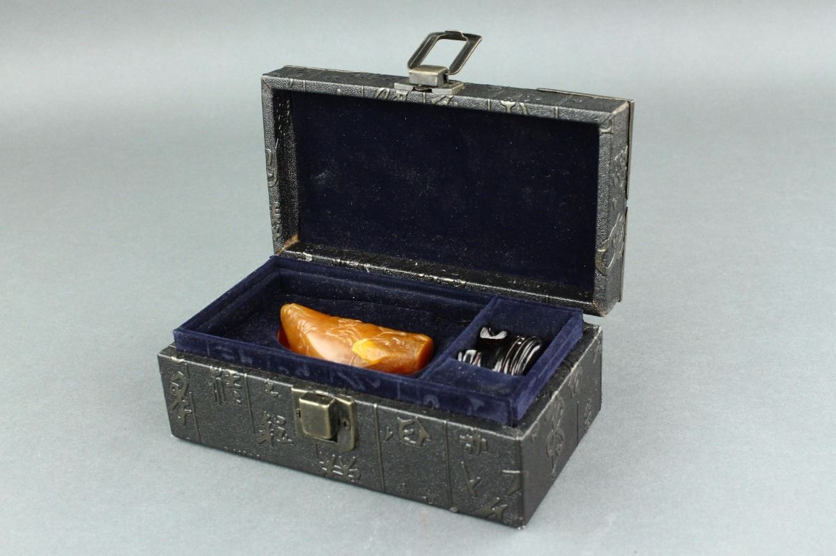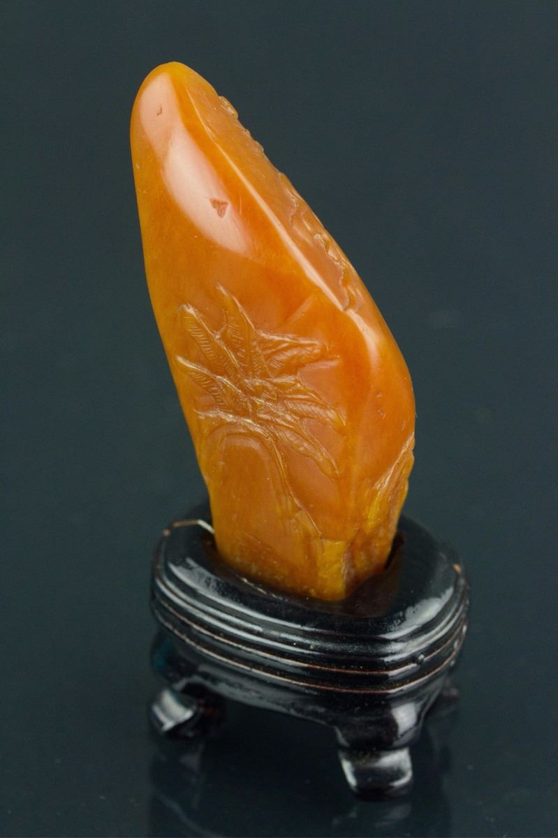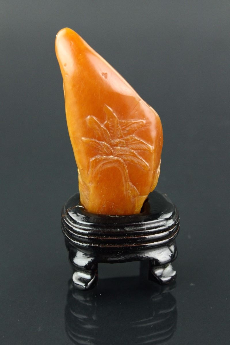 Chinese fine Tianhuang stone carved boulder; of natural form; featuring figures and landscape in low relief; of honey yellow tone; uncarved base; with custom-made wood stand and case; H: 8 cm, W: 3 cm, 61 grams