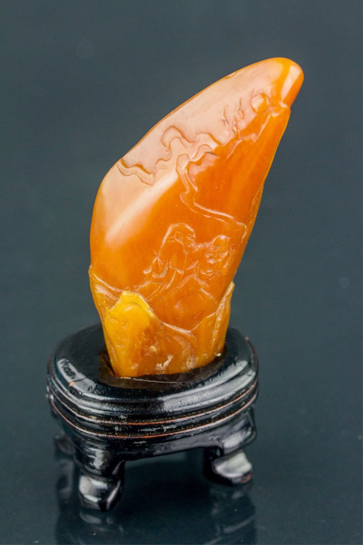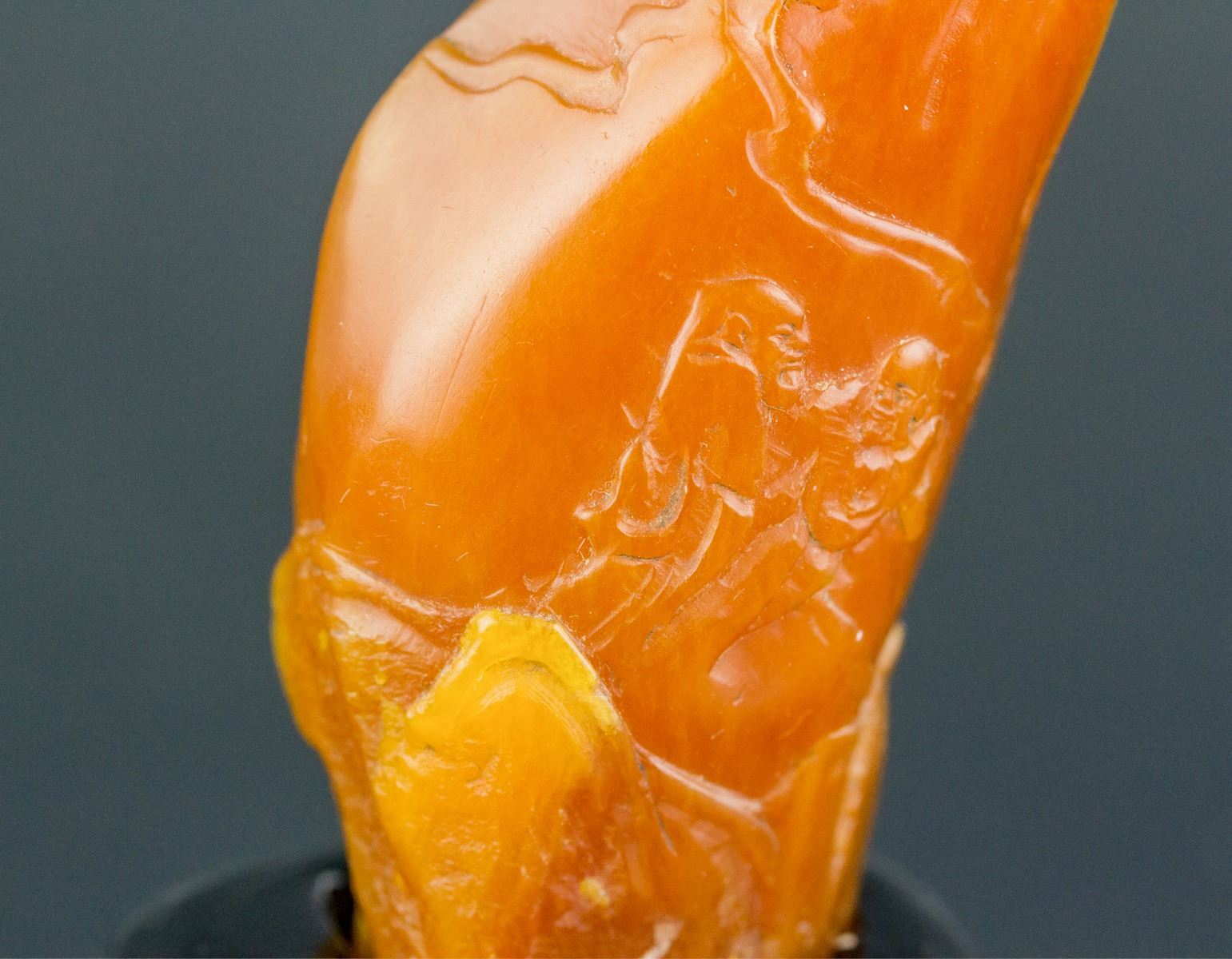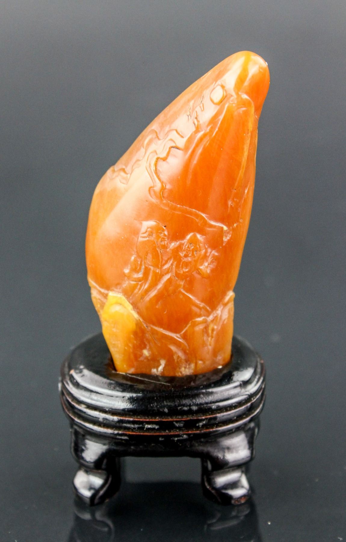 Chinese fine Tianhuang stone carved boulder; of natural form; featuring figures and landscape in low relief; of honey yellow tone; uncarved base; with custom-made wood stand and case; H: 8 cm, W: 3 cm, 61 grams