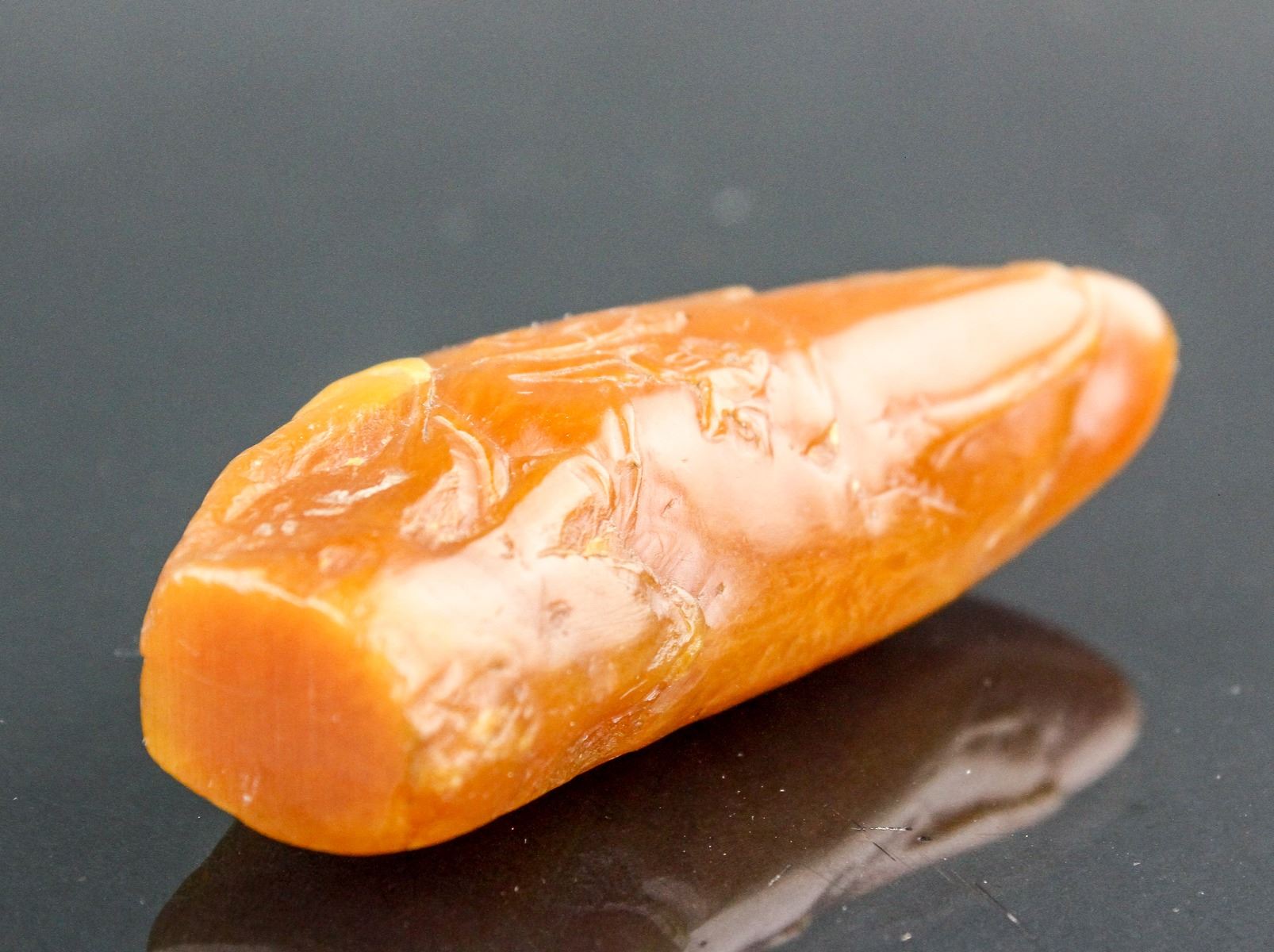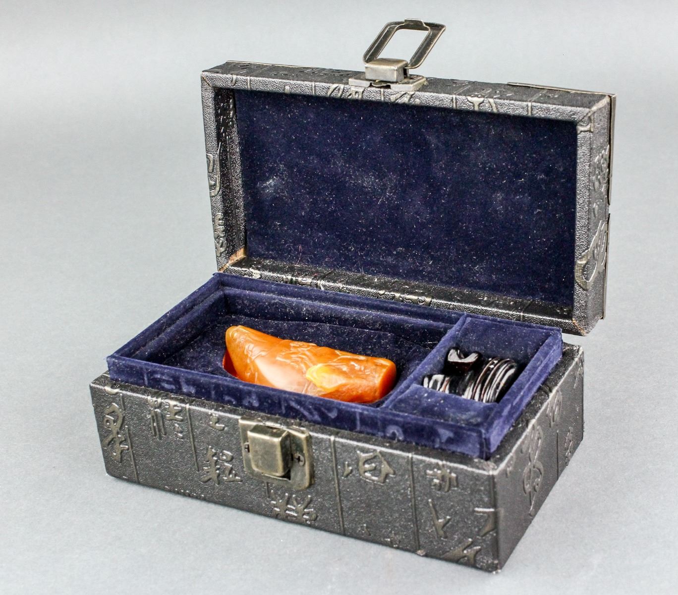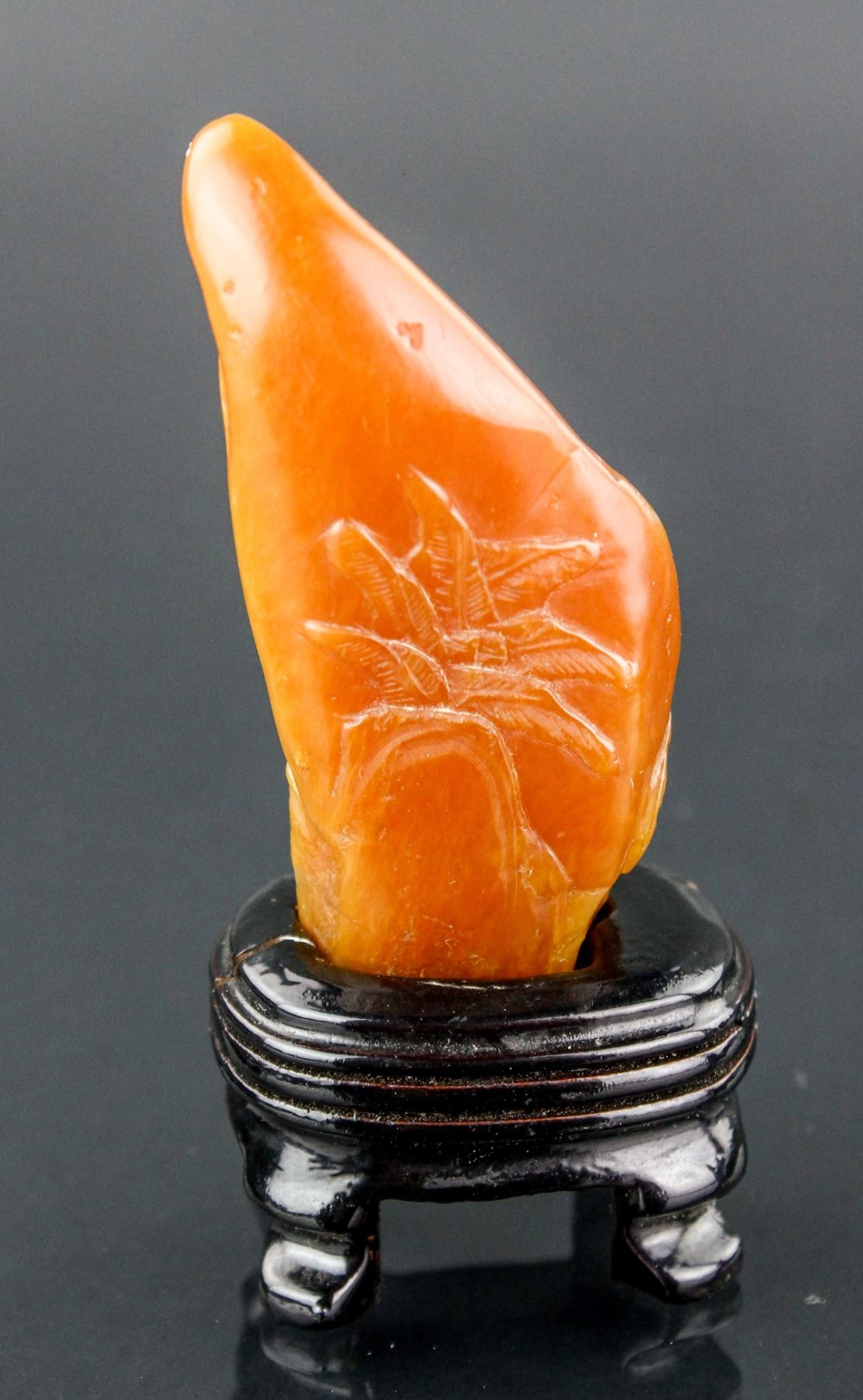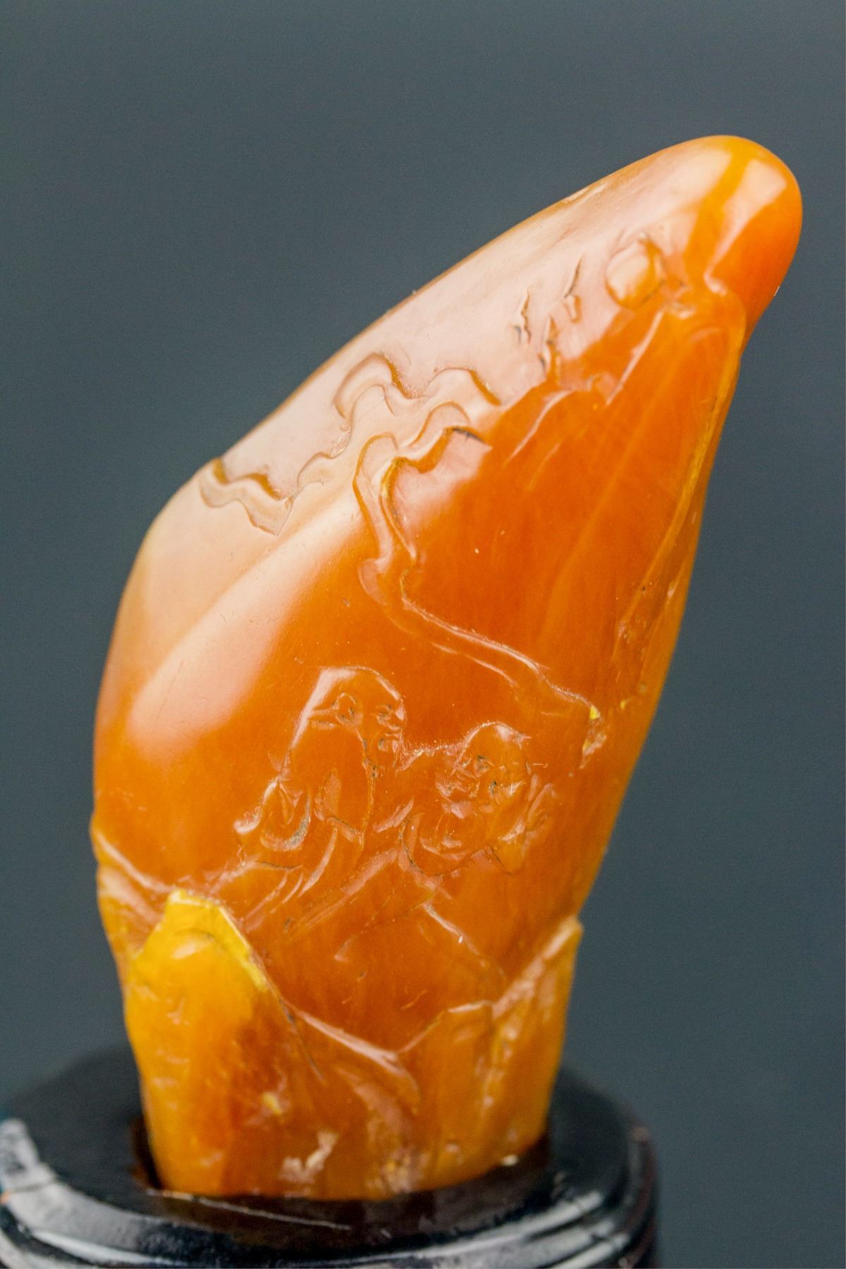 Chinese fine Tianhuang stone carved boulder; of natural form; featuring figures and landscape in low relief; of honey yellow tone; uncarved base; with custom-made wood stand and case; H: 8 cm, W: 3 cm, 61 grams