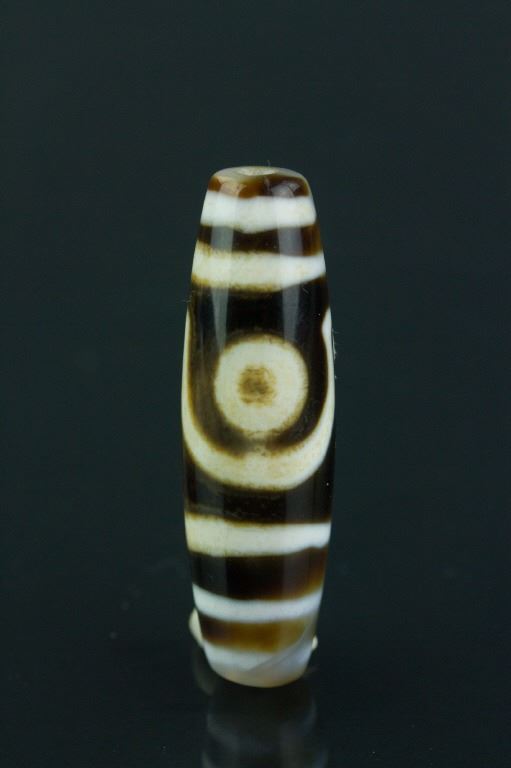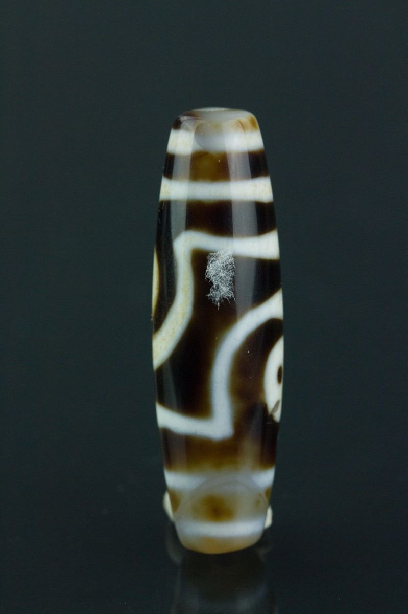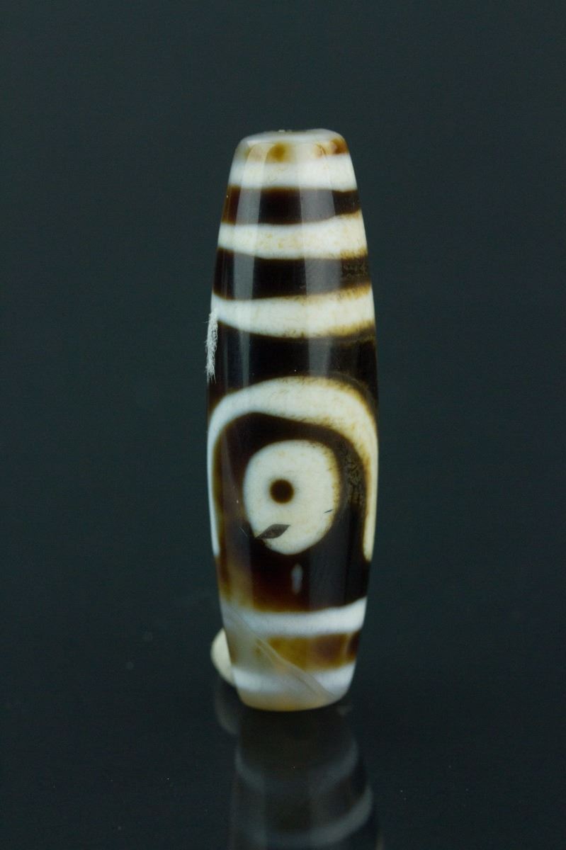 Chinese fine Tianzhu bead; of elongated oval form; featuring two eyes and white stripes on brown ground; pierced vertically for suspension; W: 0.7 cm, L: 4.5 cm, 11 grams