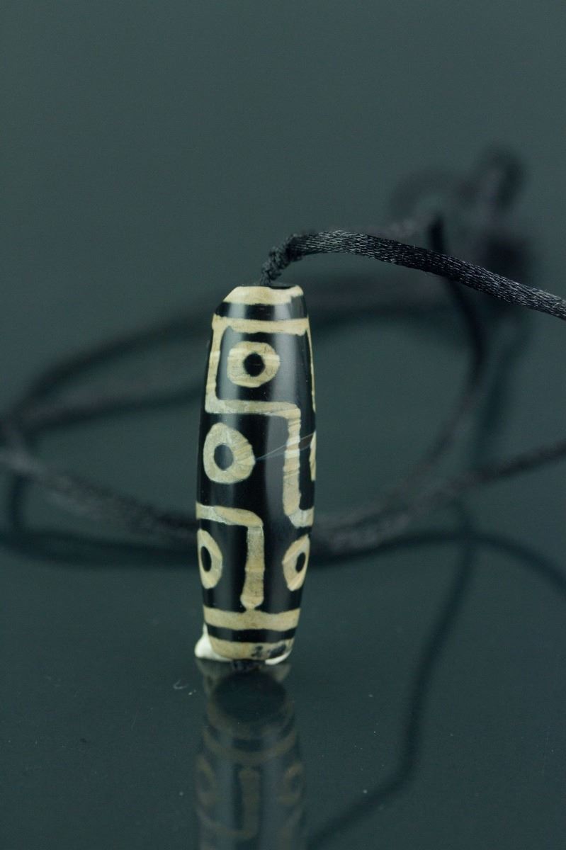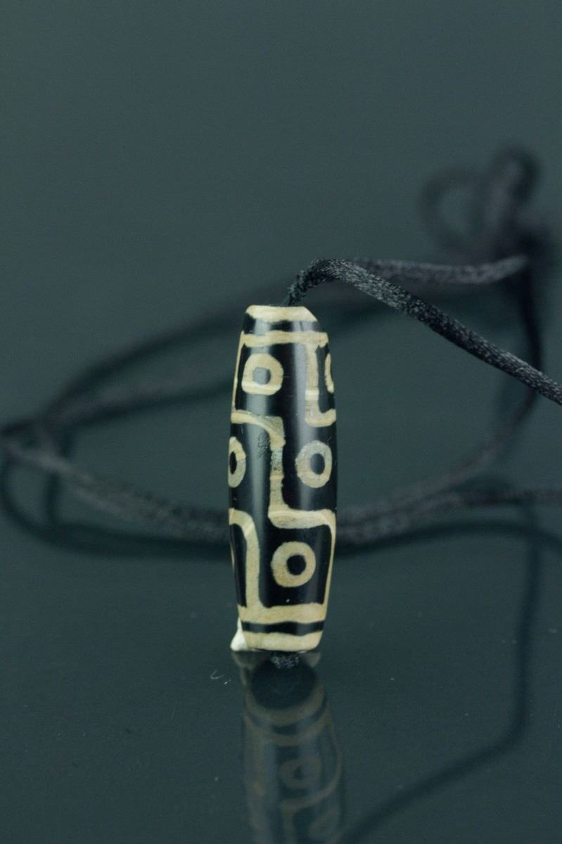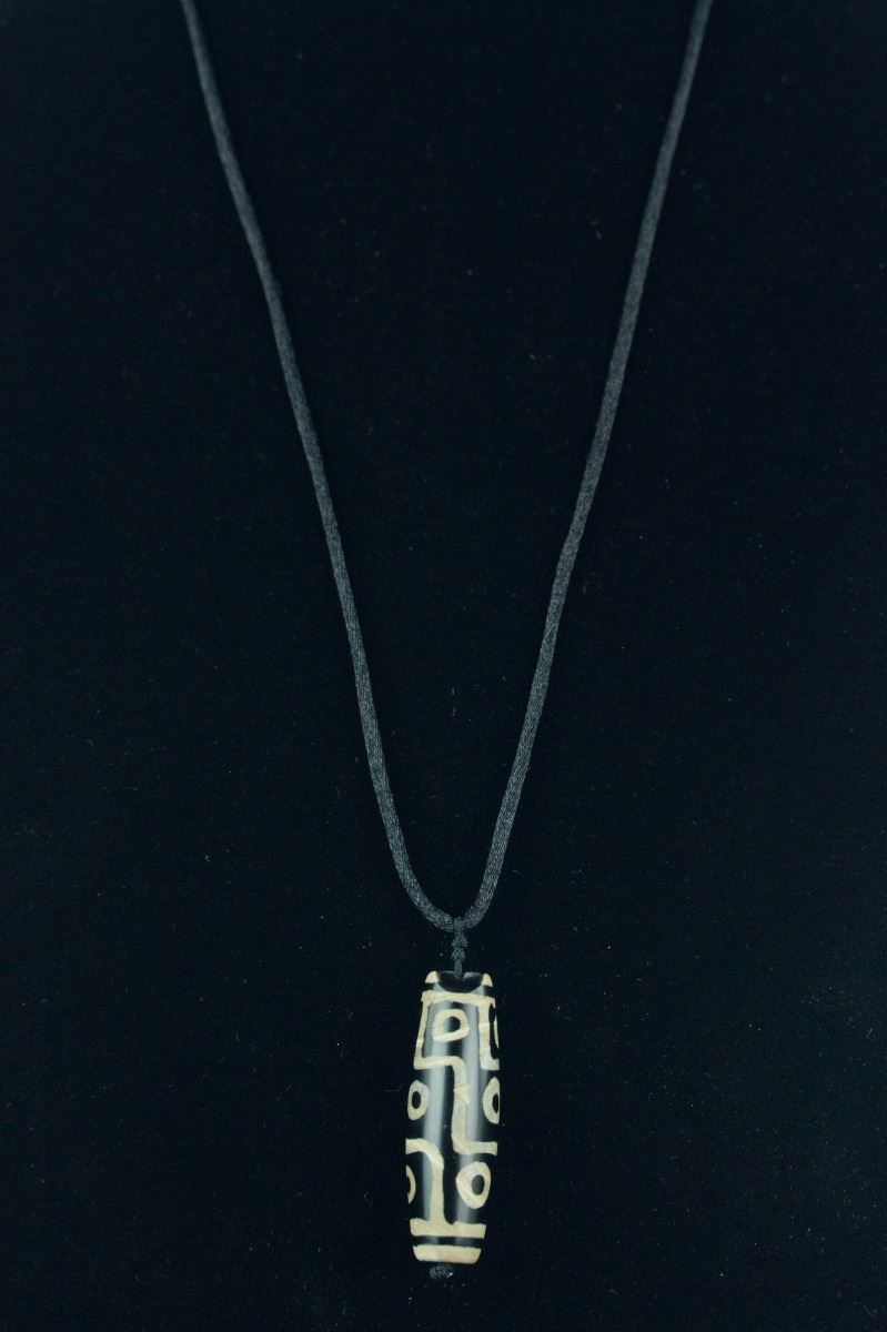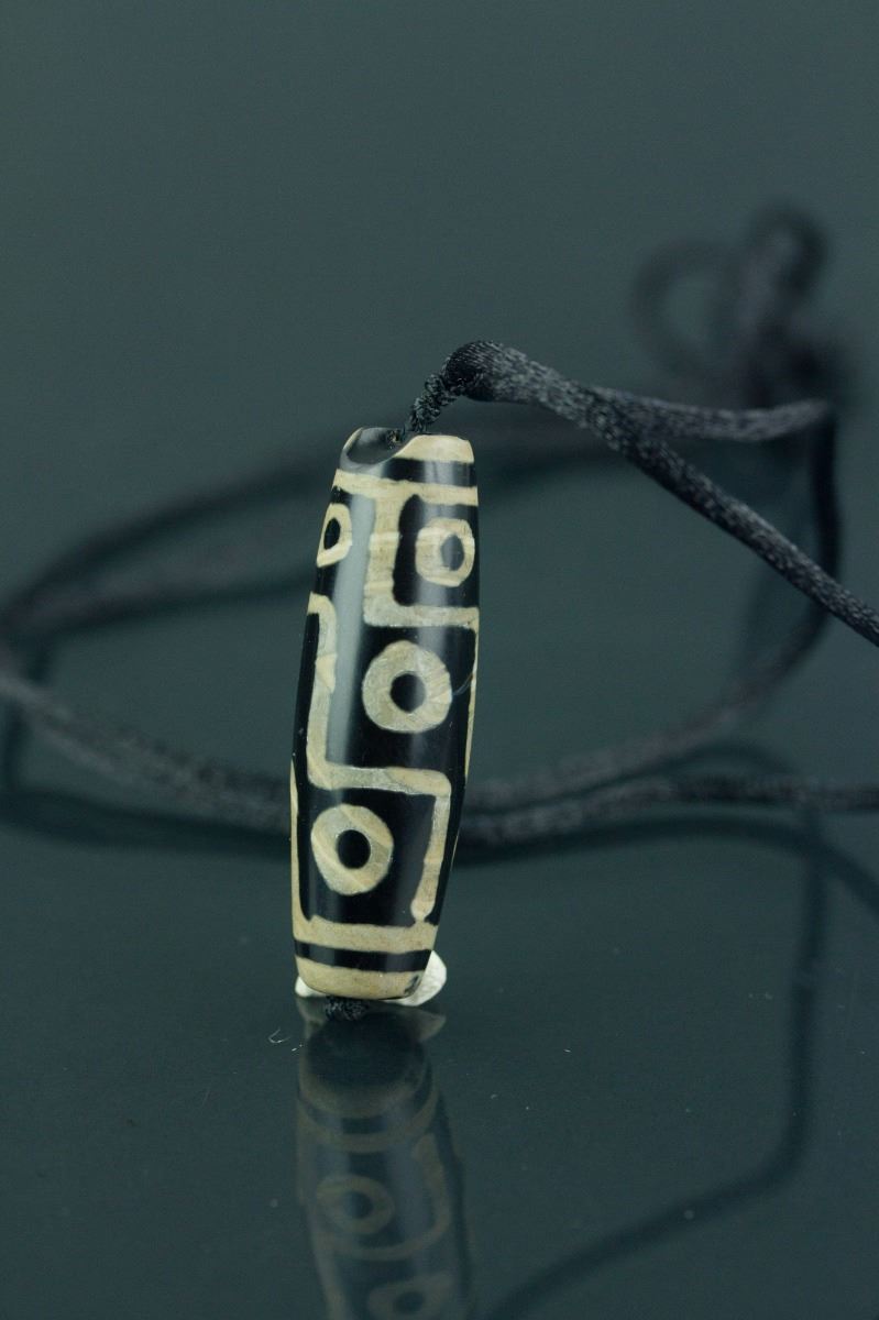 Chinese fine Tianzhu bead; of elongated body; featuring white-stripe patterns and circular eyes on body; H: 5 cm, W: 1 cm, 20 grams