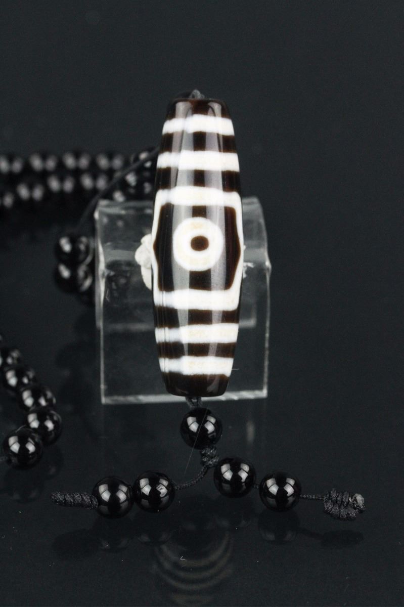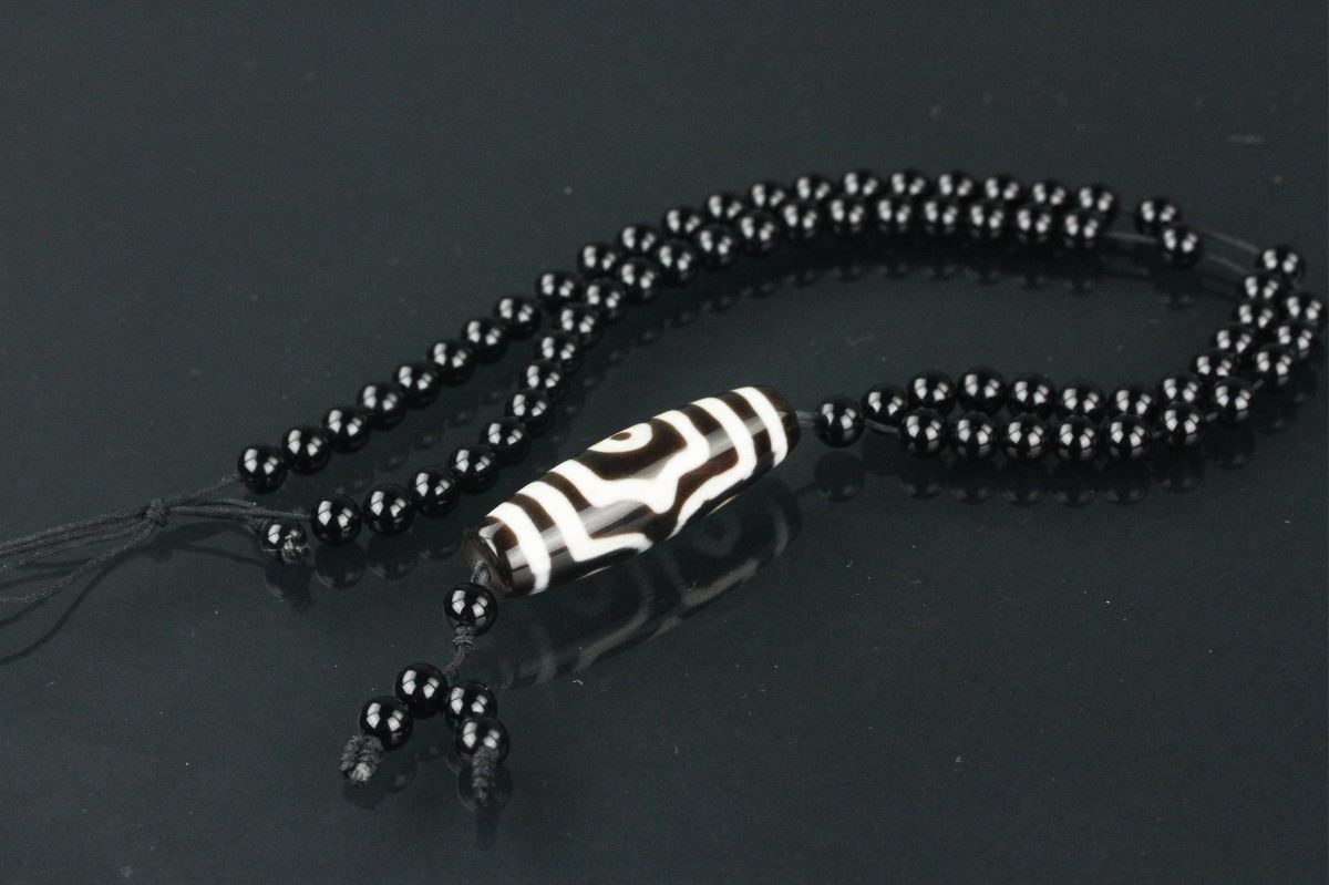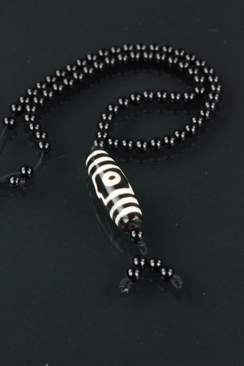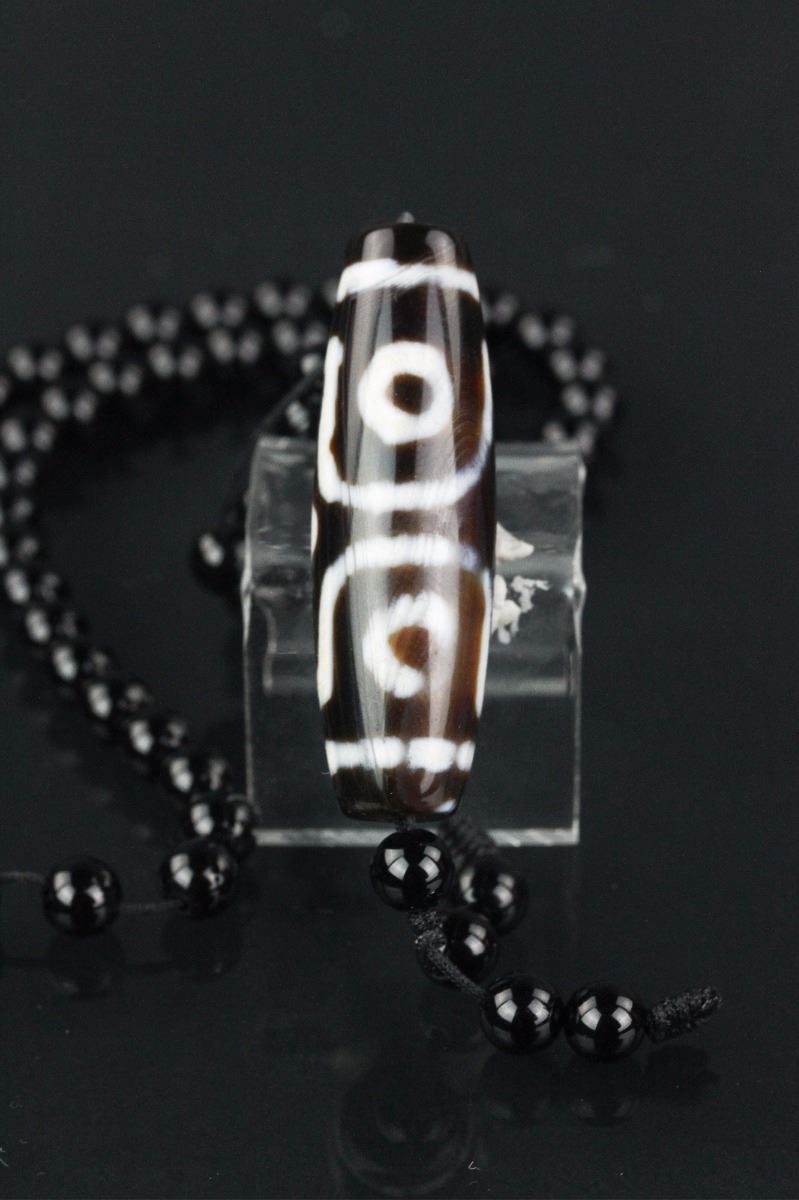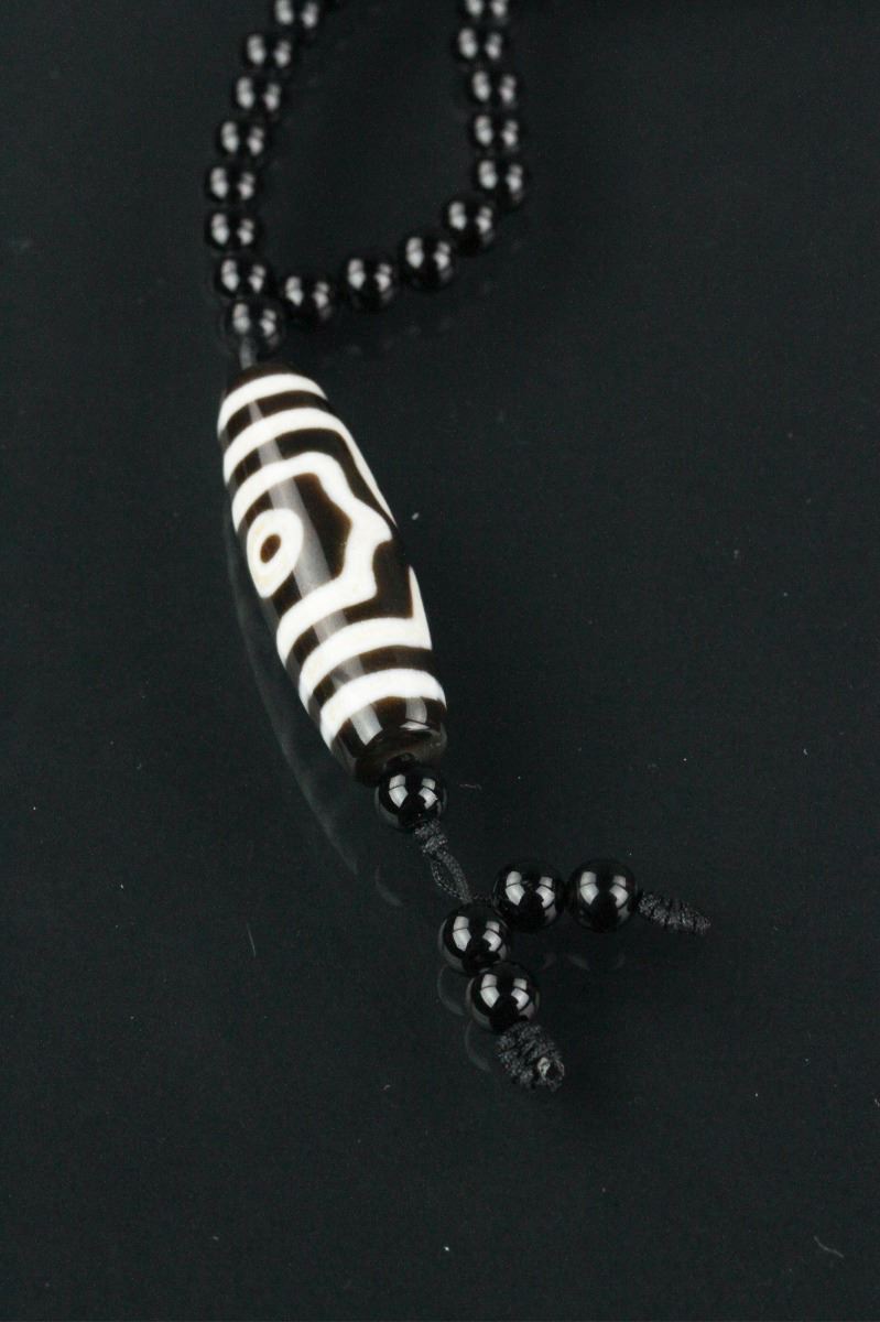 Chinese fine Tianzhu pendant necklace; of ovoid form with three eyes; suspending on black stone beads necklace; L: 37 cm, Tianzhu L: 4.5 cm, 36 grams