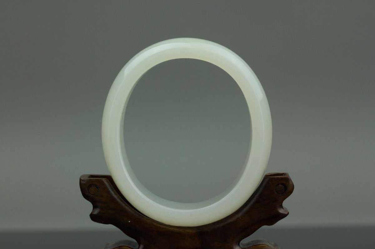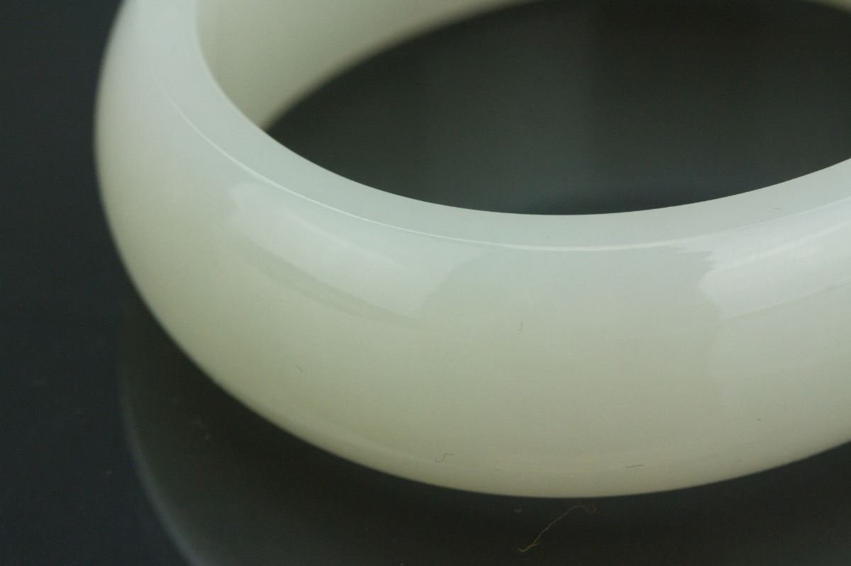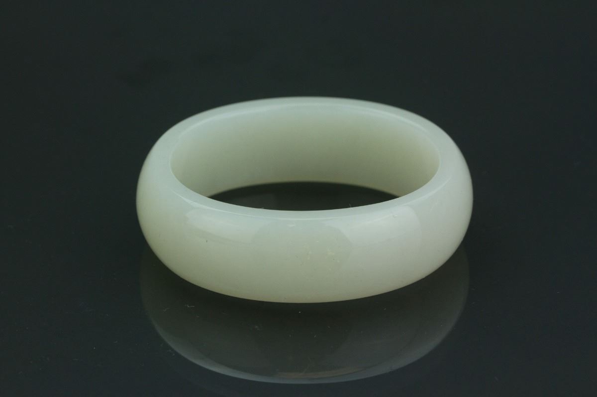 Chinese white jade oval bangle; rounded outside and flatten inside; D: 2.25 cm, 6 cm, 62 grams; Density: 2.92