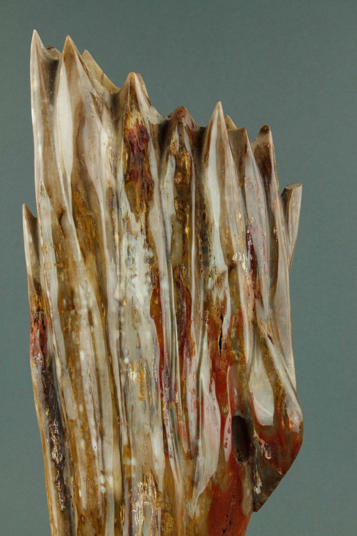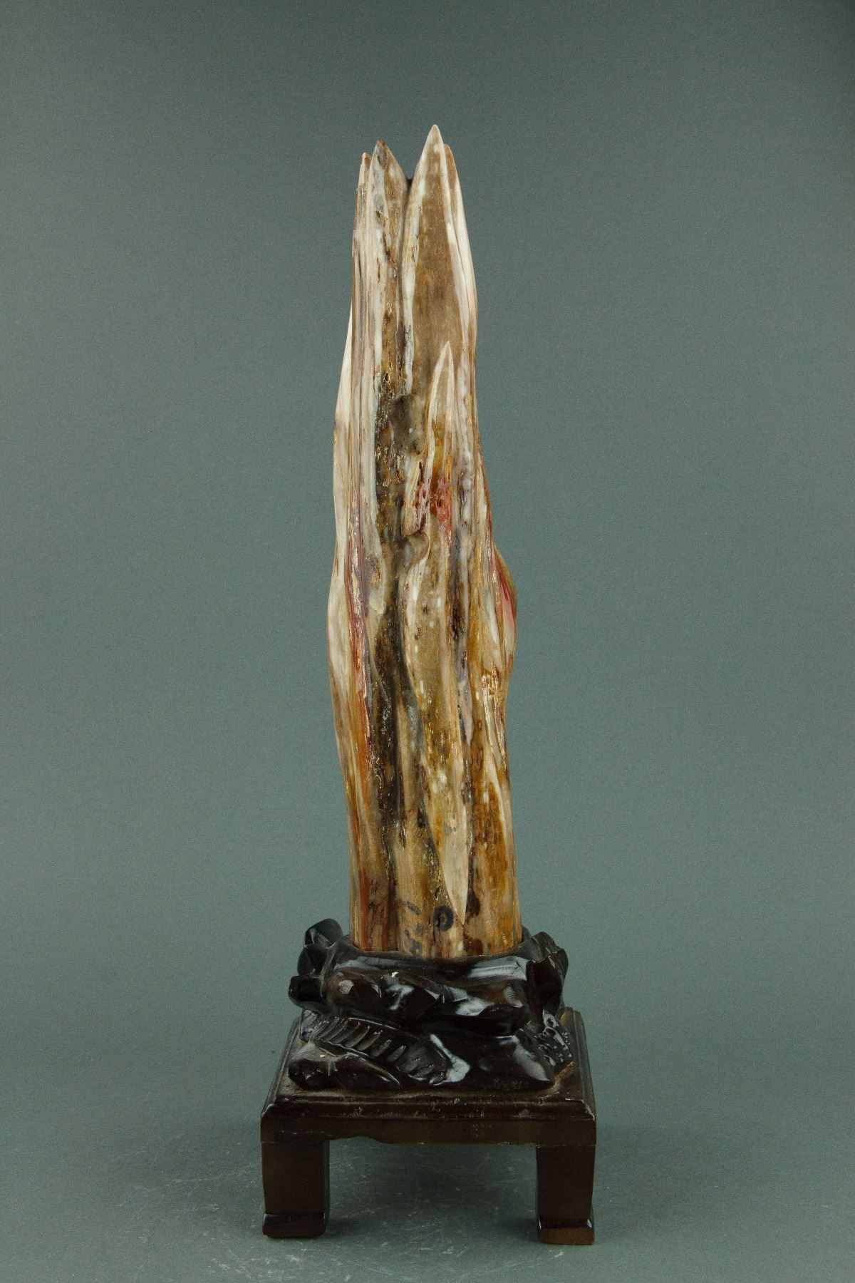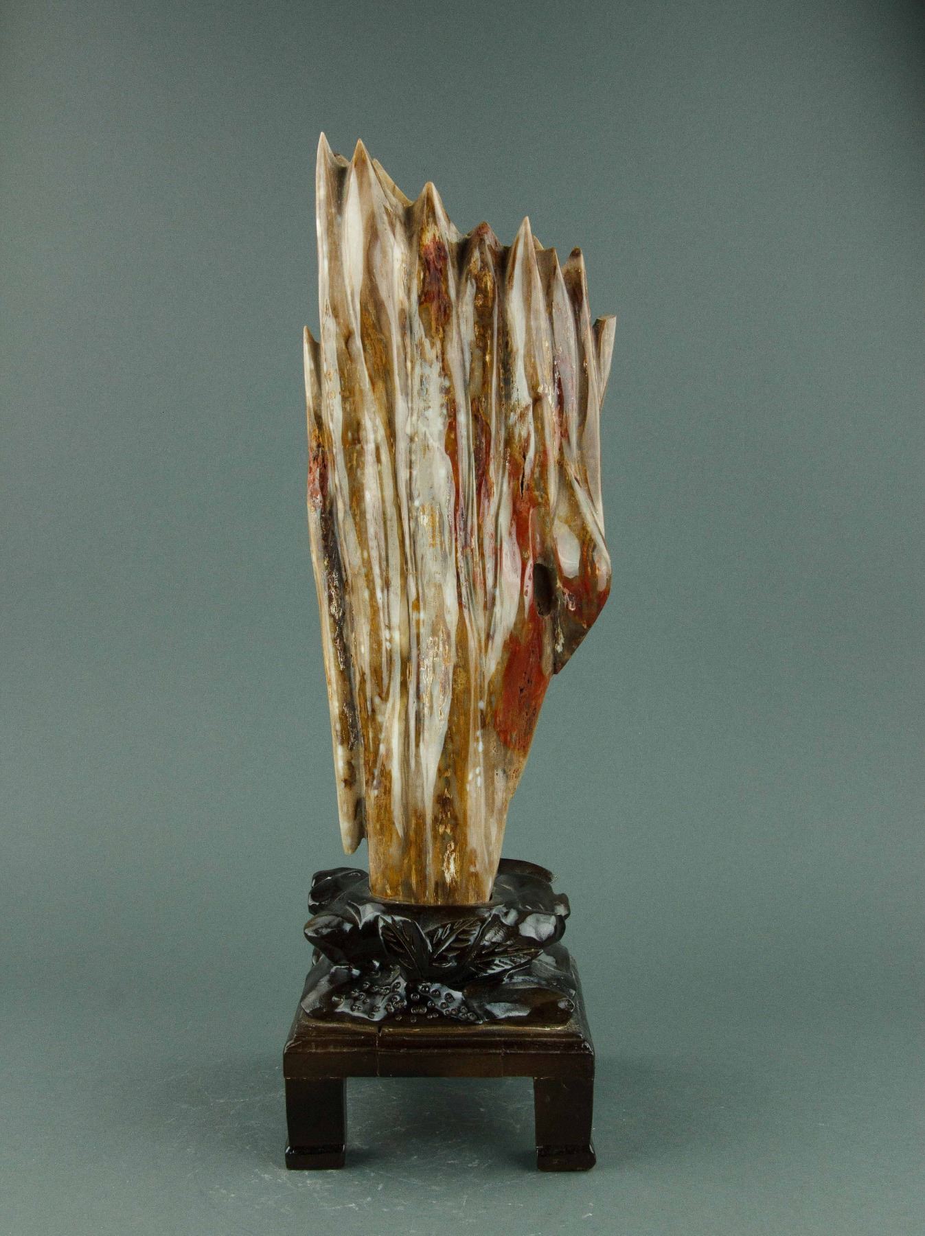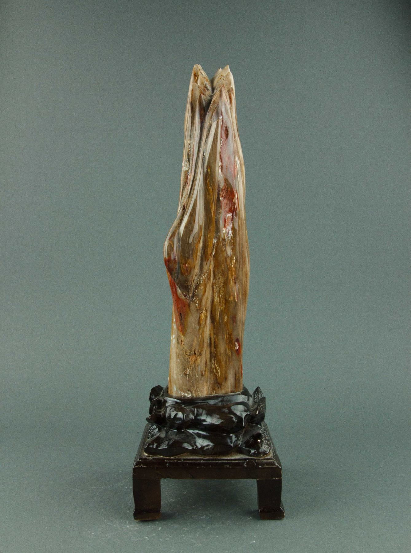 Chinese wood fossil with stand; the petrified wood of mixed brown tone; on custom-made wood stand; H: 52 cm, W: 15 cm, 5 kilograms