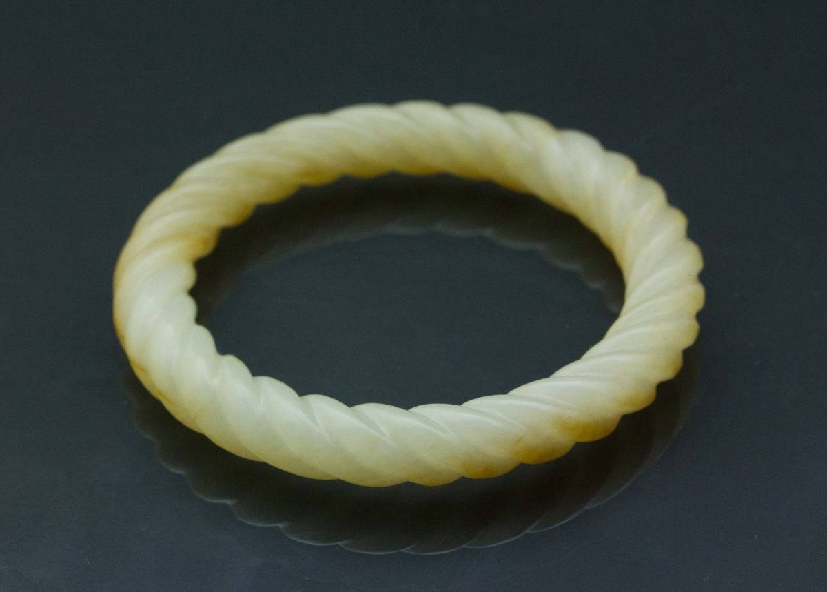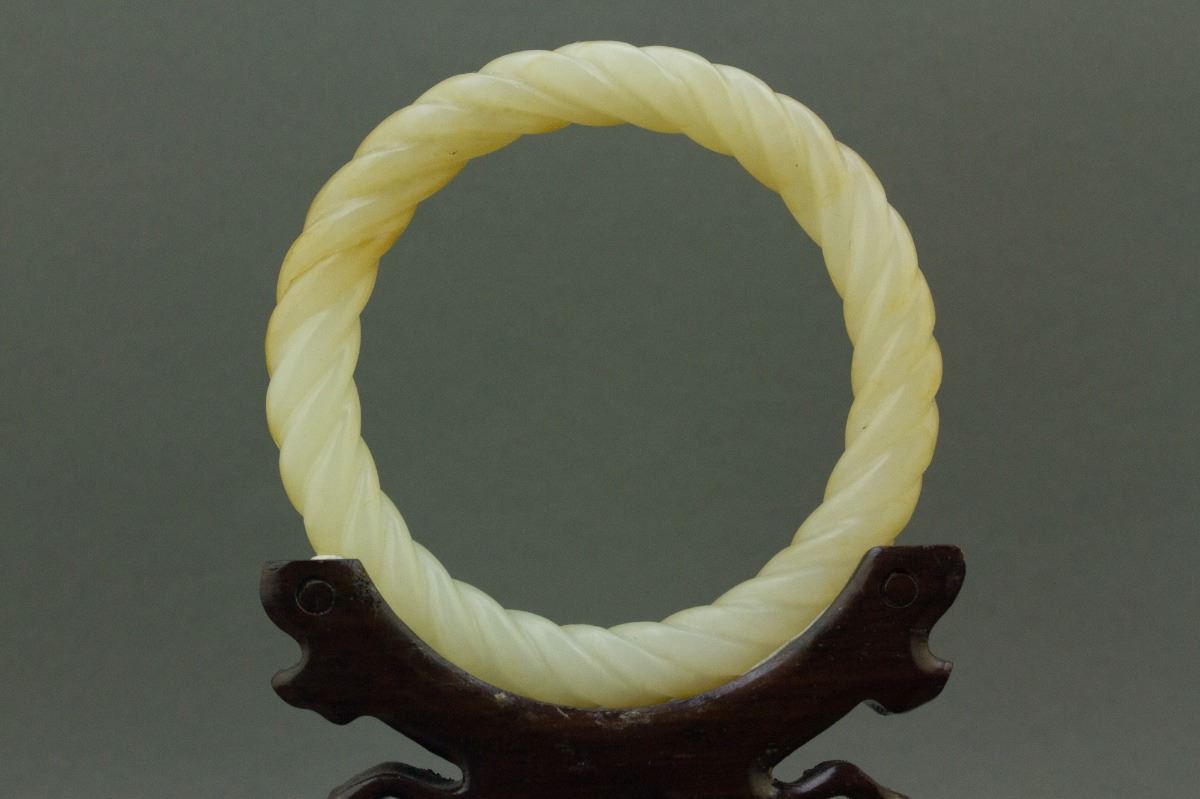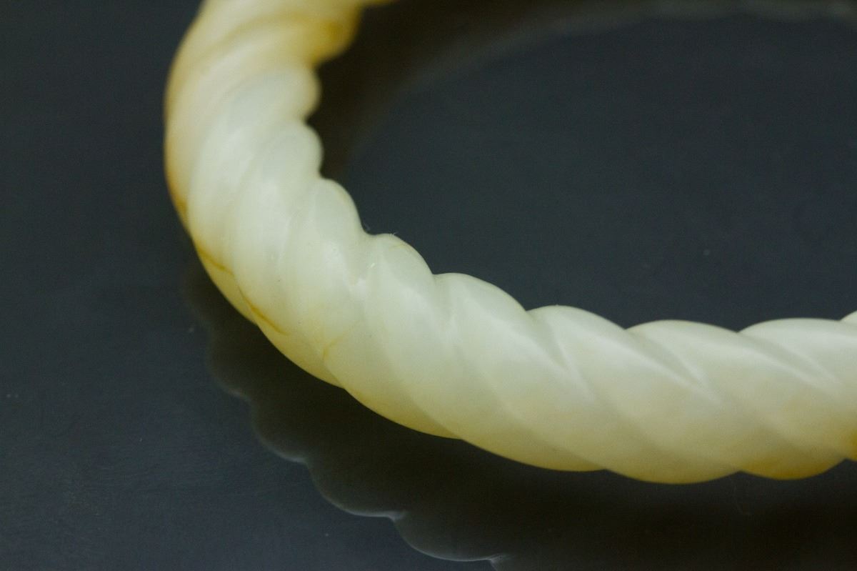 Chinese yellow jade bangle; with rope-twist simulated carvings; the stone of white tone with russet inclusions; D: 5.75 cm, 40 grams; Density: 2.93
