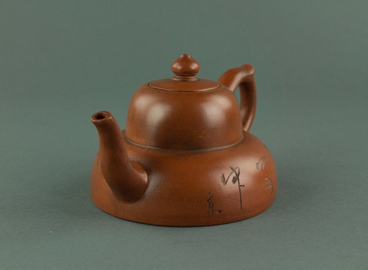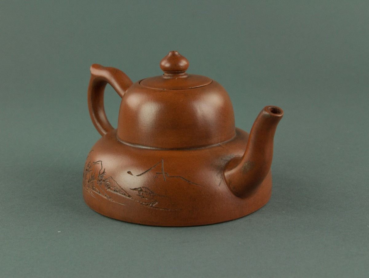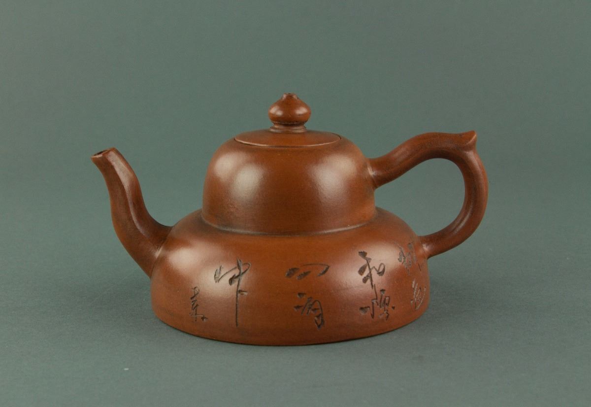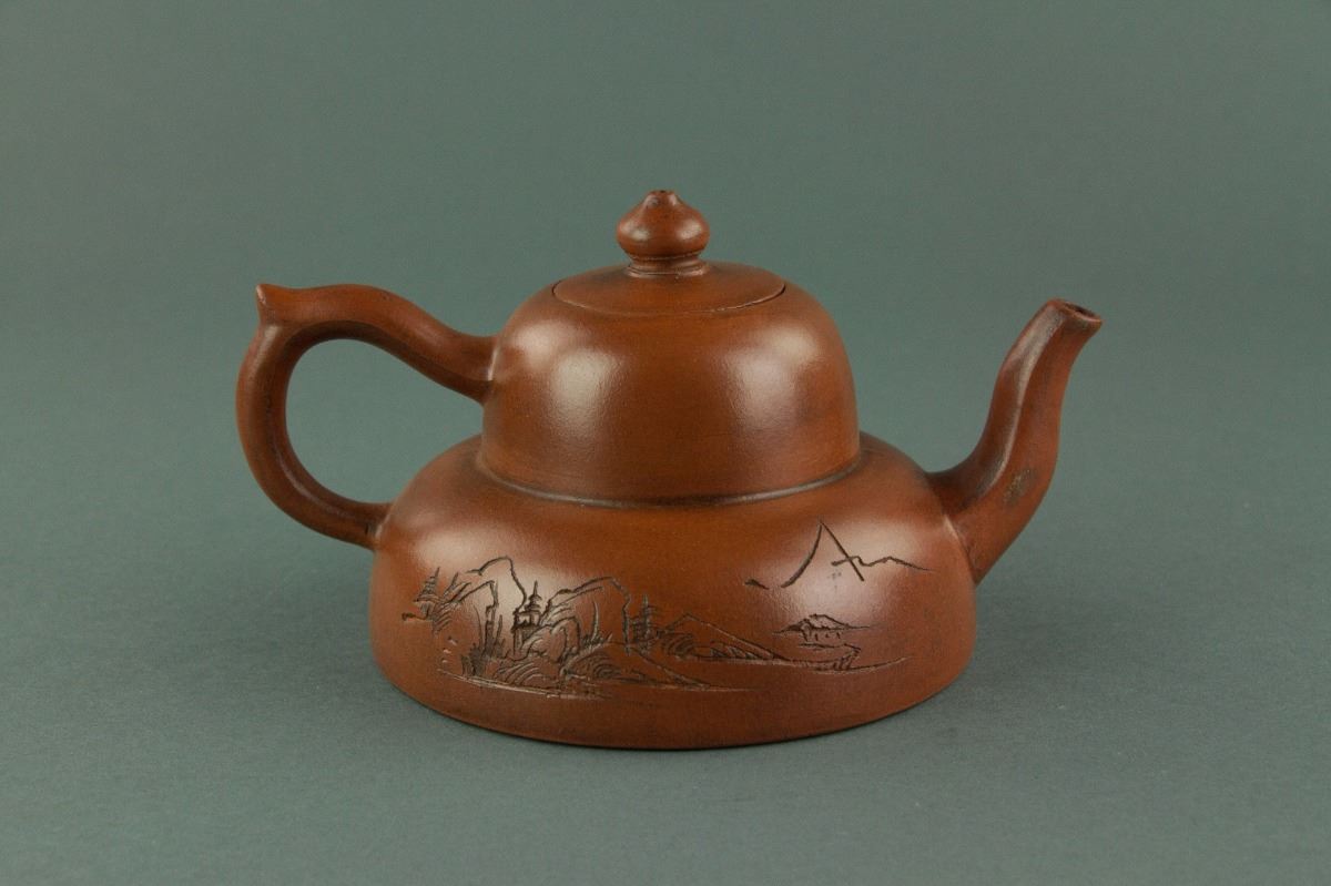 Chinese fine Zisha teapot with cover; of dome-shaped body surrmounted by a mallet-shaped top; flanked by curved handle and spout; incised with landscape and cursive script calligraphy on body; four-character He Shi Shi Lin artist seal on base; H: 11 cm, W: 19 cm, 412 grams