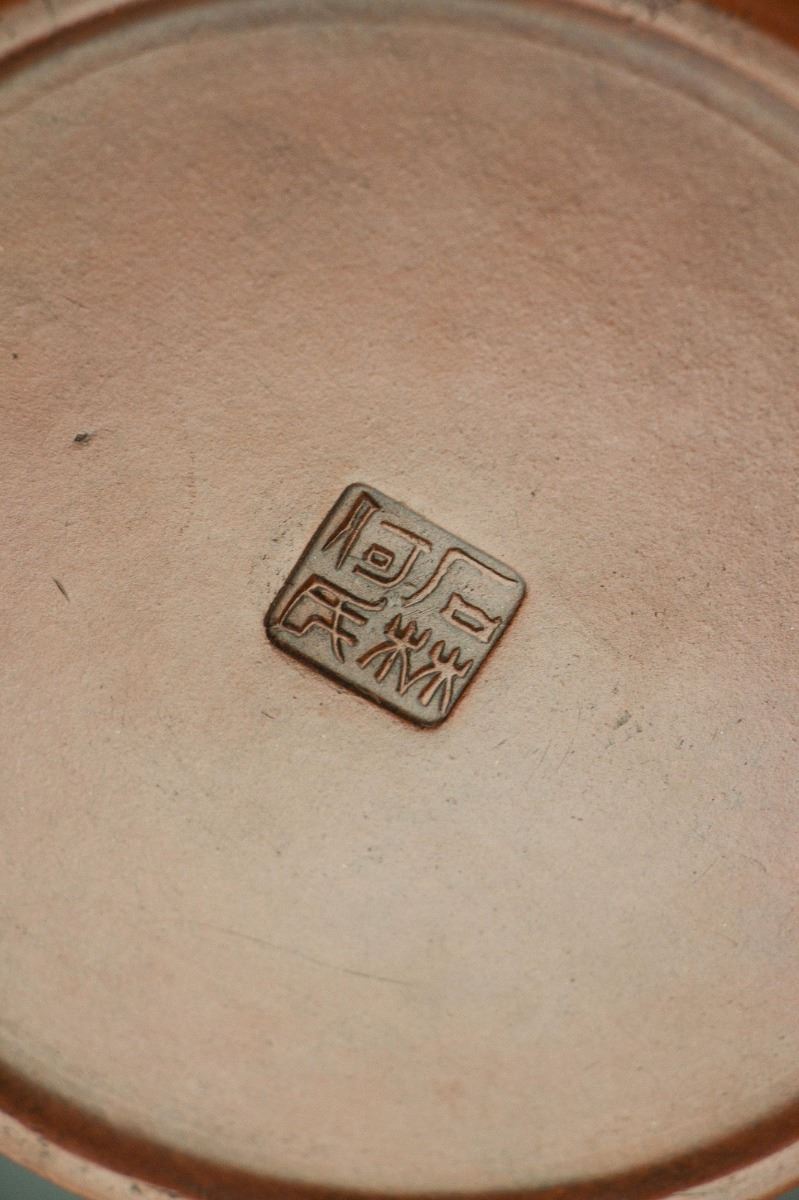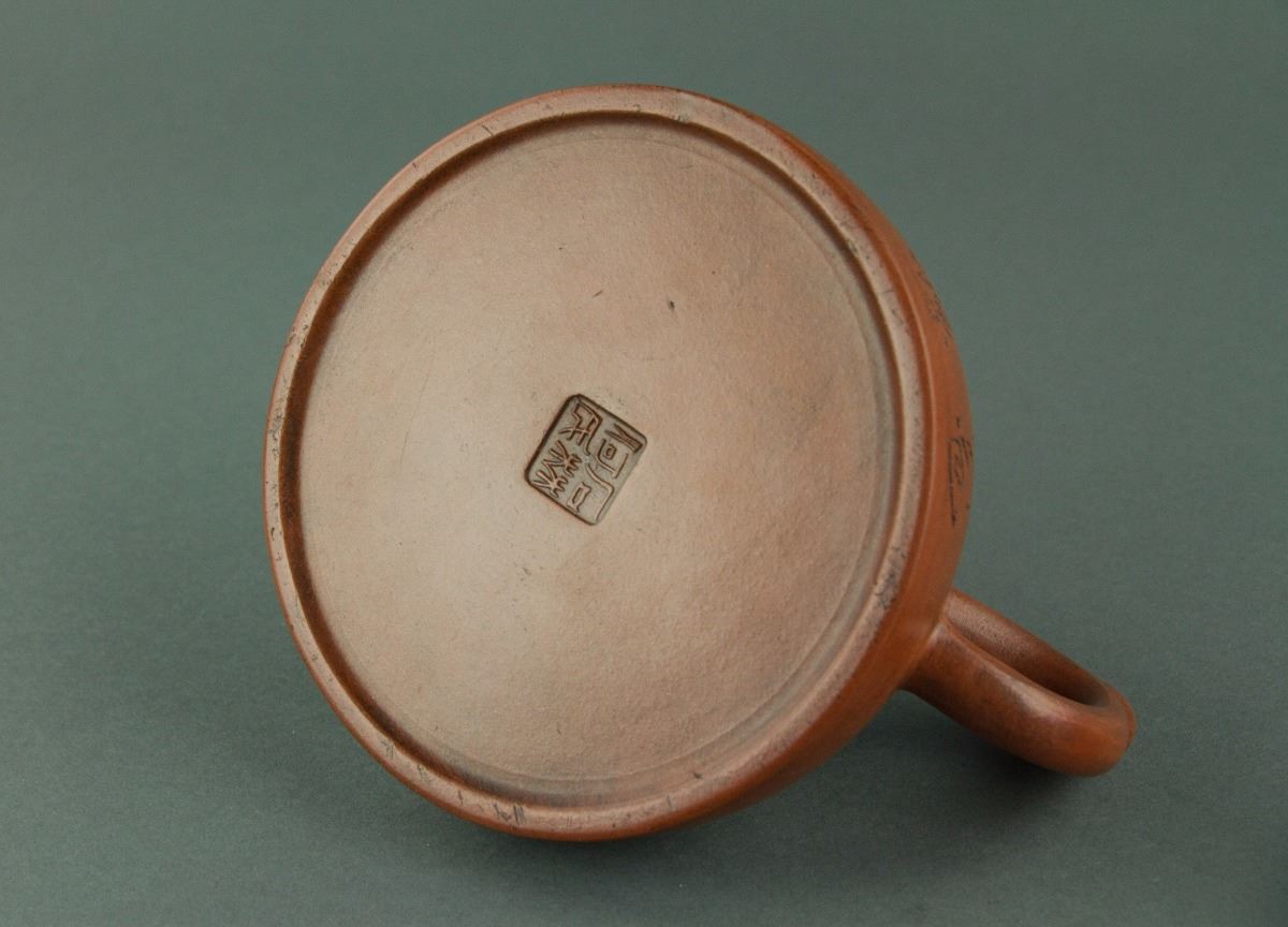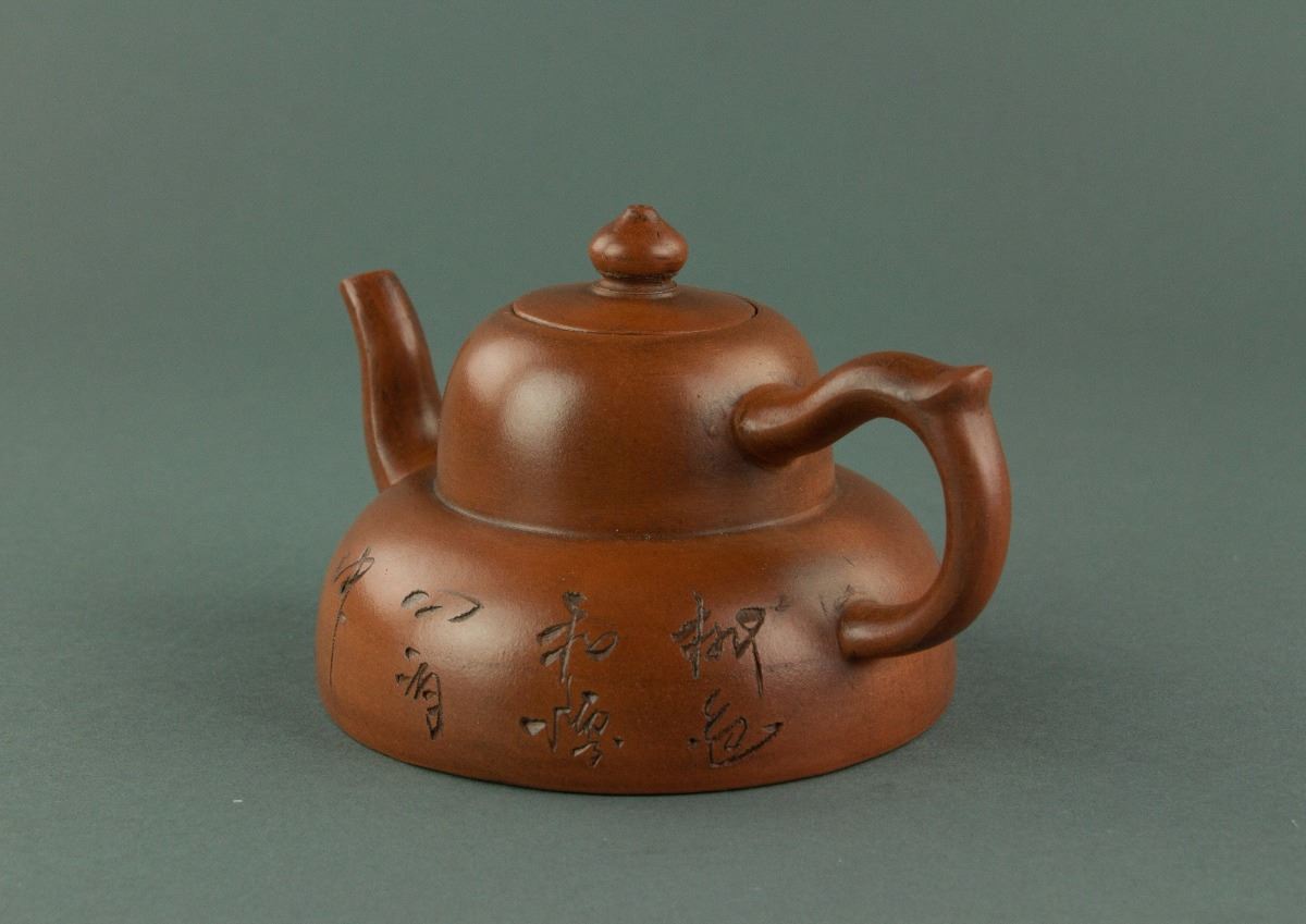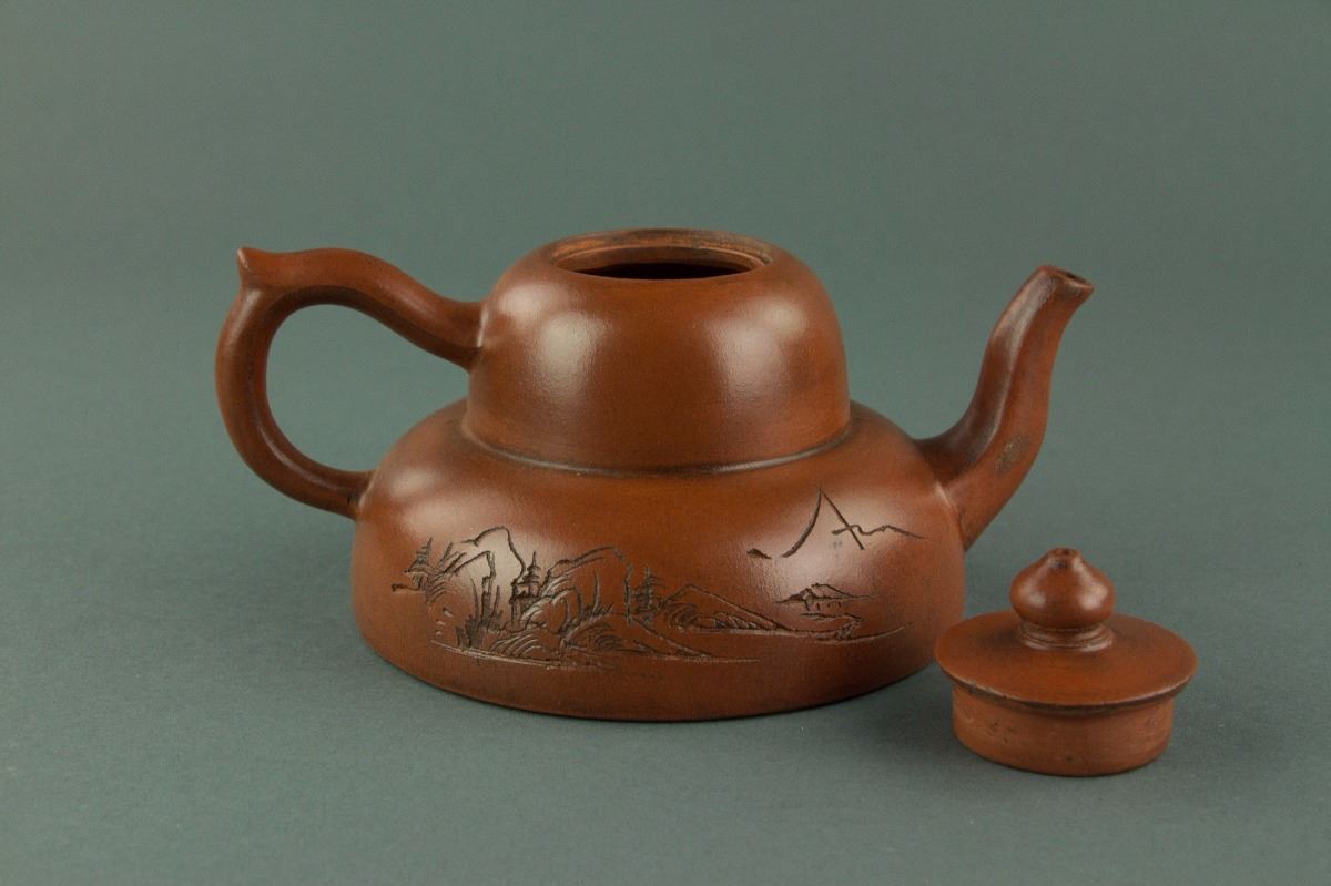Chinese fine Zisha teapot with cover; of dome-shaped body surrmounted by a mallet-shaped top; flanked by curved handle and spout; incised with landscape and cursive script calligraphy on body; four-character He Shi Shi Lin artist seal on base; H: 11 cm, W: 19 cm, 412 grams