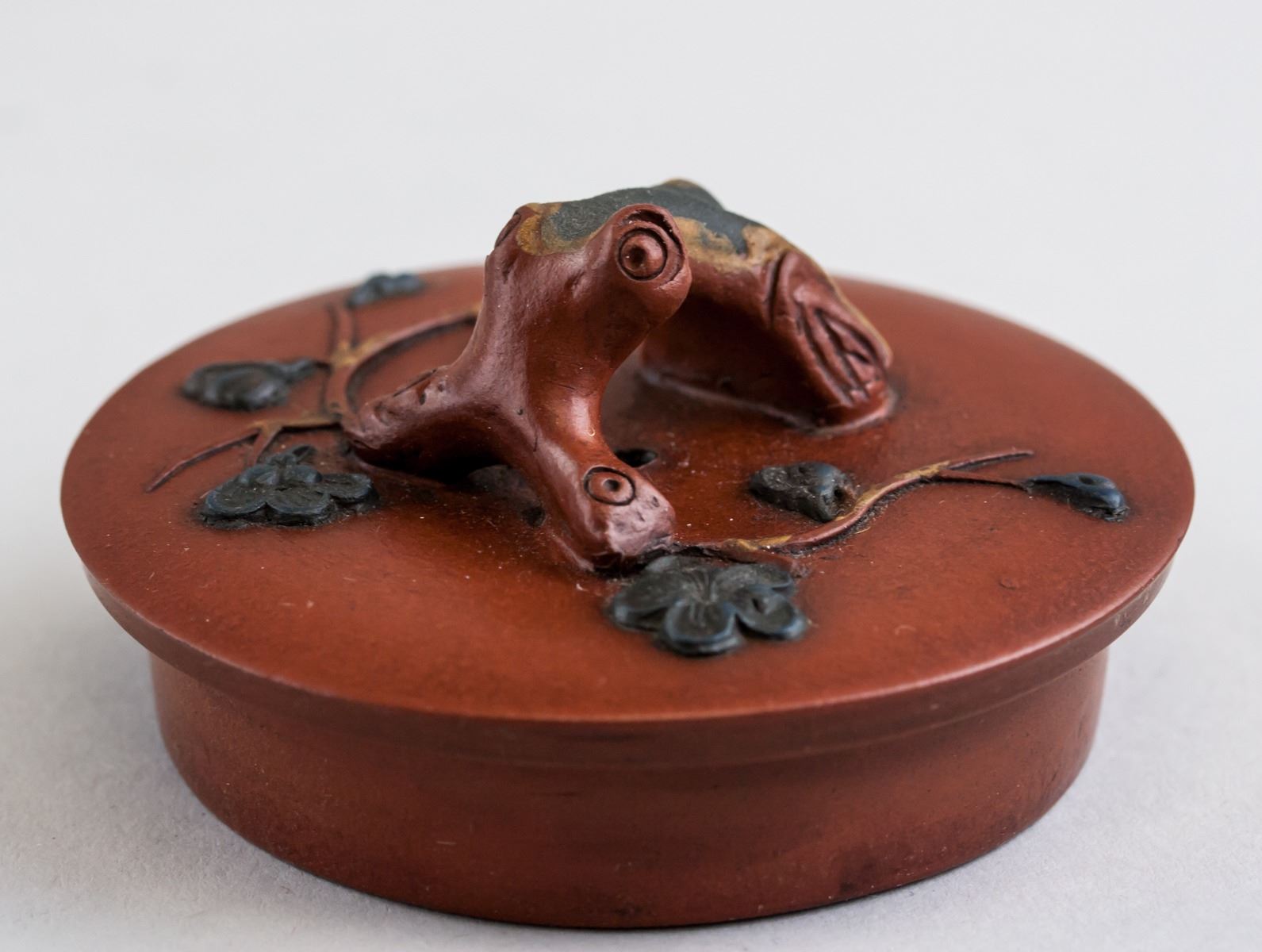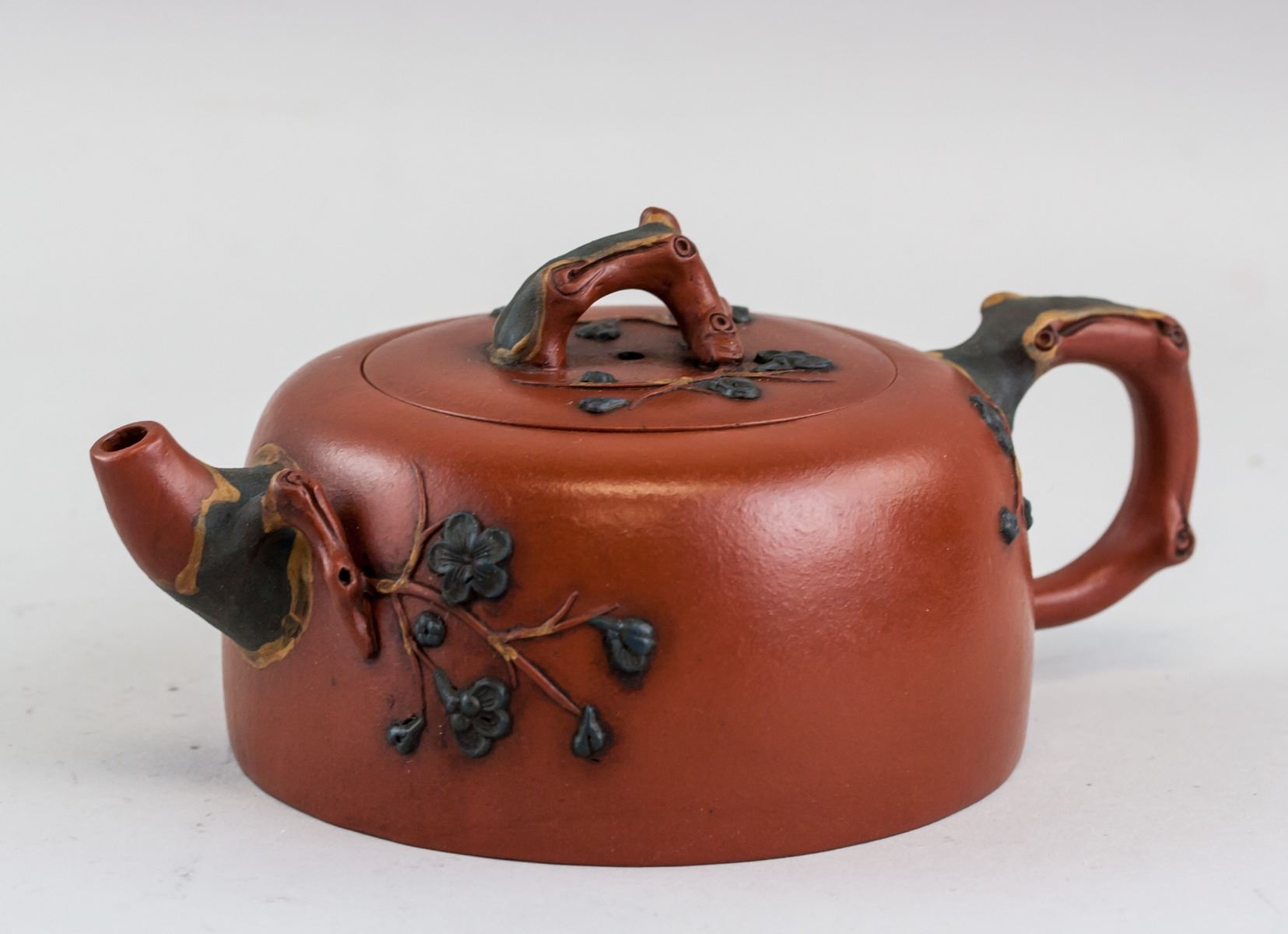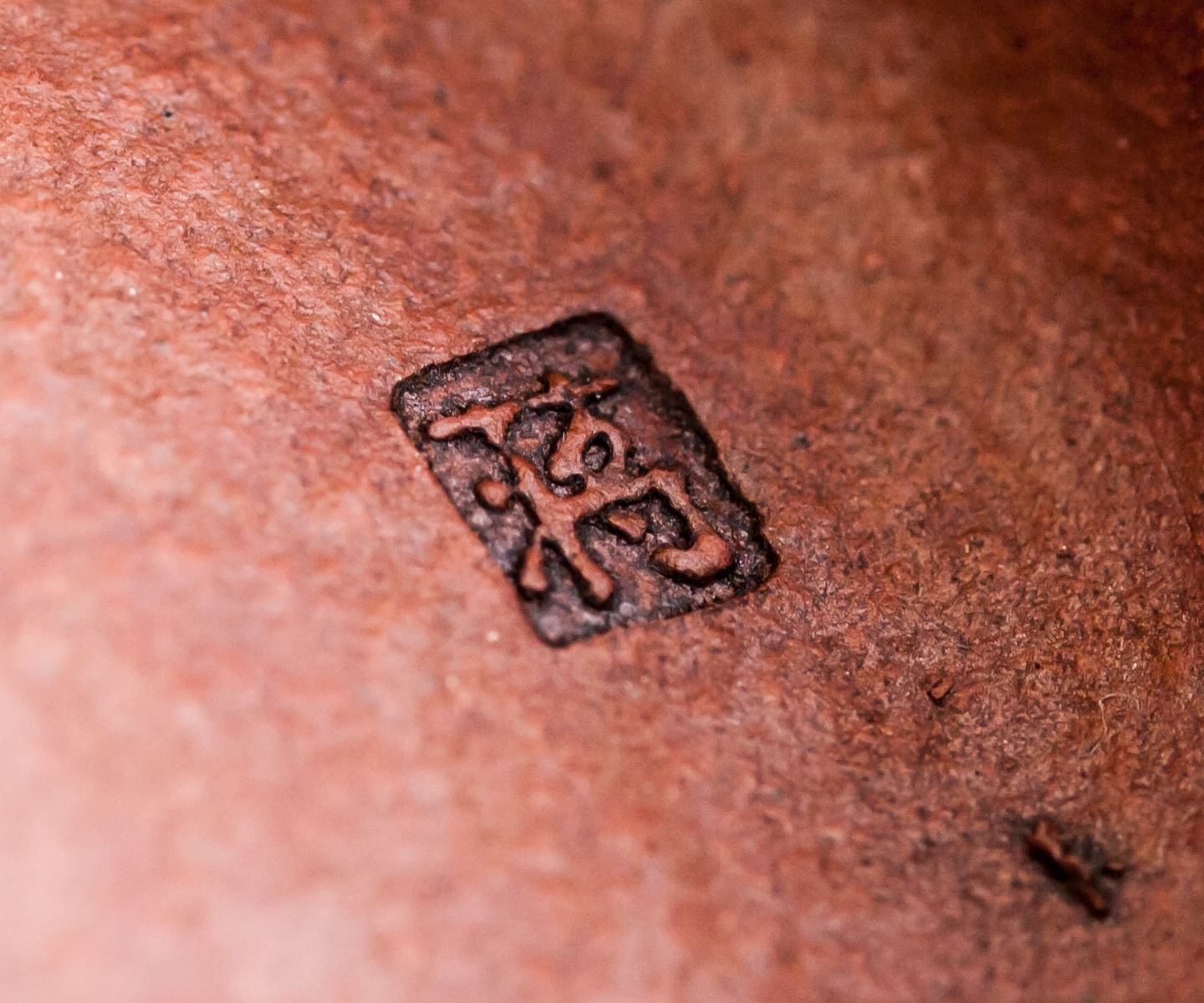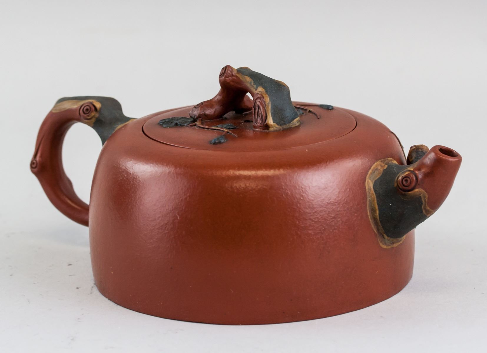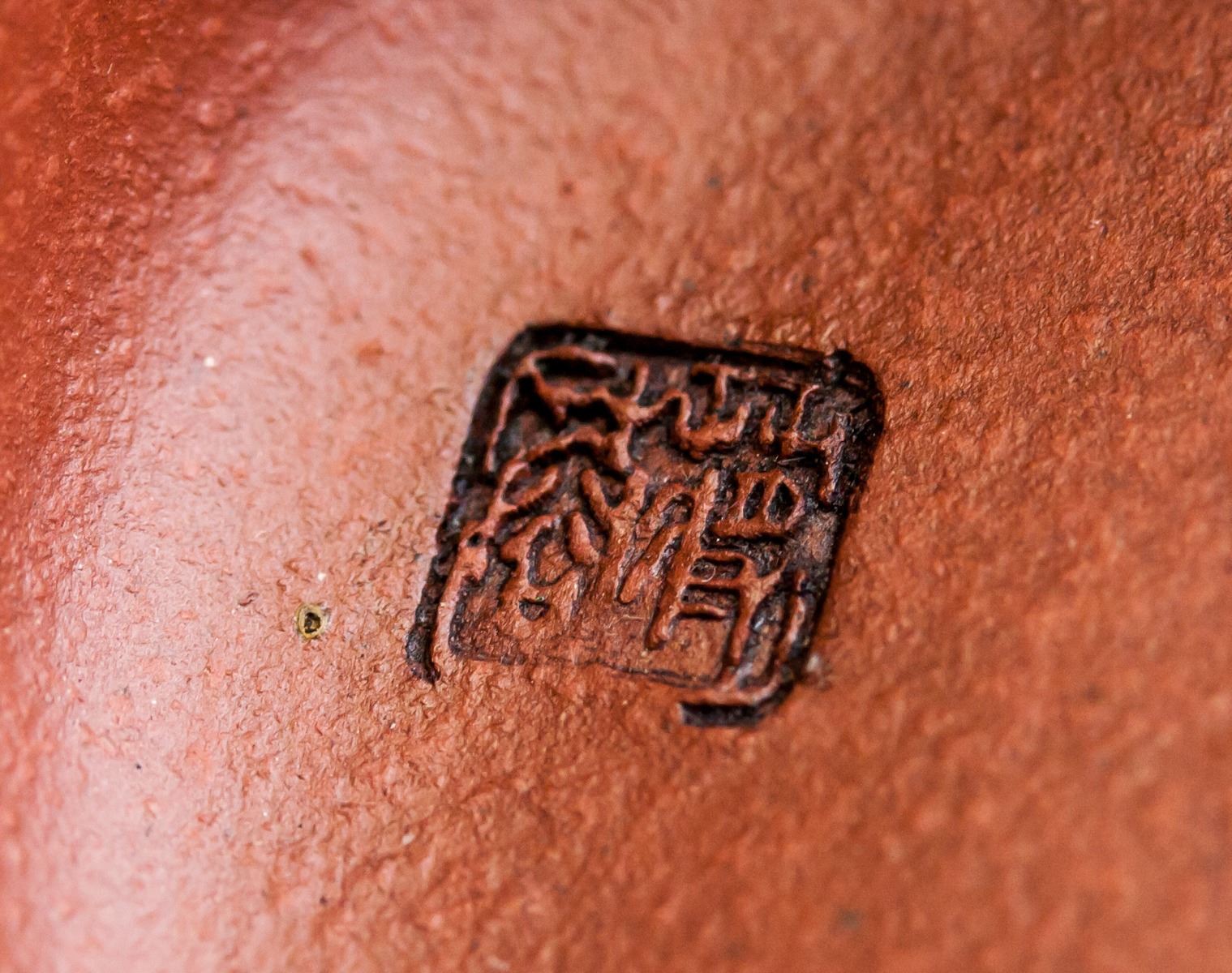 Chinese Zisha teapot. Of round form body with flatten base. Flanked with trunk form spout and handle. With Jiang Rong (1919-2008, Chinese) marks. 8 x 17 cm, 414 grams
