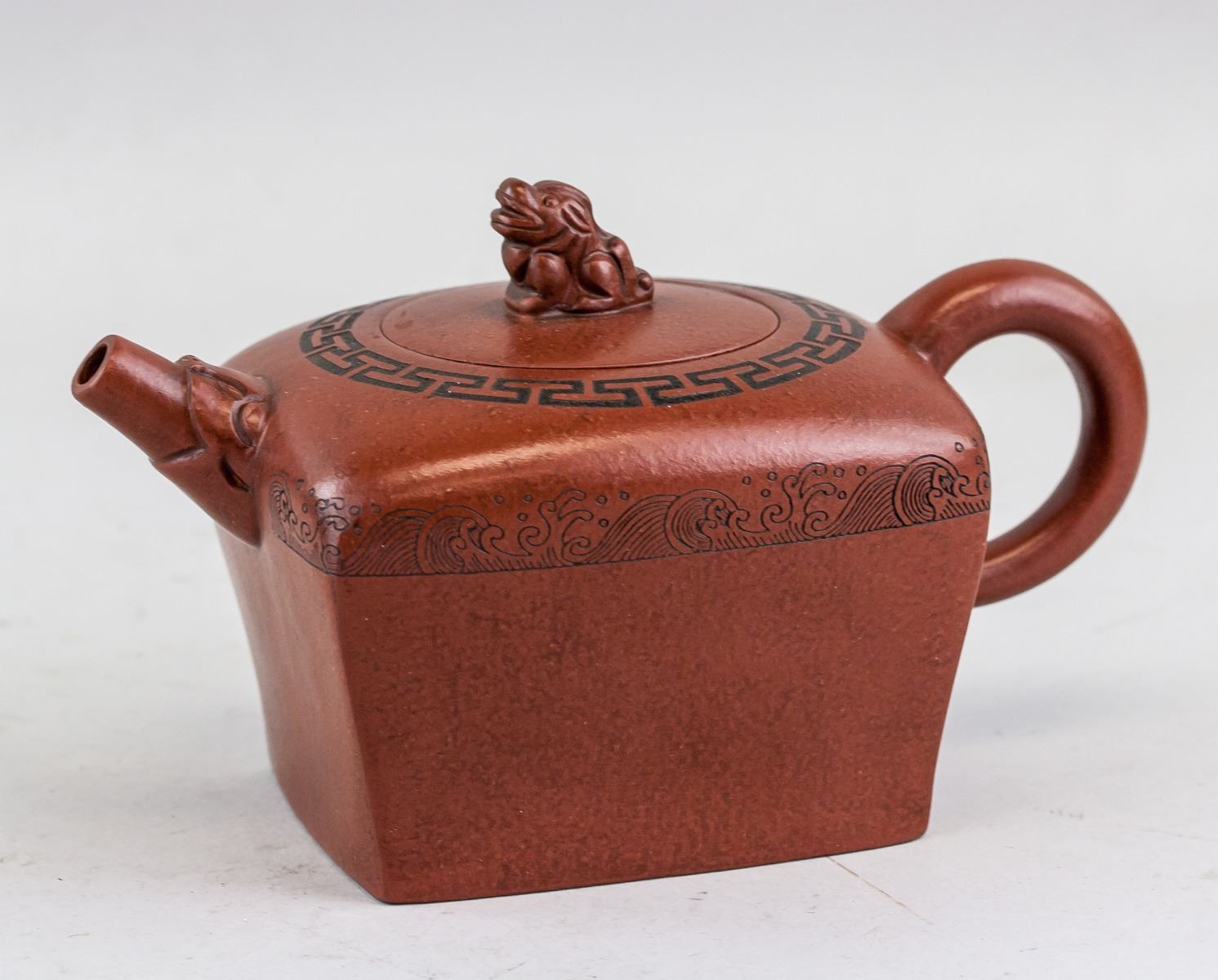 Chinese fine Zisha teapot. Of square form body with round top. Flanked with curved handle and beast form spout. Carved with wavy pattern. With Shao Daheng (Qing Daouang to Xianfeng era, Chinese) marks. 11 x 17 cm, 309 grams