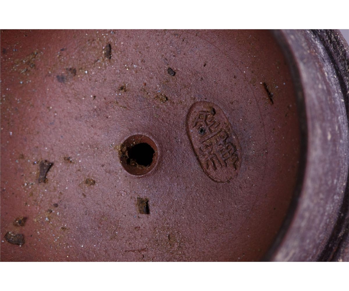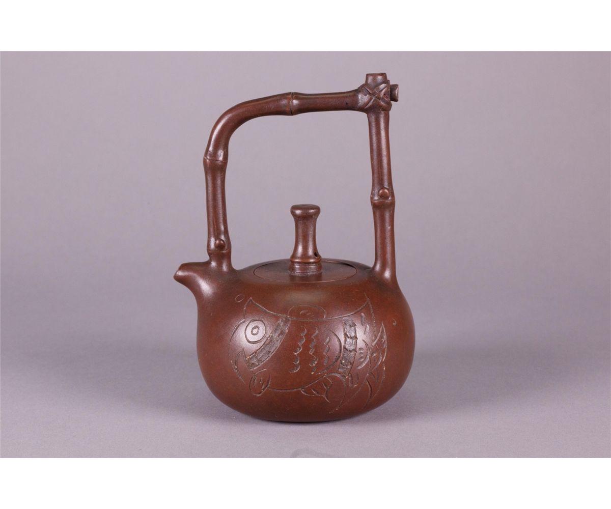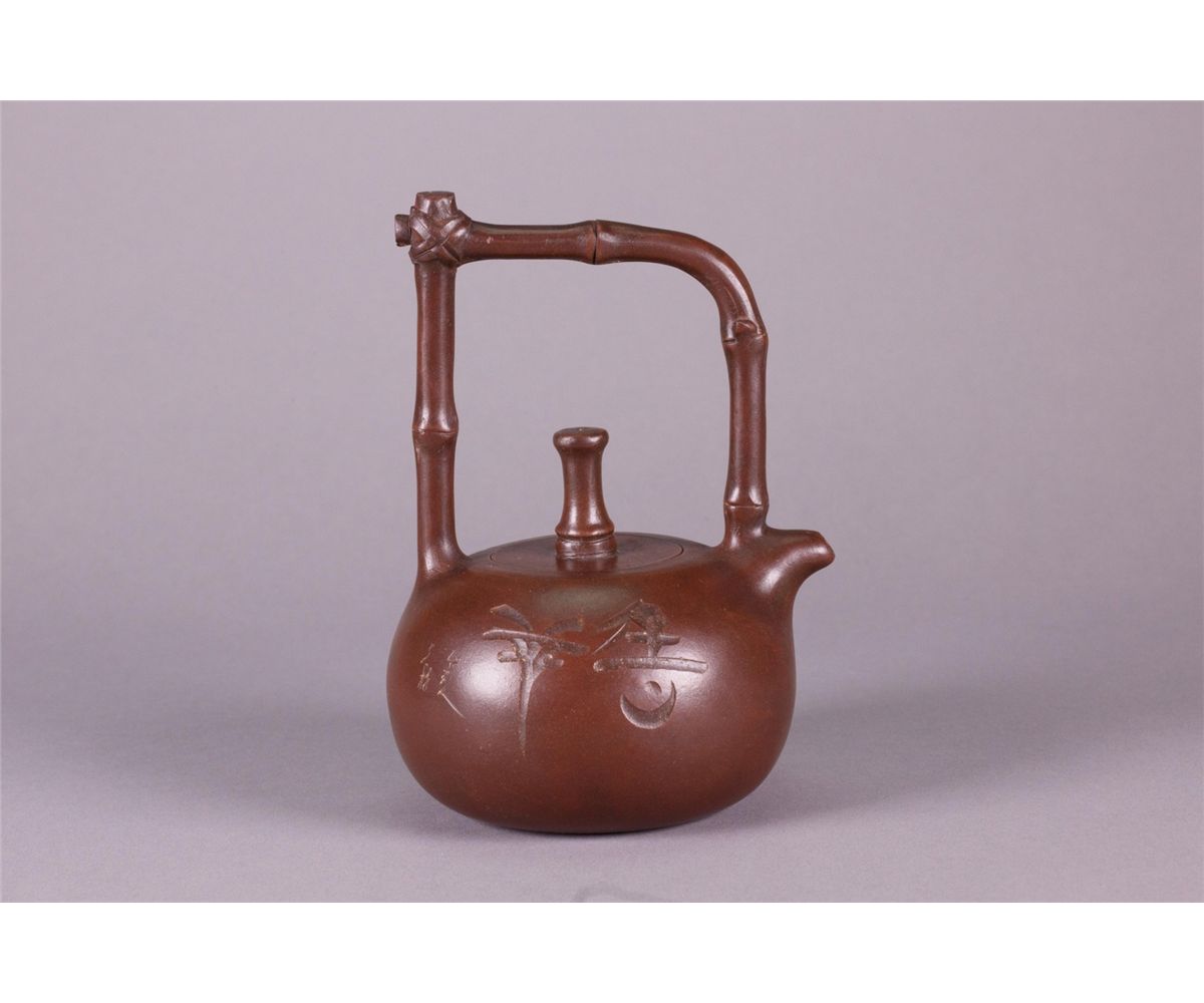 Chinese fine Zisha teapot; of globular body with bamboo form handle; featuring Chinese calligraphy carvings on body; H: 18 cm, D: 11 cm, 274 grams