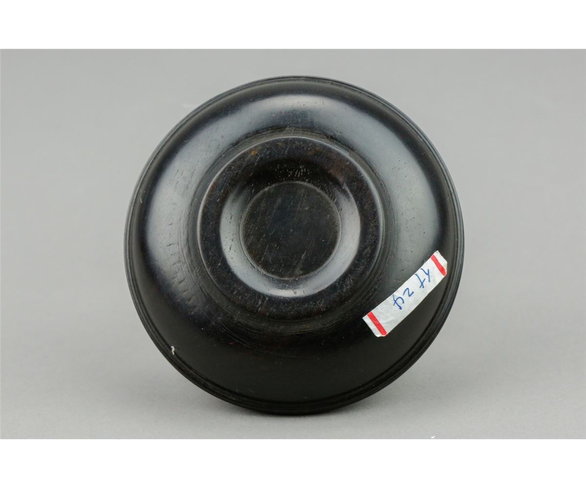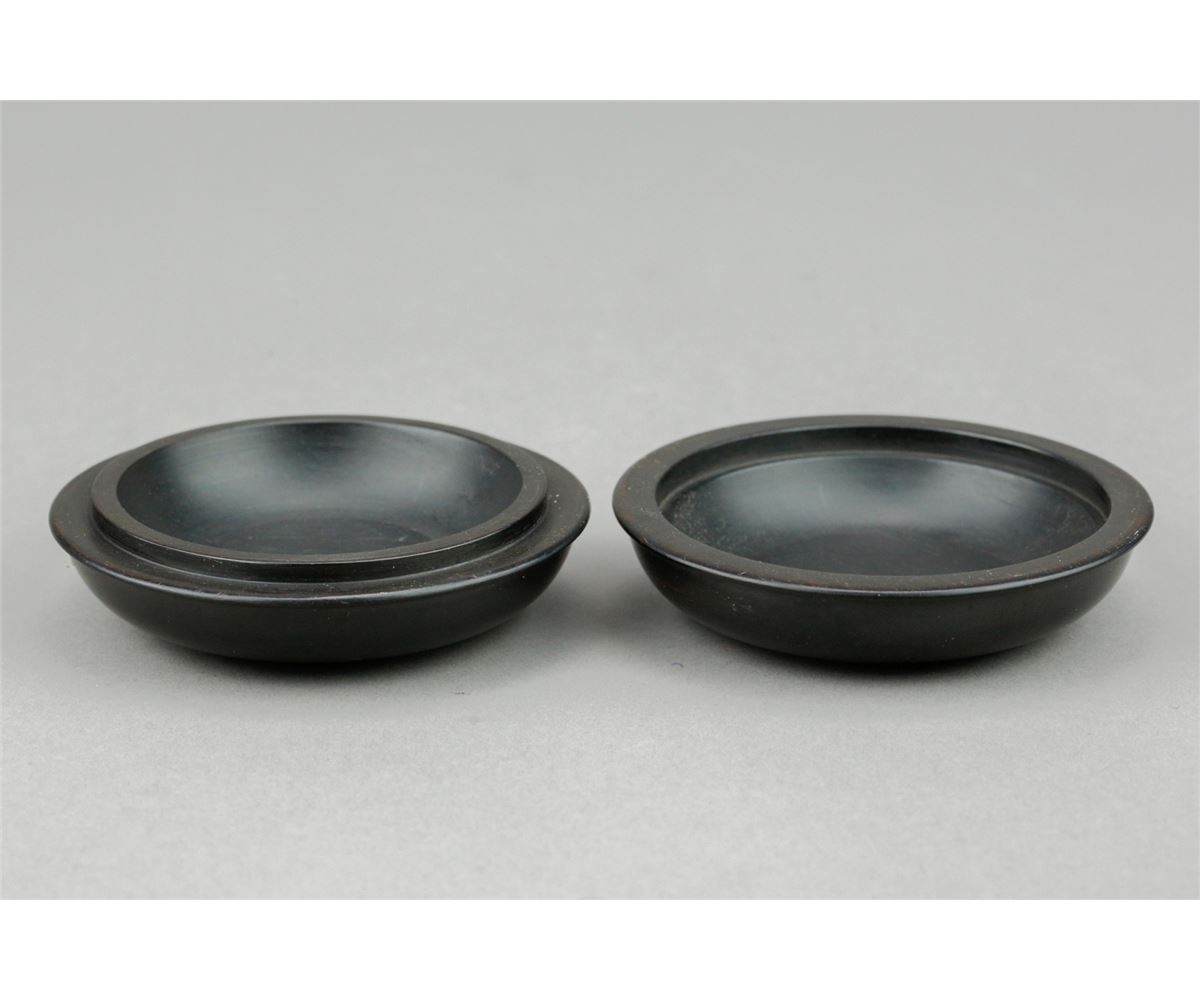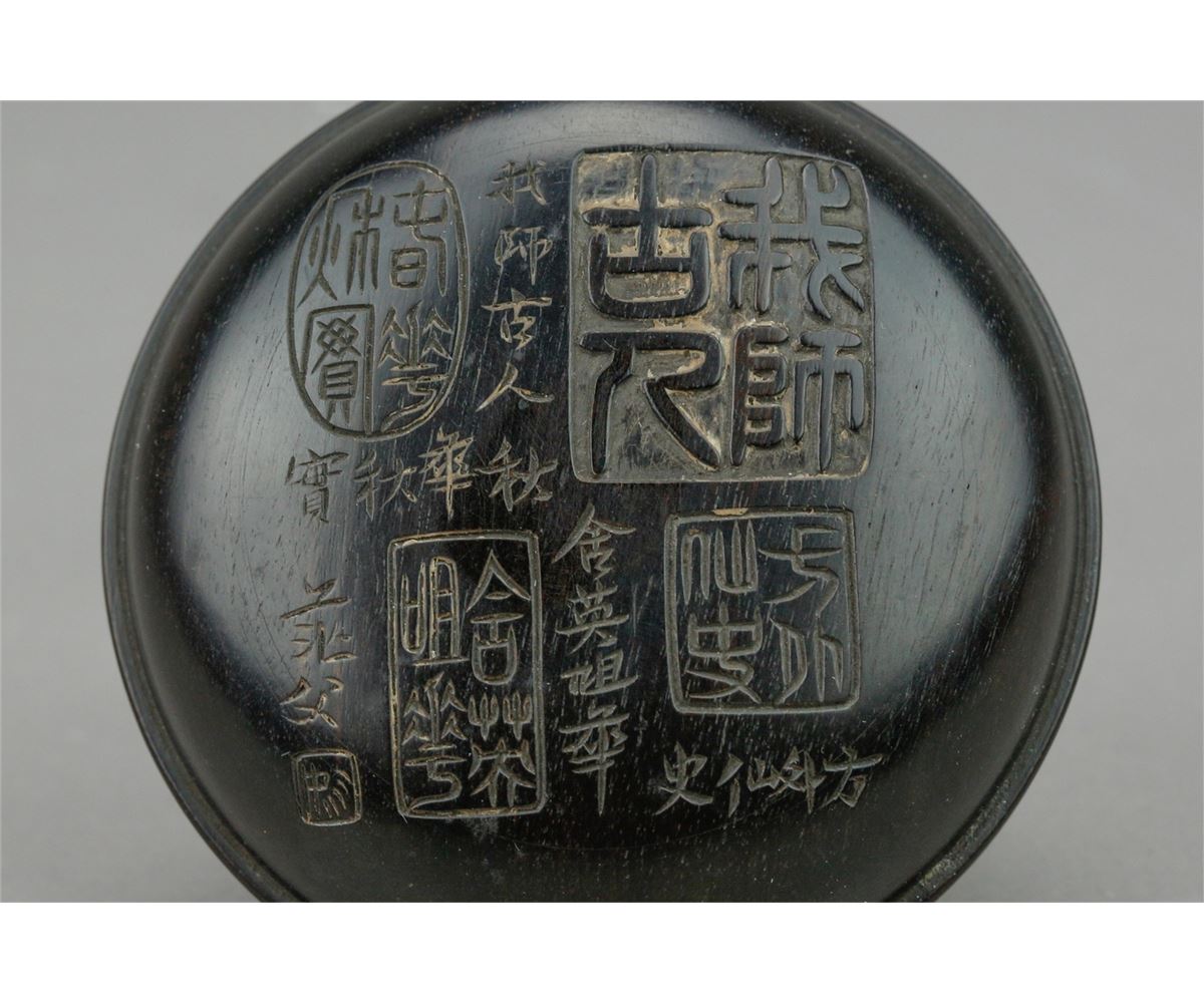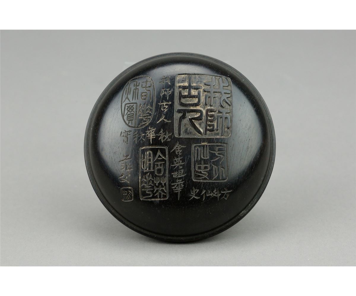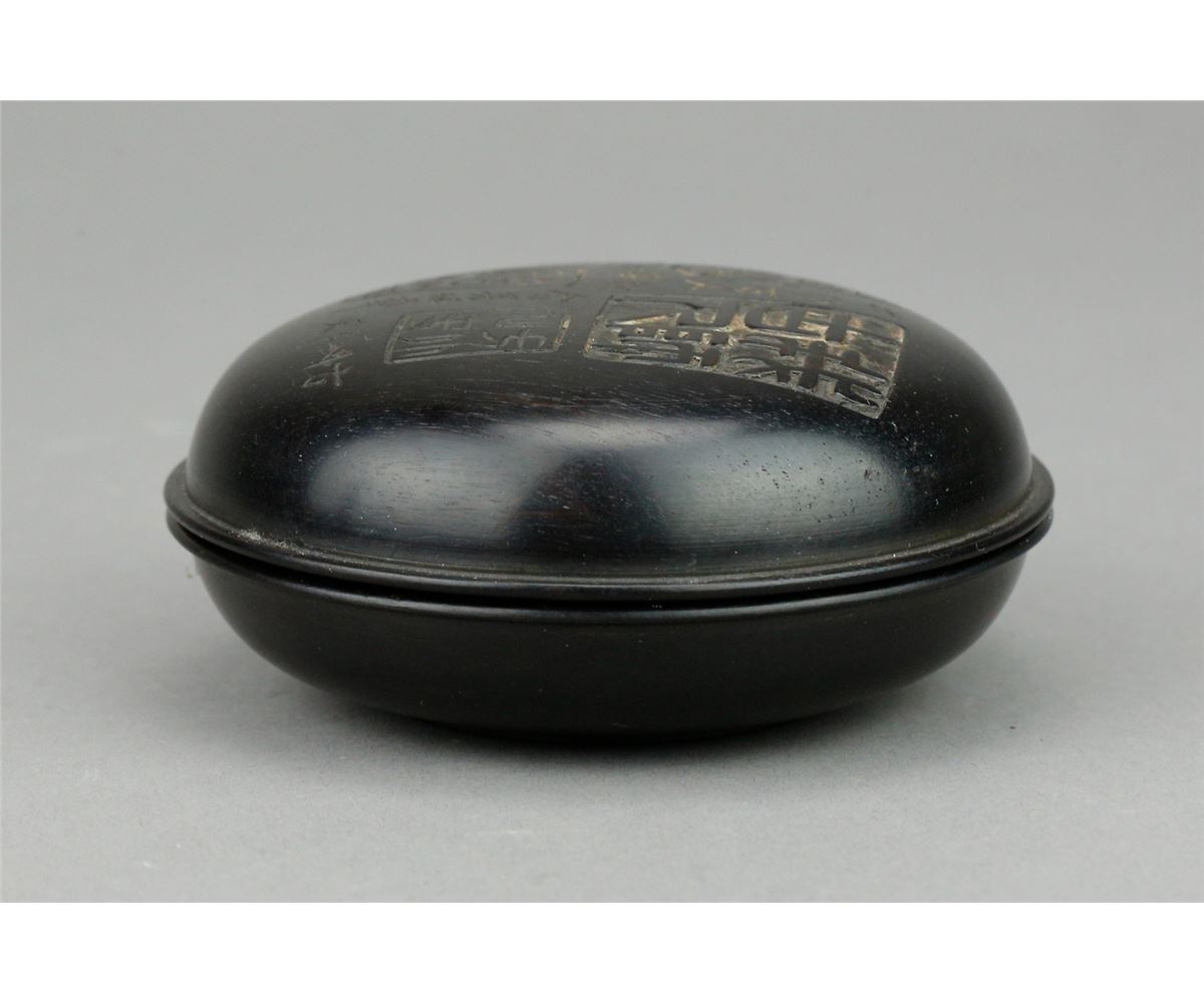 Chinese fine Zitan cosmetic box; of circular form; featuring carvings of various script calligraphy on removable cover; H: 3 cm, D: 8 cm, 108 grams