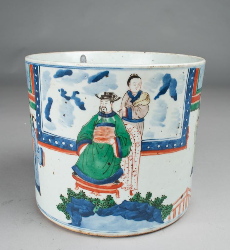 Depicting figures presenting gifts to an emperor, unsigned 7"H X 8"D, interior with staining some glaze anomoles, private collection West Bloomfield, MI.