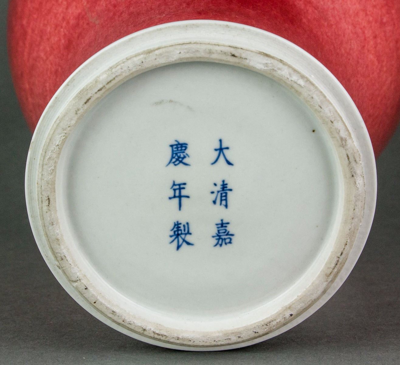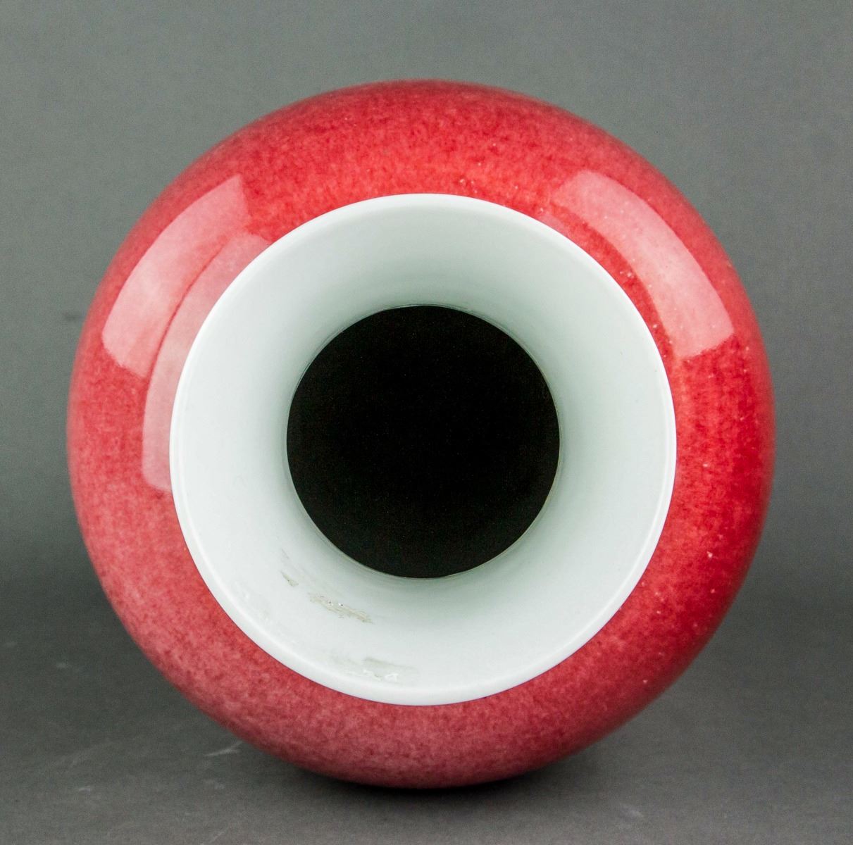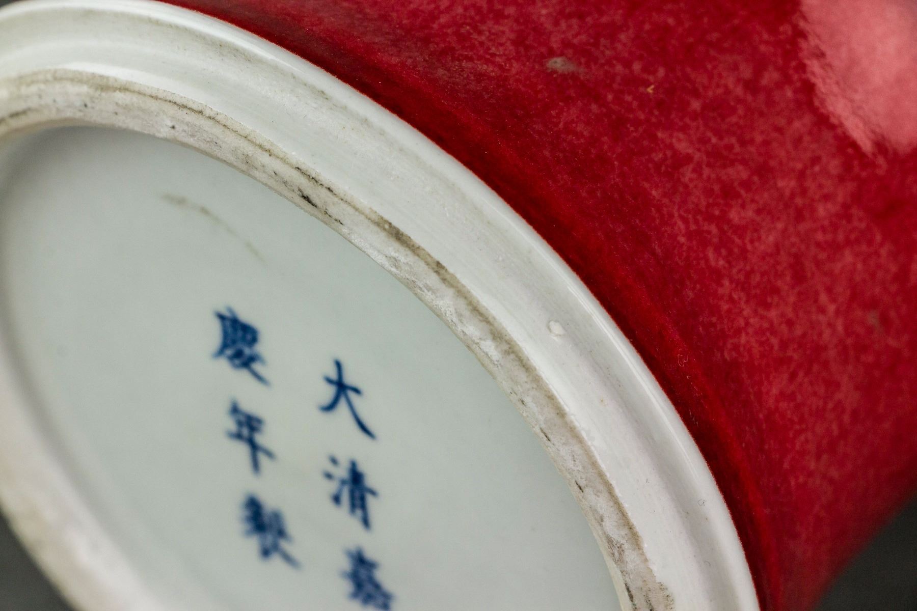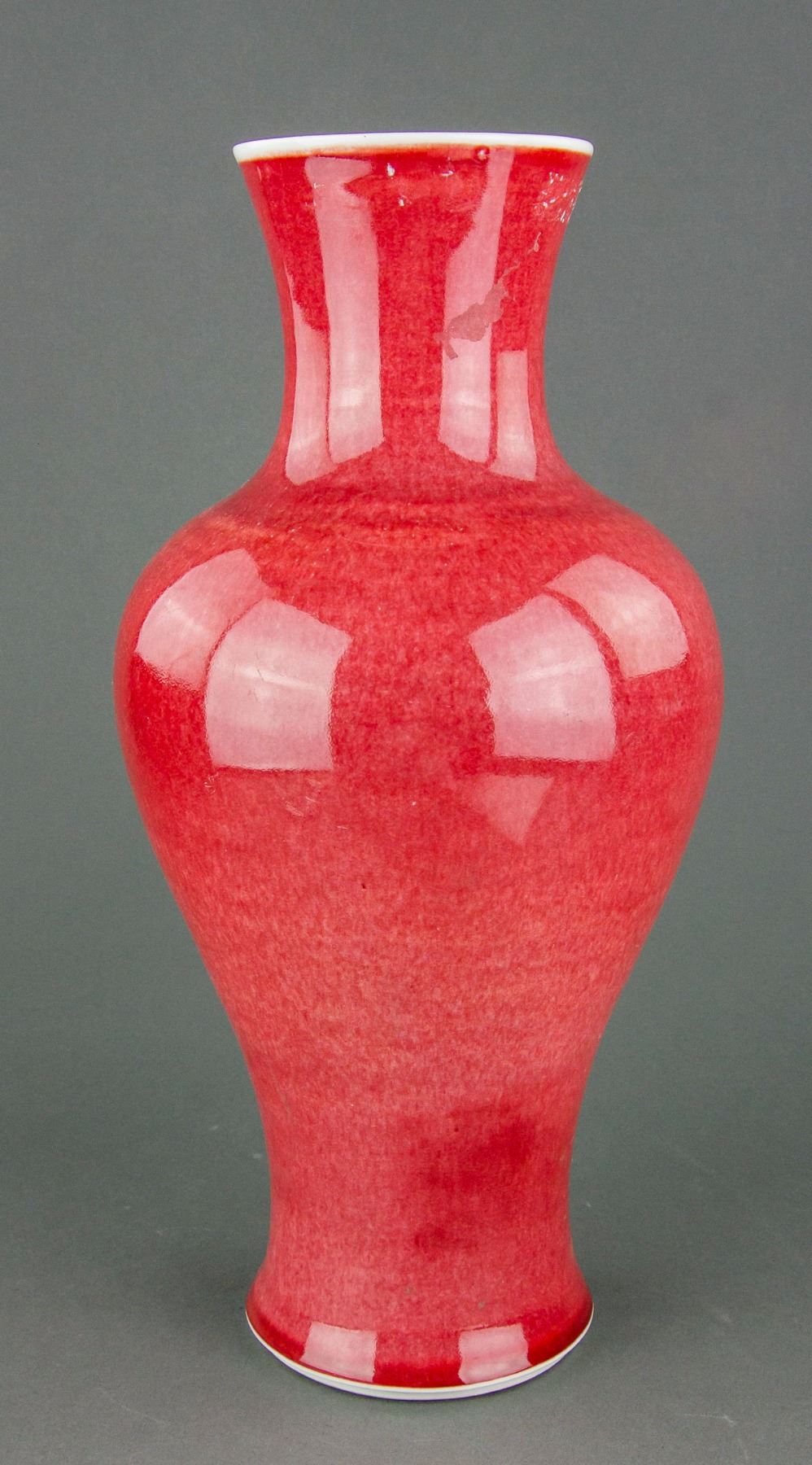 Chinese flambe glaze porcelain vase; of baluster form body; with narrowed neck and slightly splayed mouth and foot rims; covered with red flambe glaze; six-character Jiaqing mark on base; H: 37 cm, D: 17 cm, 2523 grams