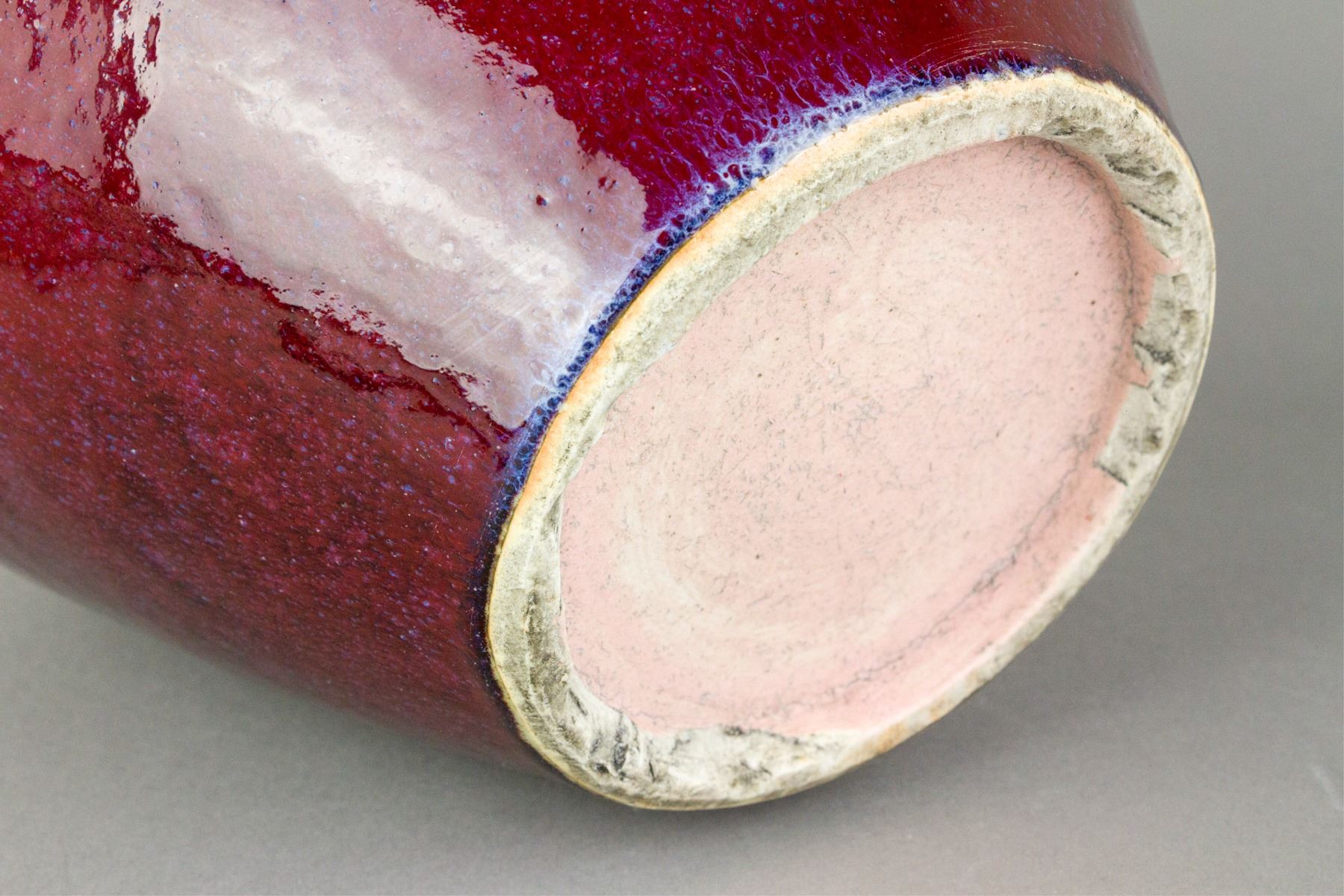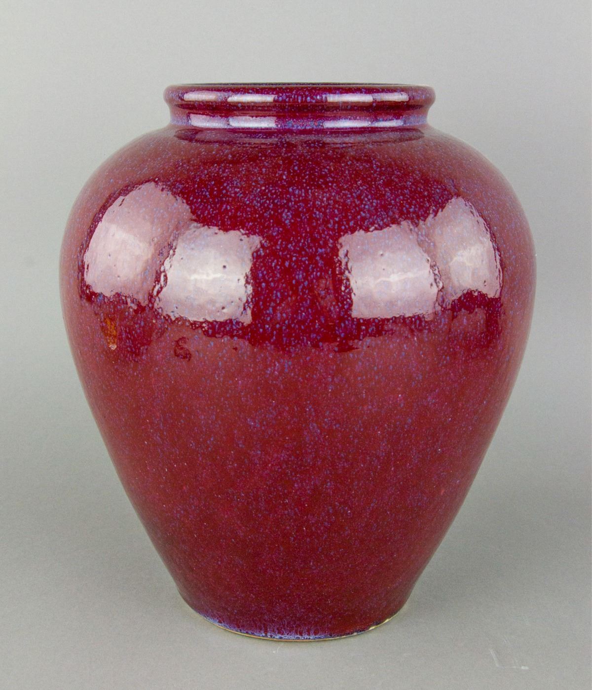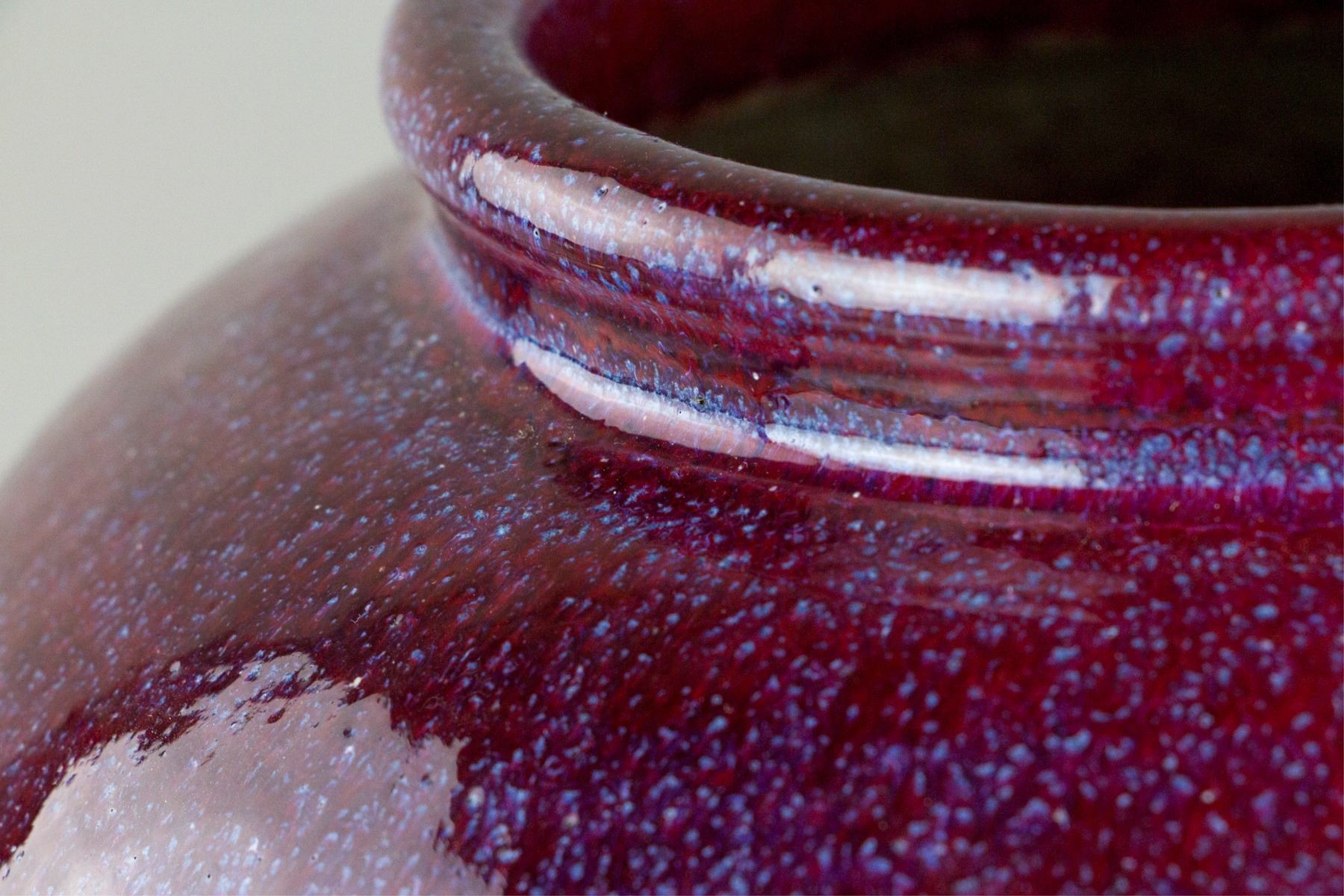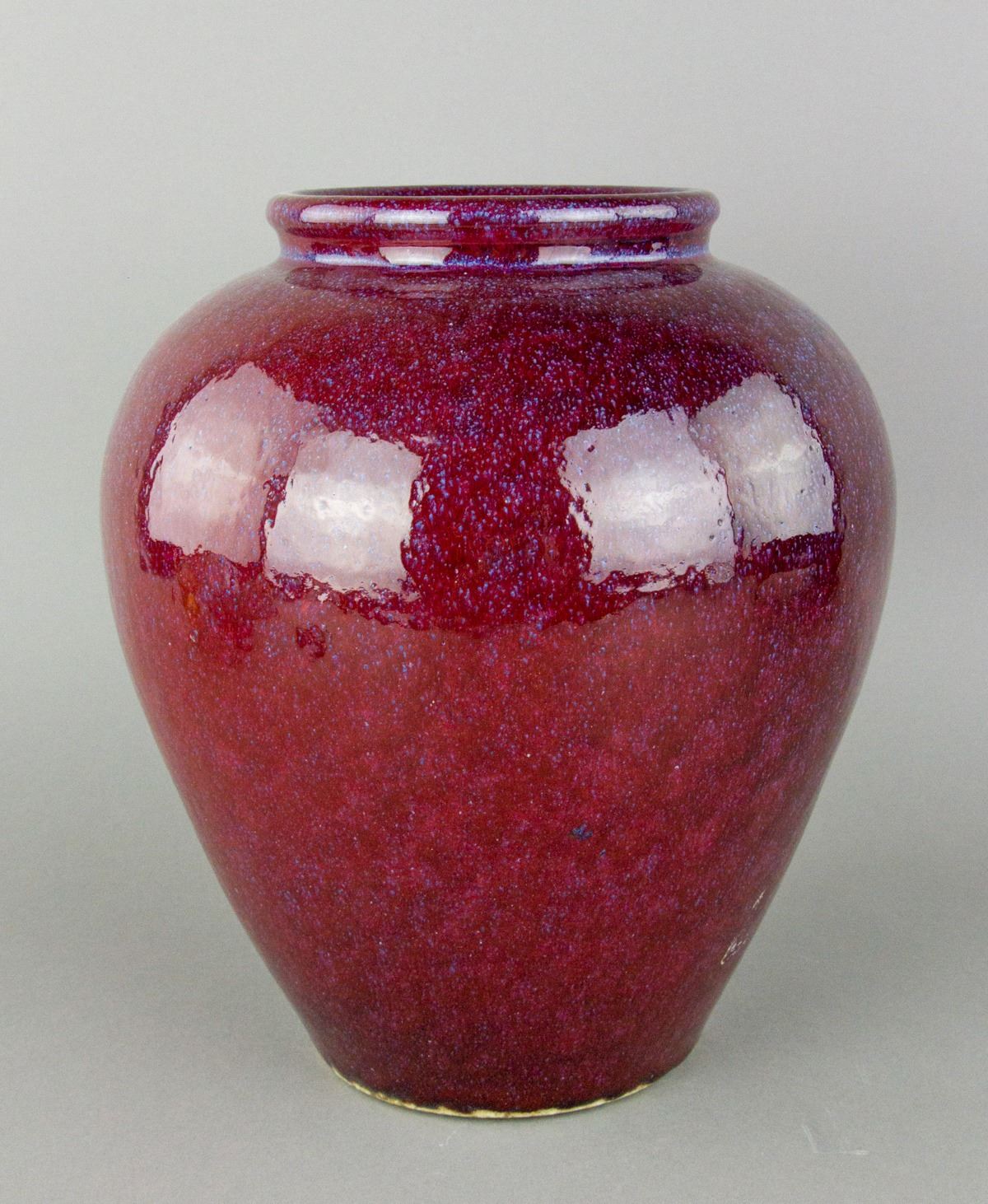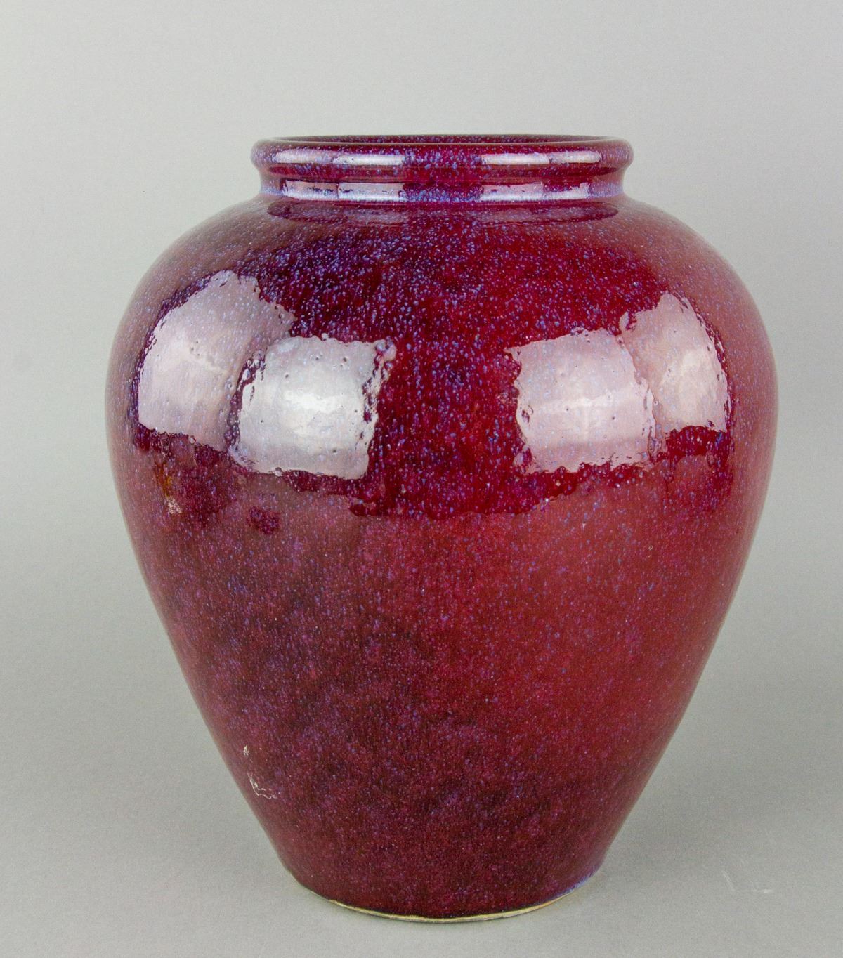 Chinese flambe glazed porcelain jar. Ovoid body with slightly curved rim. Applied with crimson and lavender glaze on body. 18th to 19th century or later. H: 28 cm, D: 22 cm, 2779 grams