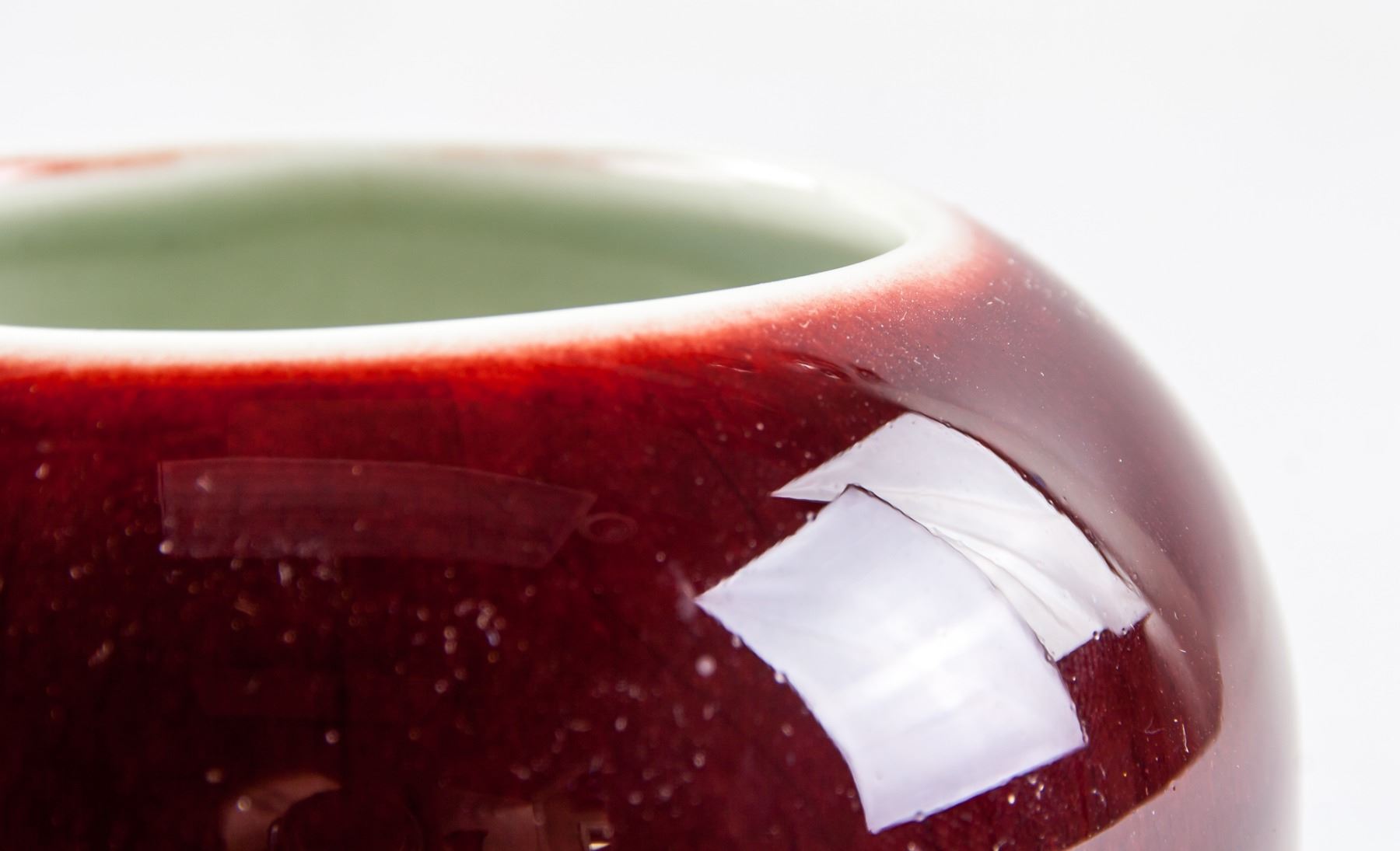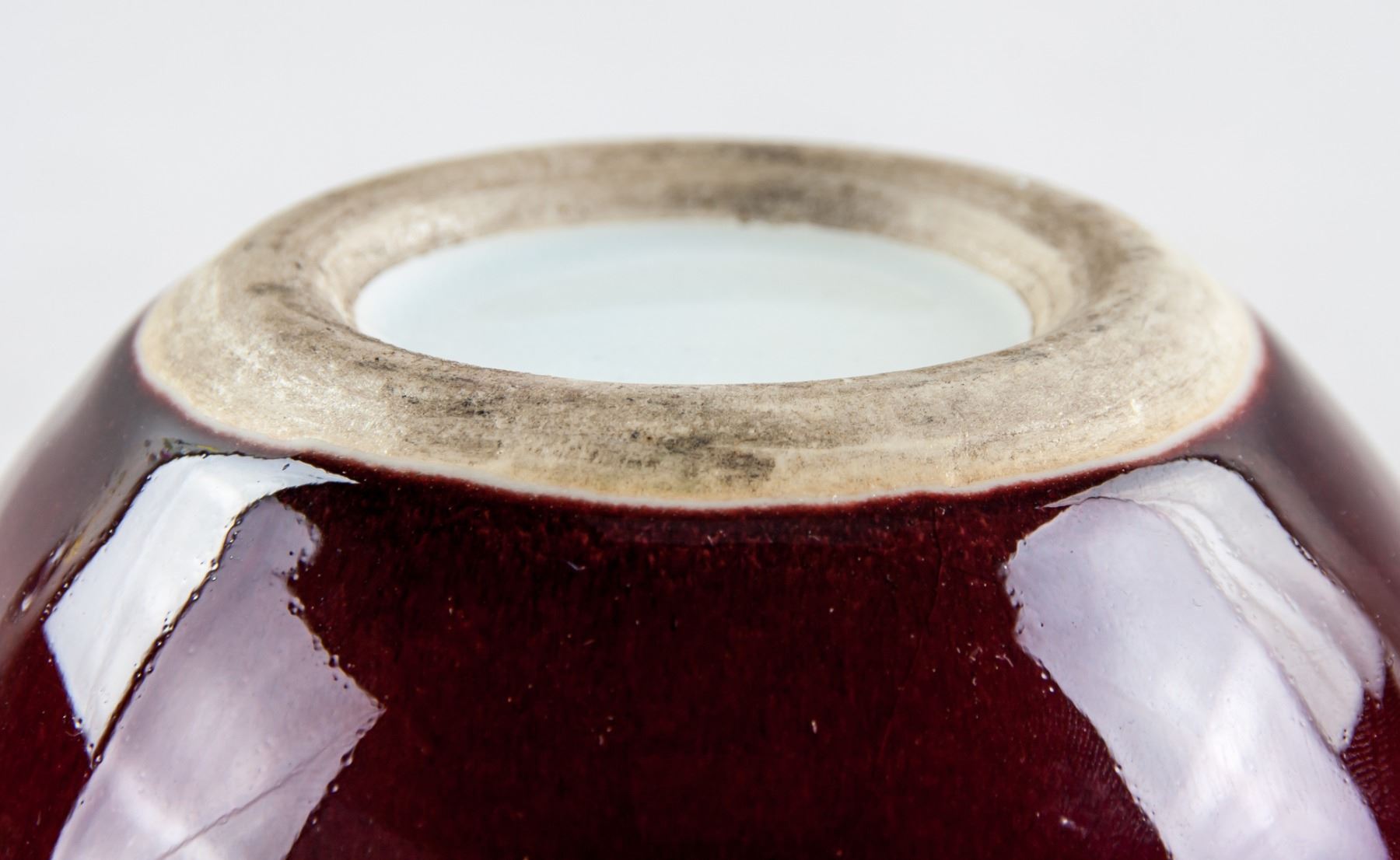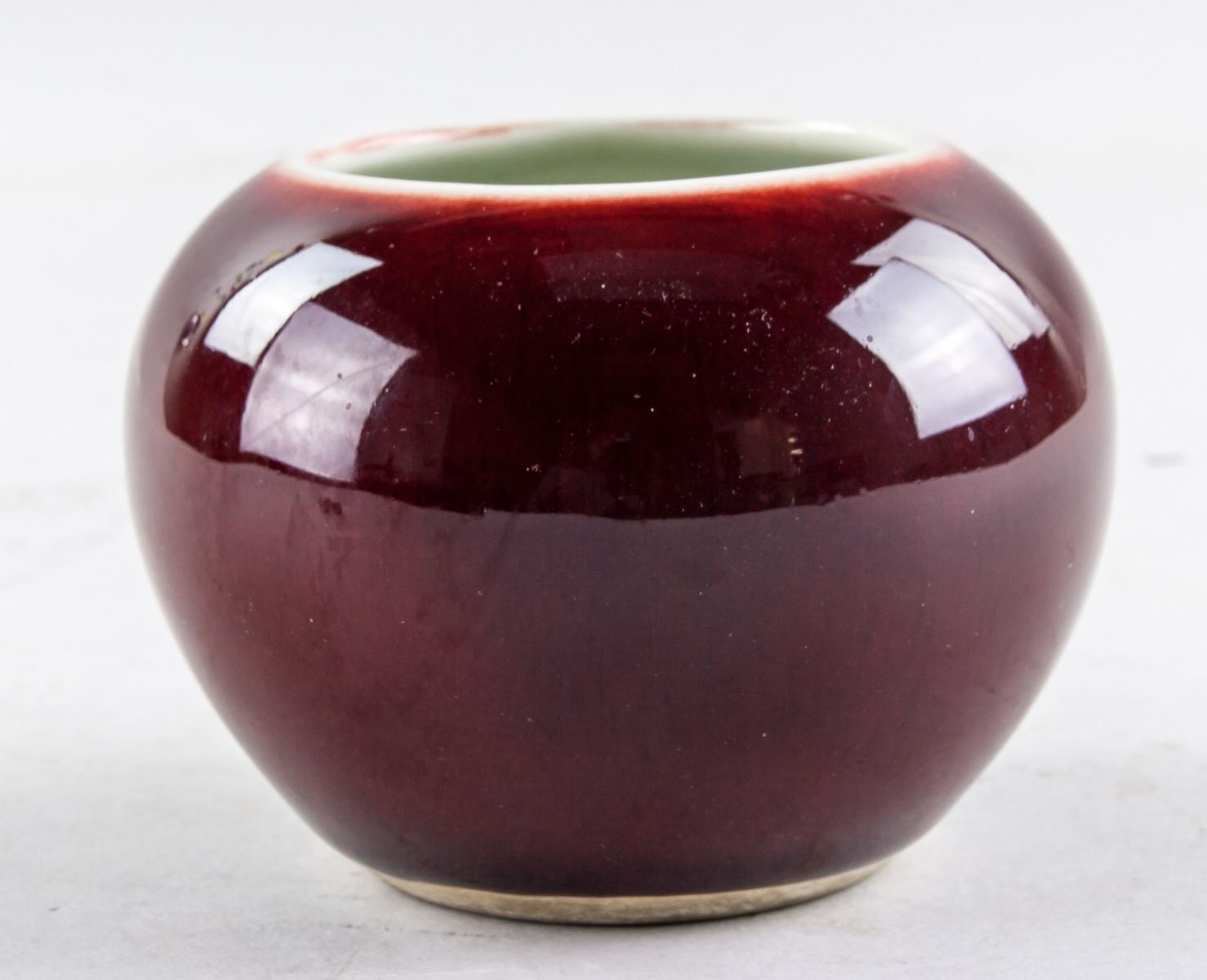 Chinese flambe glazed porcelain jar, of globular body, tapering to bottom. 7.5 x 10 cm, 291 grams