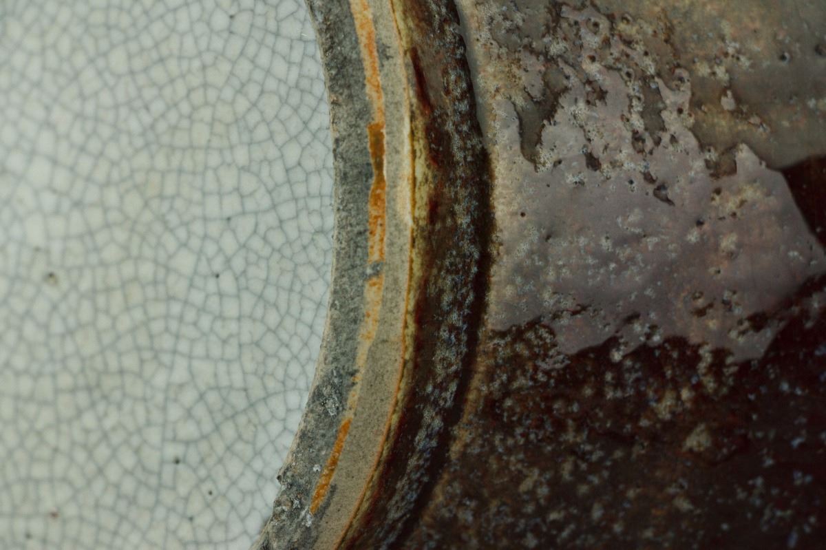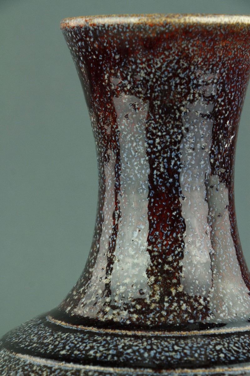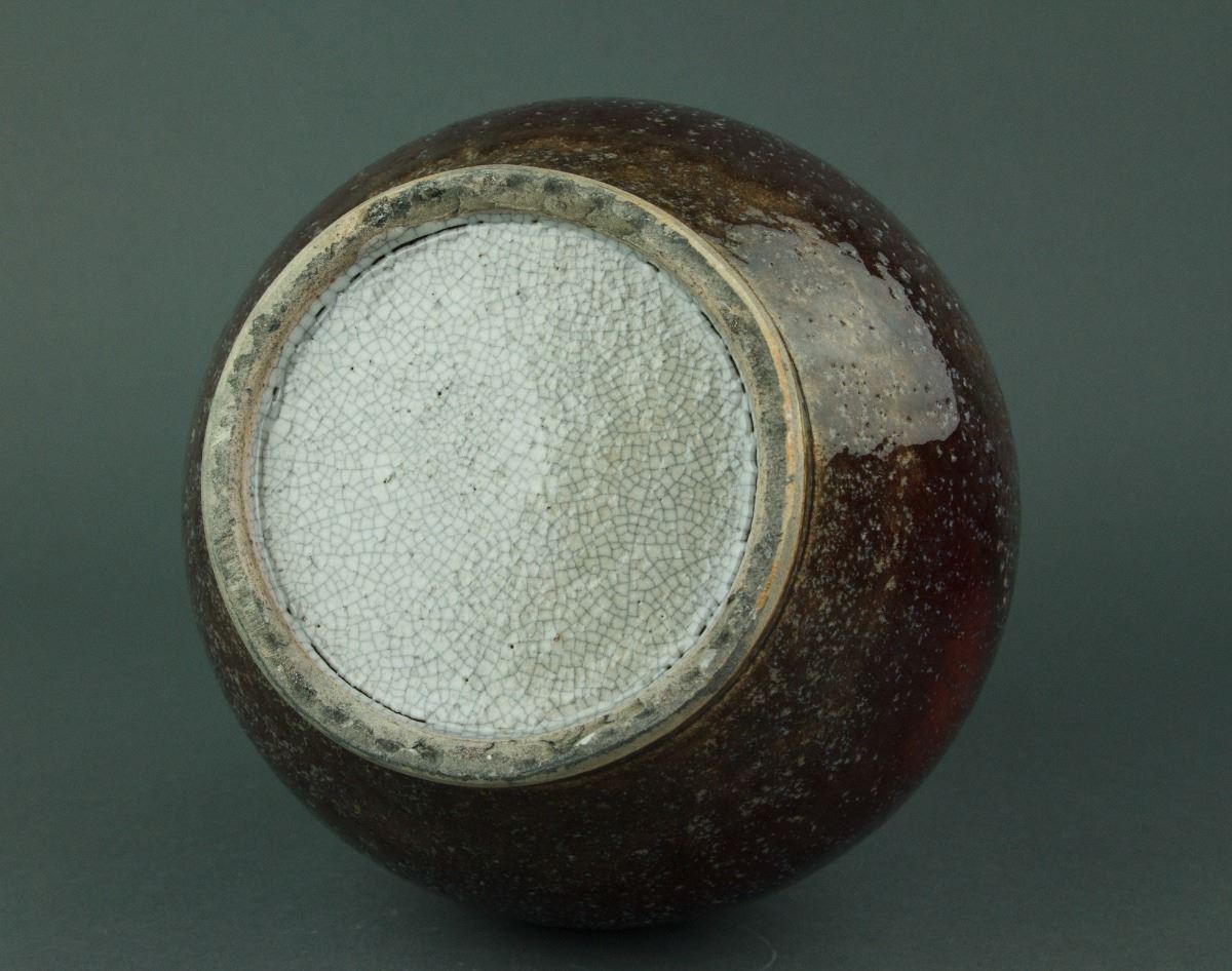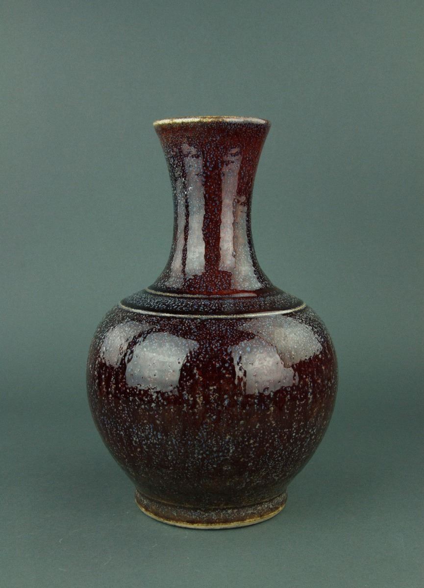 Chinese flambe porcelain vase; of globular body connecting to a waisted neck; the base covered in crackle white glaze; H: 35 cm, W: 22 cm, 3252 grams