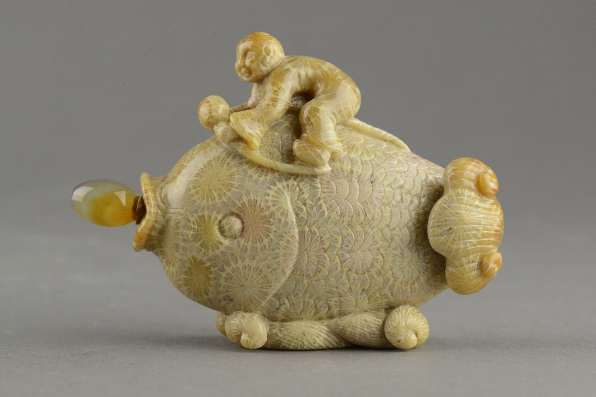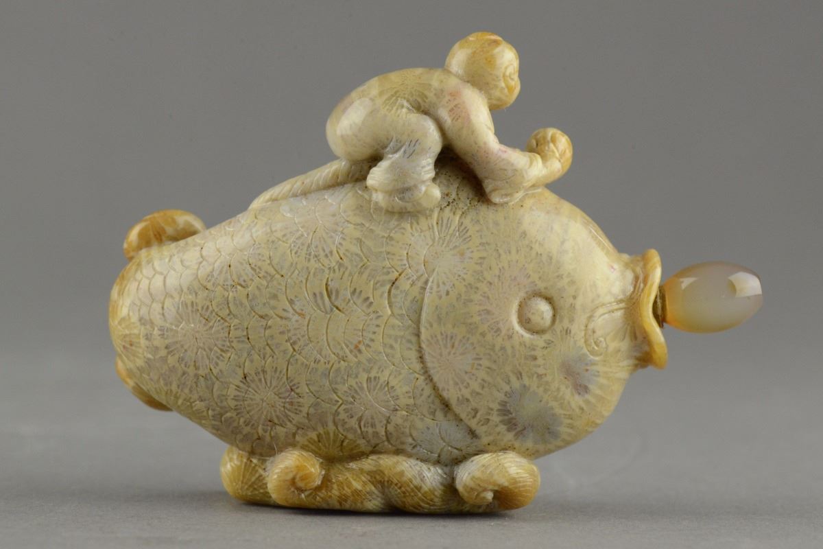Of fish form, the fossilized stone carved snuff bottle is flanked with stylized sea waves with a happy boy riding on top; H: 10 cm, W: 6 cm, 134 grams; Provenance: T. Ng Collection, Toronto