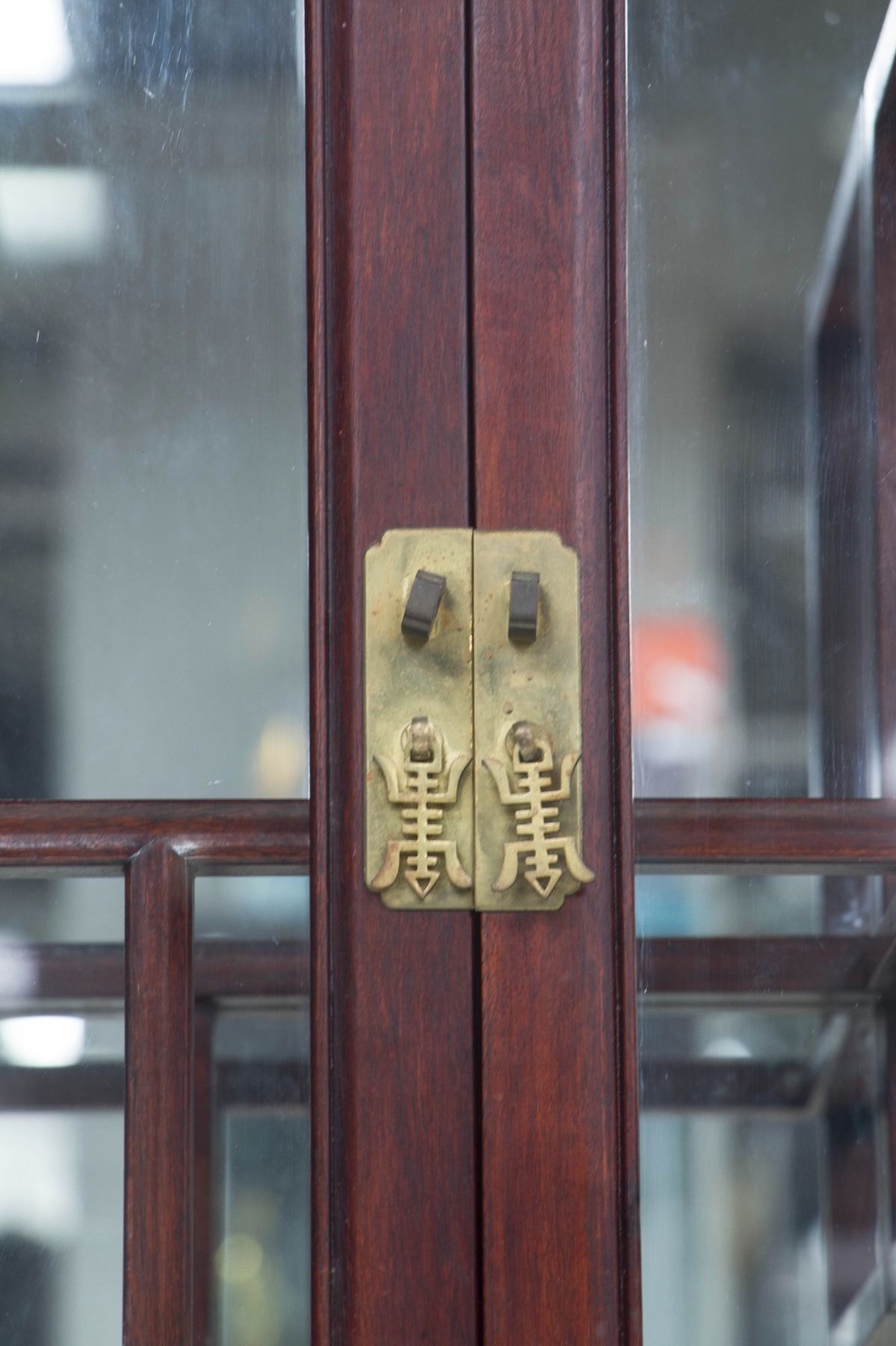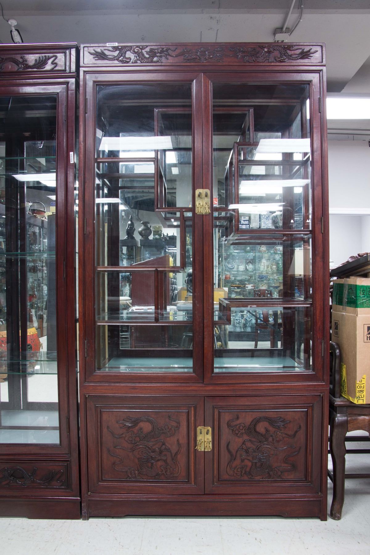 Chinese wood curio cabinet; with four doors and brass hardware; with varied size shelves inside; with inner lighting; decorated with low relief dragon carving; 96 cm x 102 cm x 36 cm