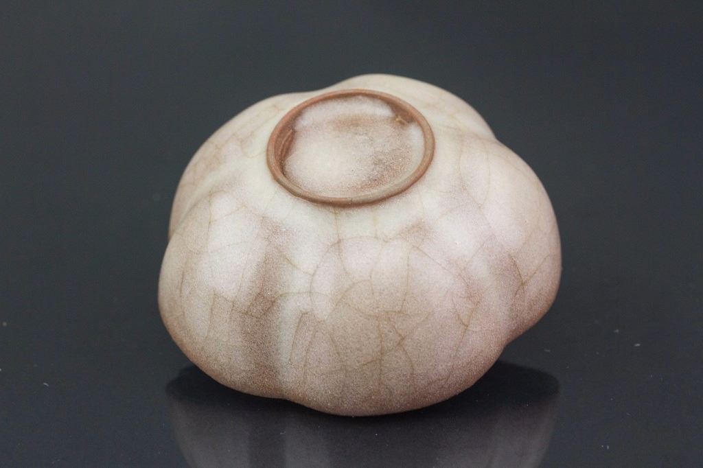 Chinese Ge style lobed porcelain bowl; of lobed round body; tapering to the bottom; supported on short foot rim; covered crackle glaze; H: 3 cm, D: 8 cm, 77 grams