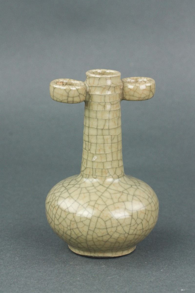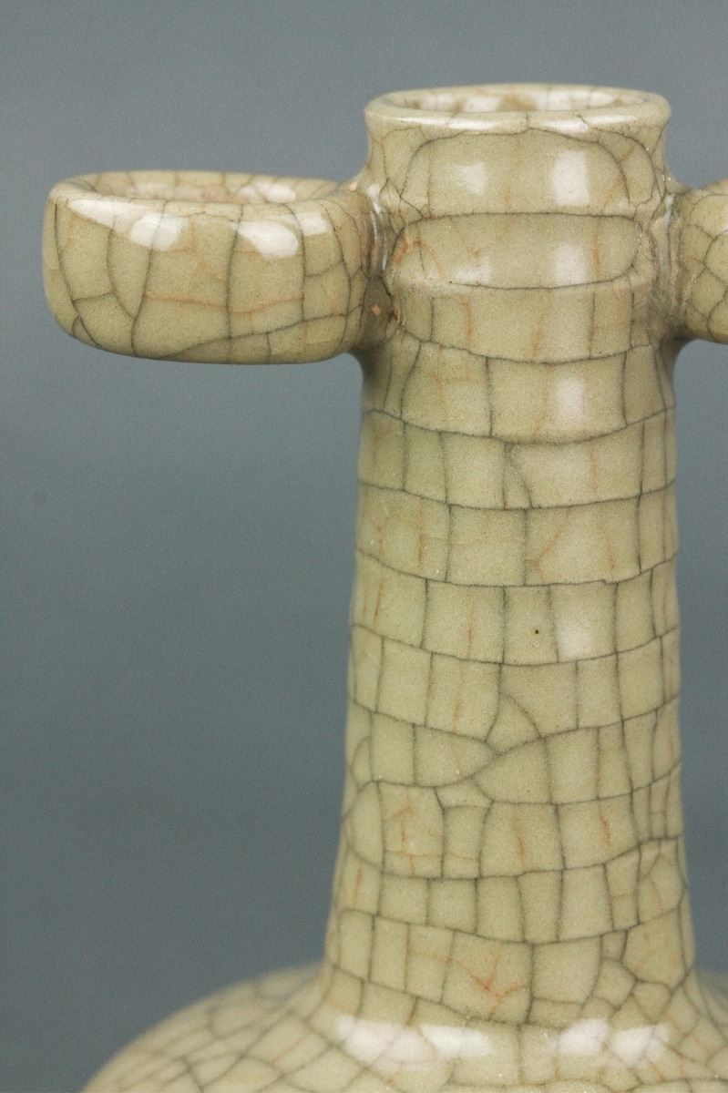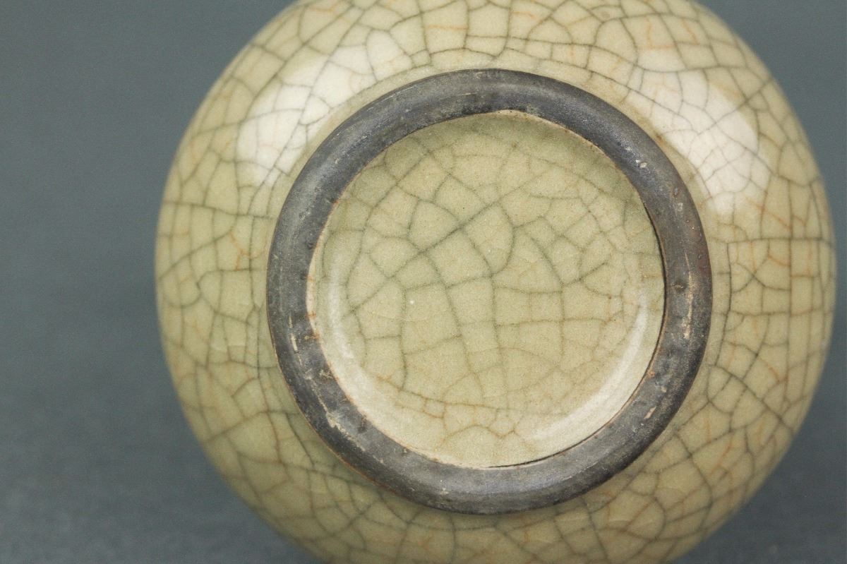 Chinese porcelain vase; Geyao style; of compressed globular body connecting to a filleted neck which is flanked by a pair of tubular lug handles; applied with crackled yellow glaze; H: 11 cm, D: 7 cm, 170 grams