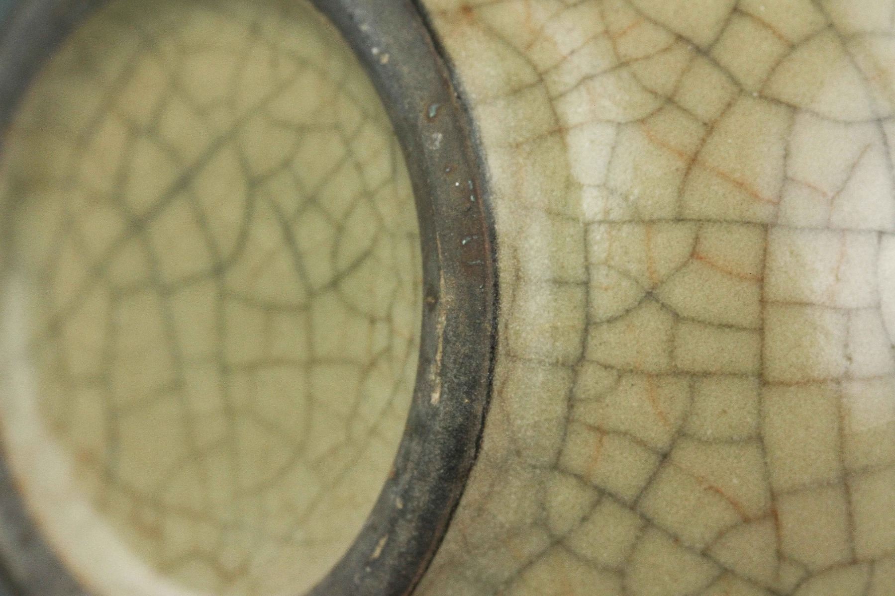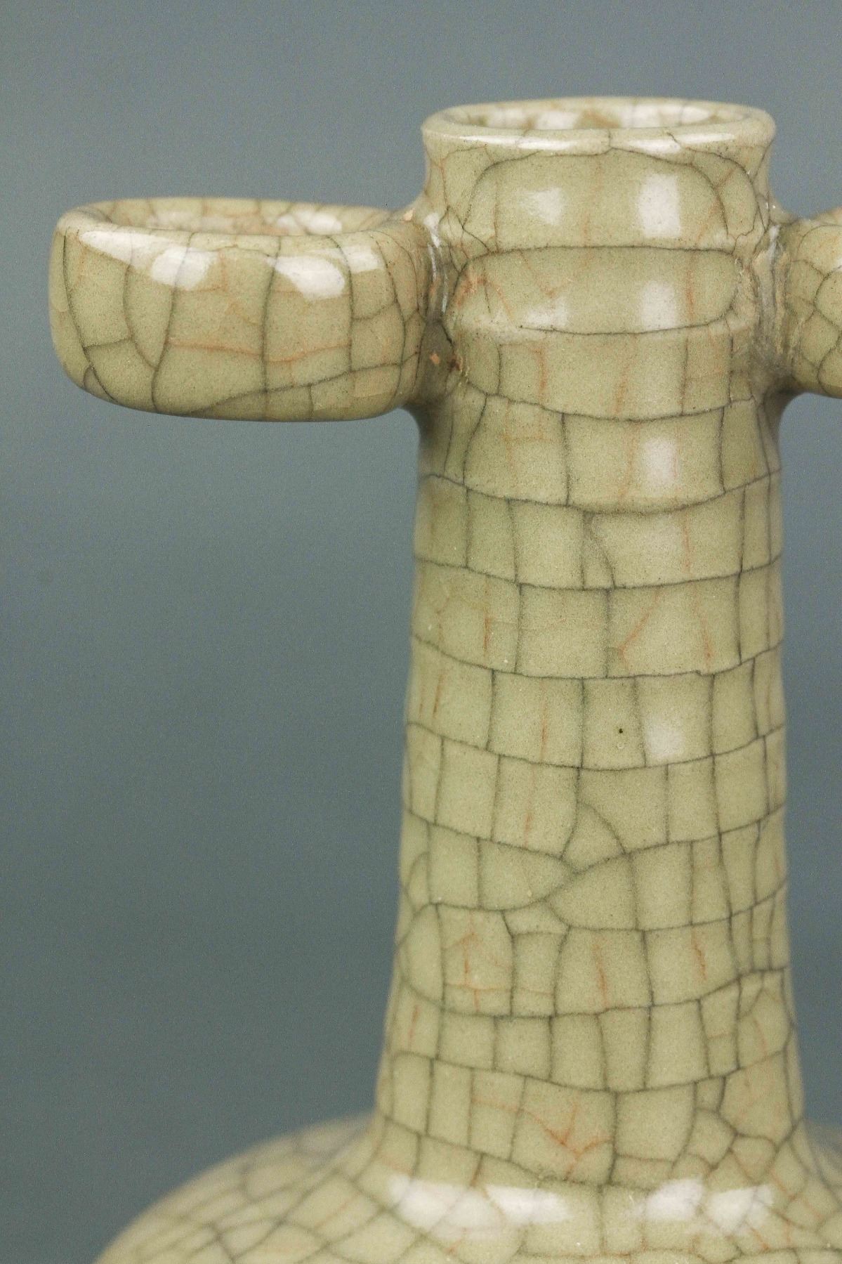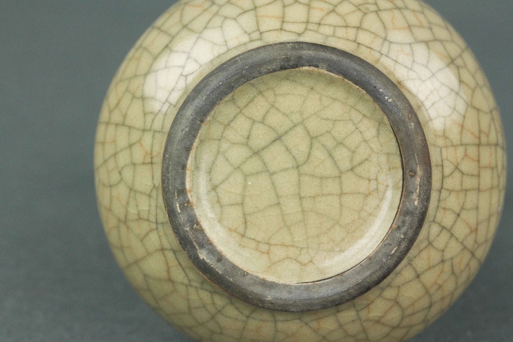 Chinese porcelain vase; Ge style; of compressed globular body connecting to a filleted neck which is flanked by a pair of tubular lug handles; applied with crackled yellow glaze; H: 11 cm, D: 7 cm, 170 grams. Ge kiln, Pinyin Ge yao, Wade-Giles romanization Ko yao, kiln known for the wares it produced during the early Song dynasty (960–1162), probably in the Zhejiang province in China. Scholars are uncertain of the kiln’s exact location. Legends recorded in documents of the Ming dynasty suggest that the kiln was named after the elder brother of the director of the Longquan kiln. Typical forms of Ge ware included tripods, fish-handle stoves, and five-foot stoves. The bodies of the wares varied from thick to thin and were usually black, but sometimes gray or yellow. Glazes often covered fine networks of cracks and were usually pale blue, moon-coloured white, gray, or greenish yellow. Extant pieces of Ge ware are spread throughout China and the world. PROVENANCE: Private collection, Circa 1980 (Nagoya, Japan)