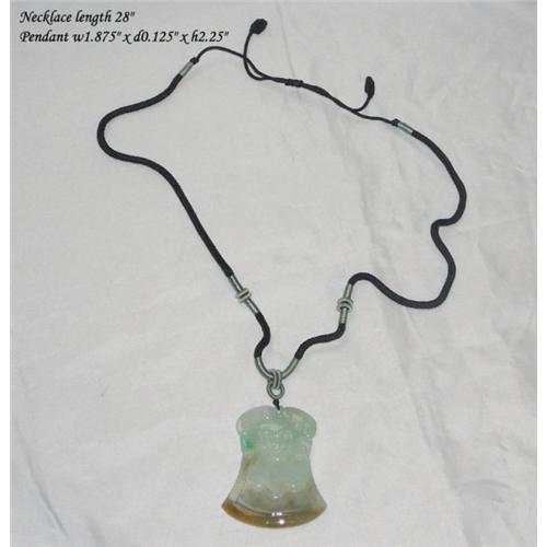 This pendant is in an axe shape with a precise carved motif of Fu-Dog head on each side. The value of the jade depends on the color, the texture and the base of the stone. This piece has a combination of three colors green , yellow and white, the texture is smooth and clear and the base has enough water to create a shinning and watery outlook.